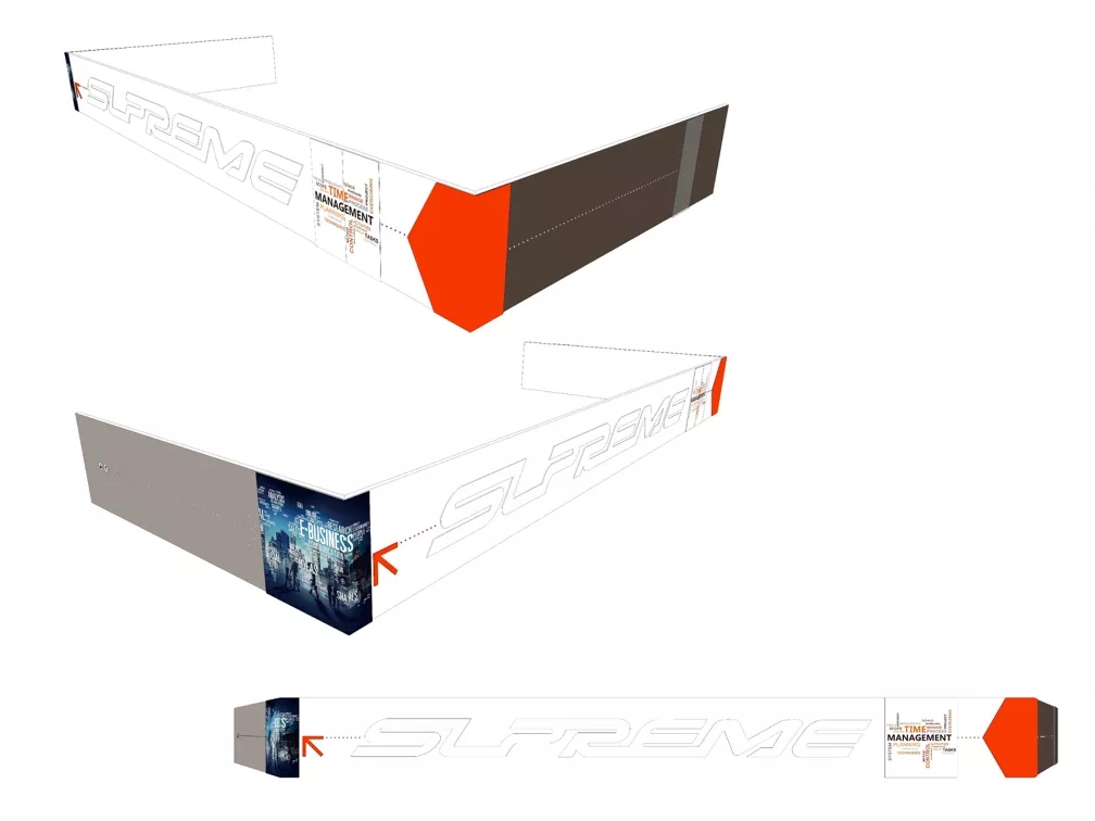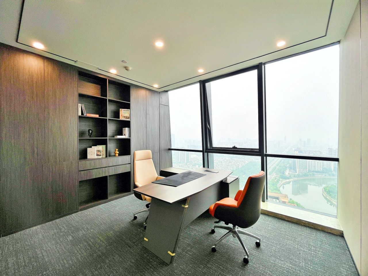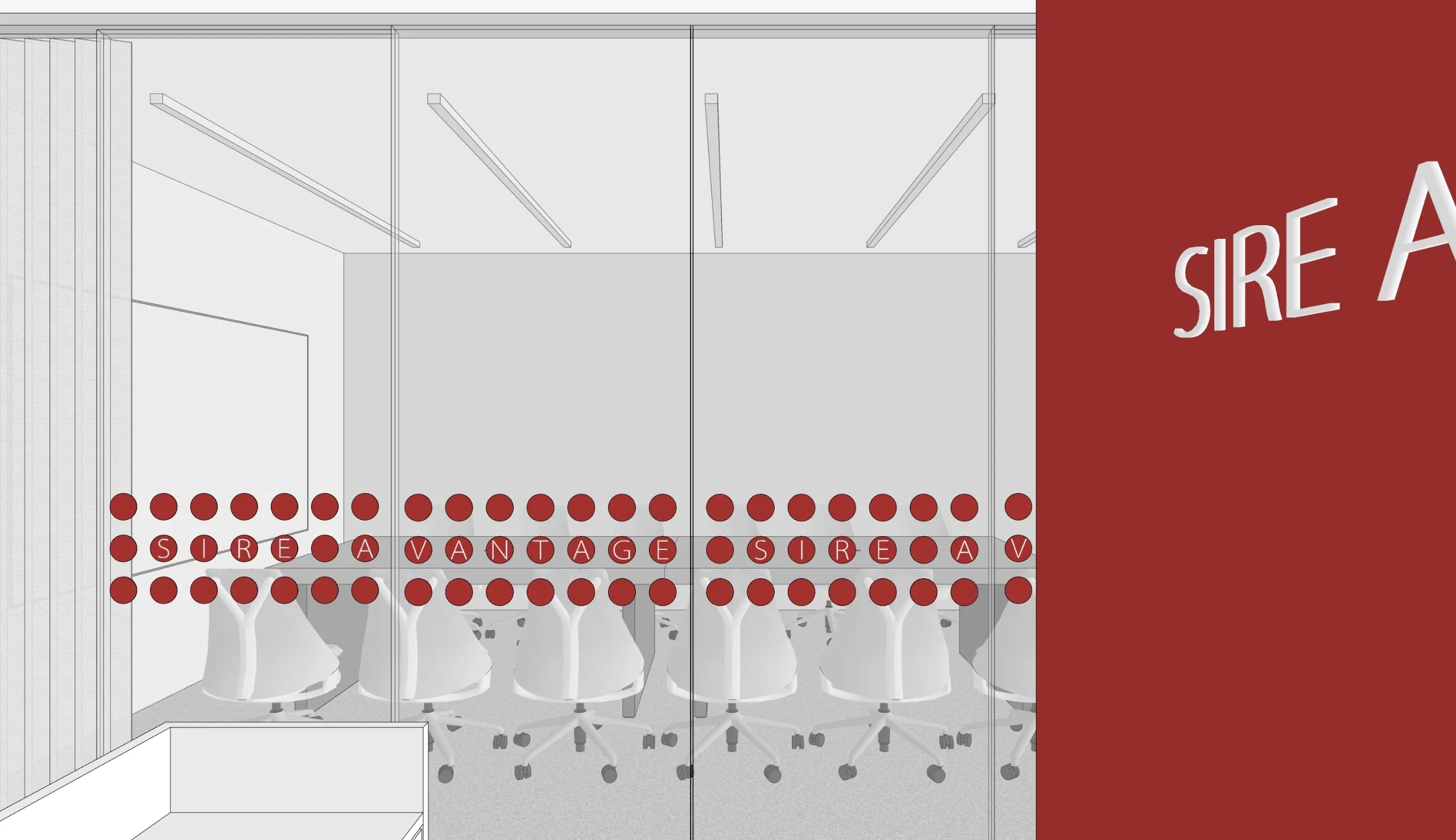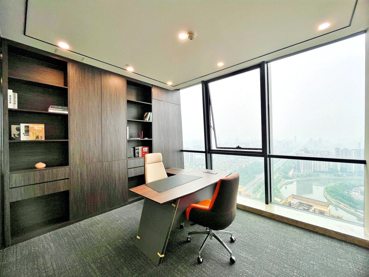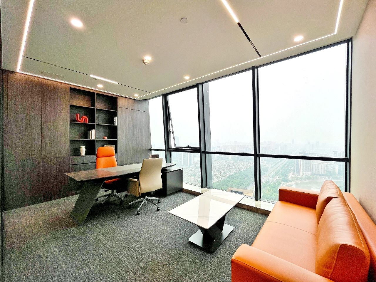 以深灰为主色调, 电子白板两侧以落地玻璃让空间有延展效果, 延伸至走道墙面;临窗区墙面及地面以U形 黄色色块勾勒,。