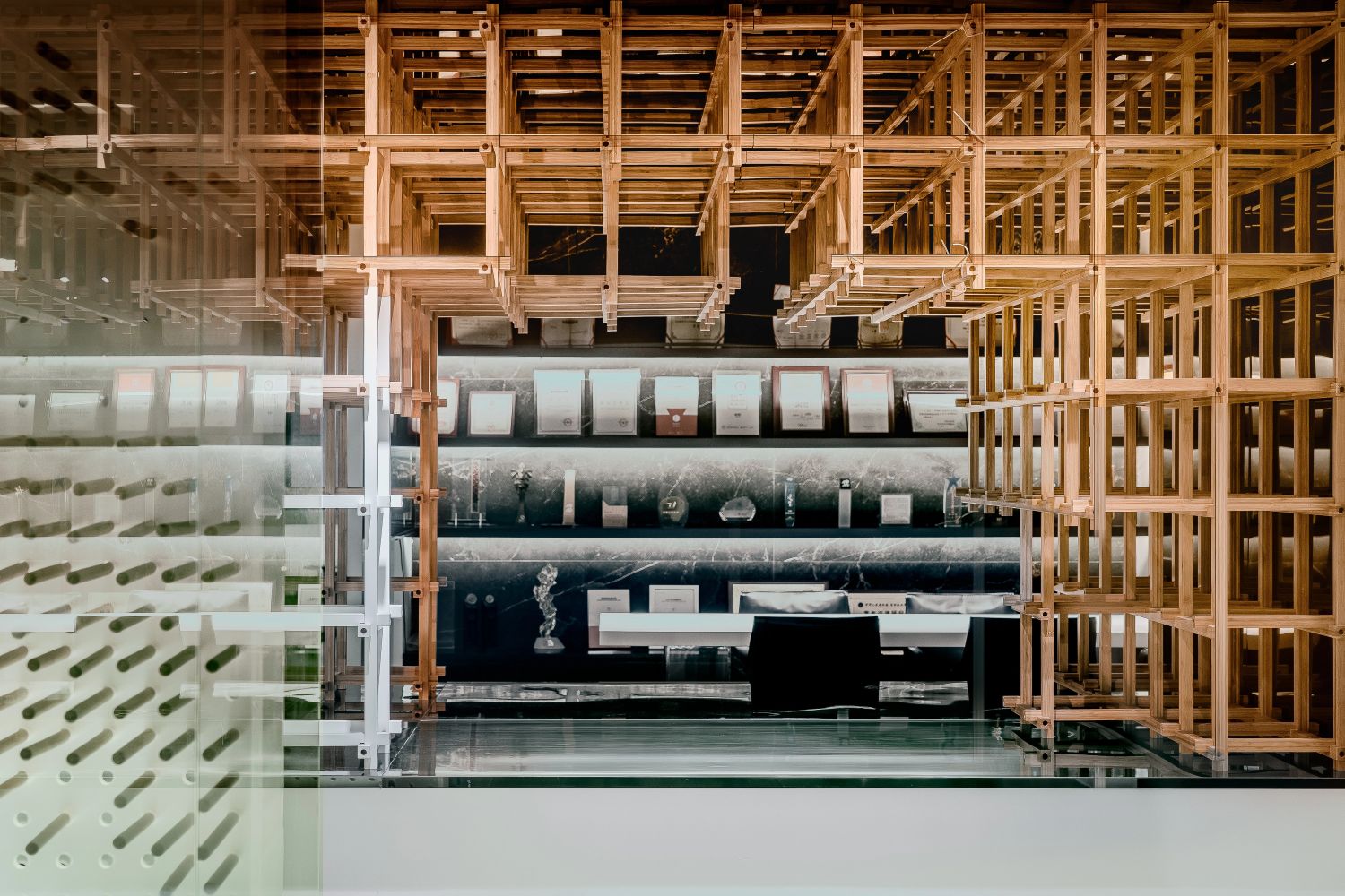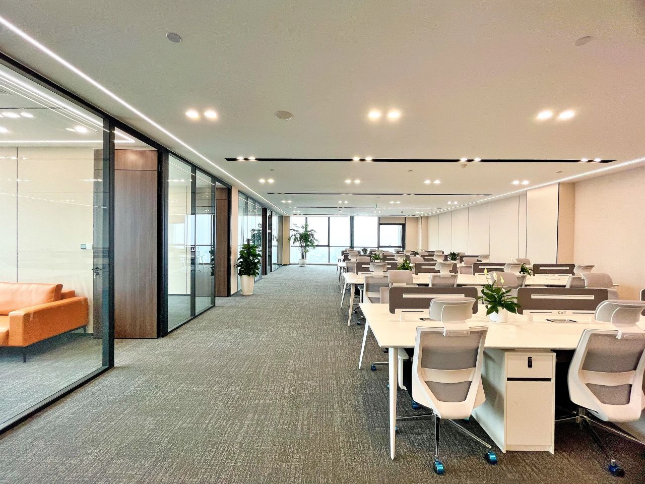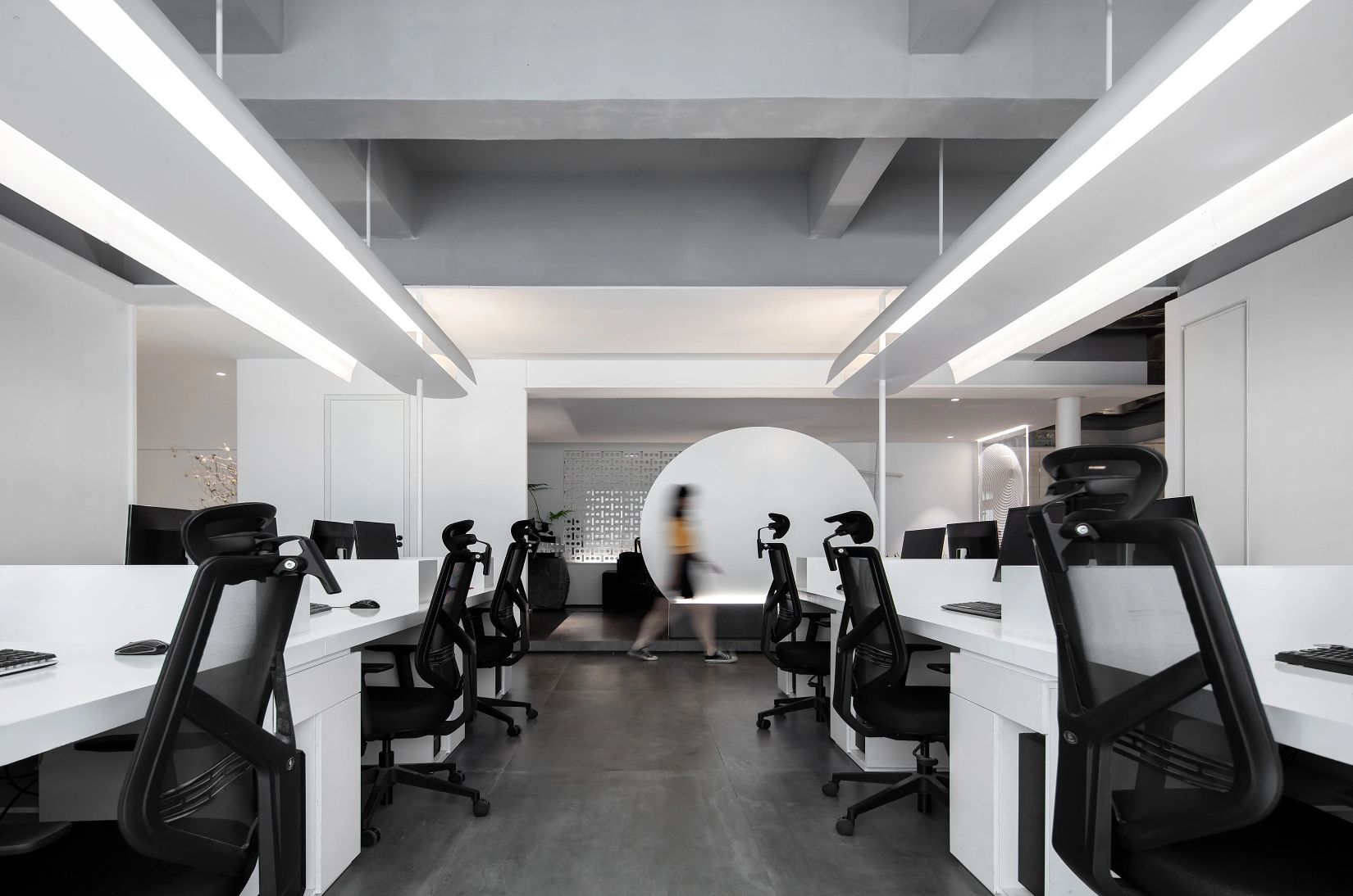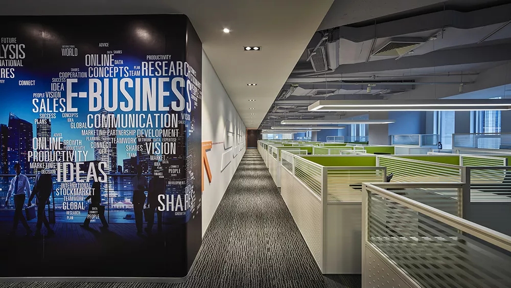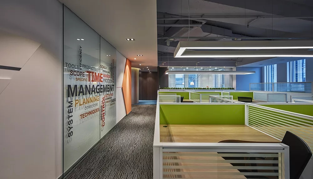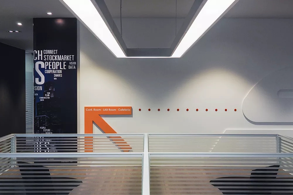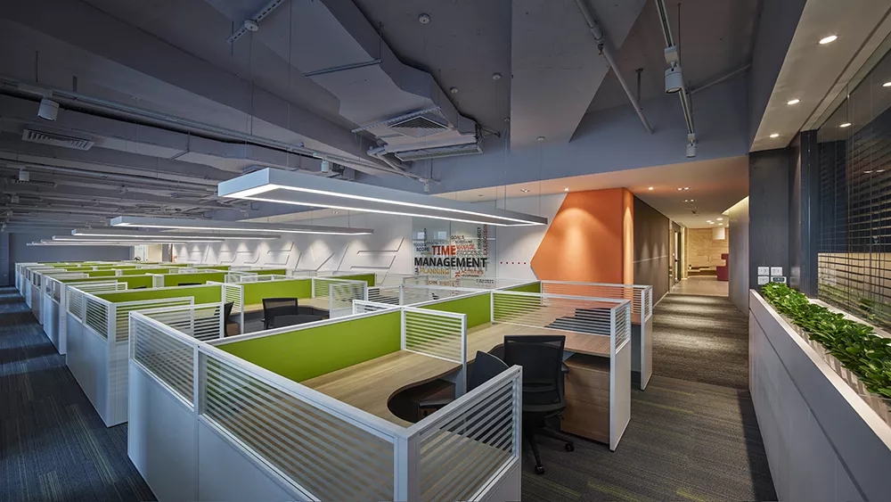 以木纹桌板及绿色裱布板点缀白色工位, 工位上方以白色口字型金属吊灯提供照明, 也形成一阵列效果;此区 走道墙面以白色Logo立体字及色块表现企业历史沿革、经营理念、指针系统;整体设计方向是让工作区有轻快的活力 感及创新的动力感。