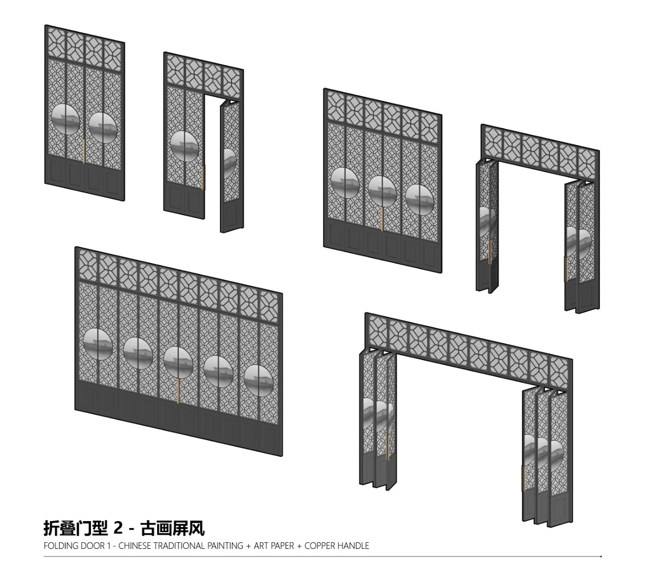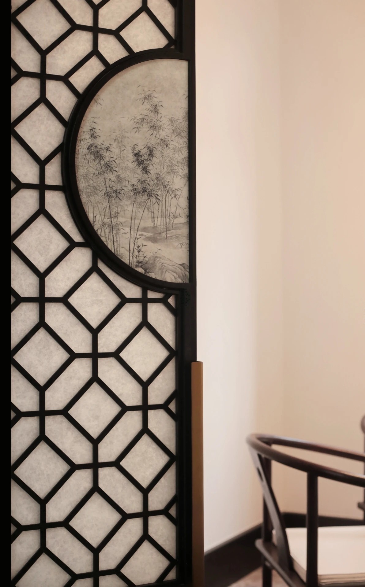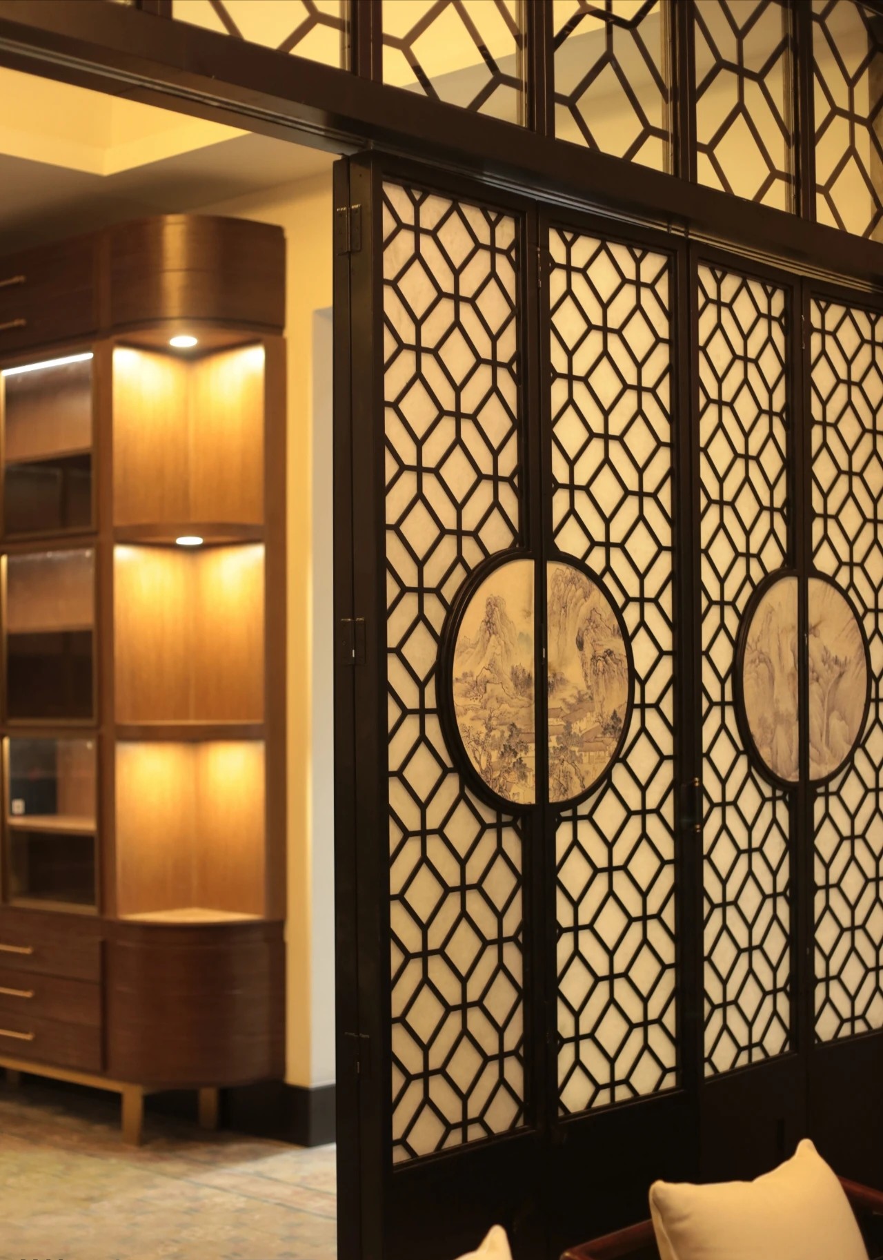经典古韵与当代精致品质融合的大型落地书柜,铺满展厅空间。与展厅相连的茶室,通过大型中式屏风折叠门间隔,实现展示与接待功能的灵活变化。