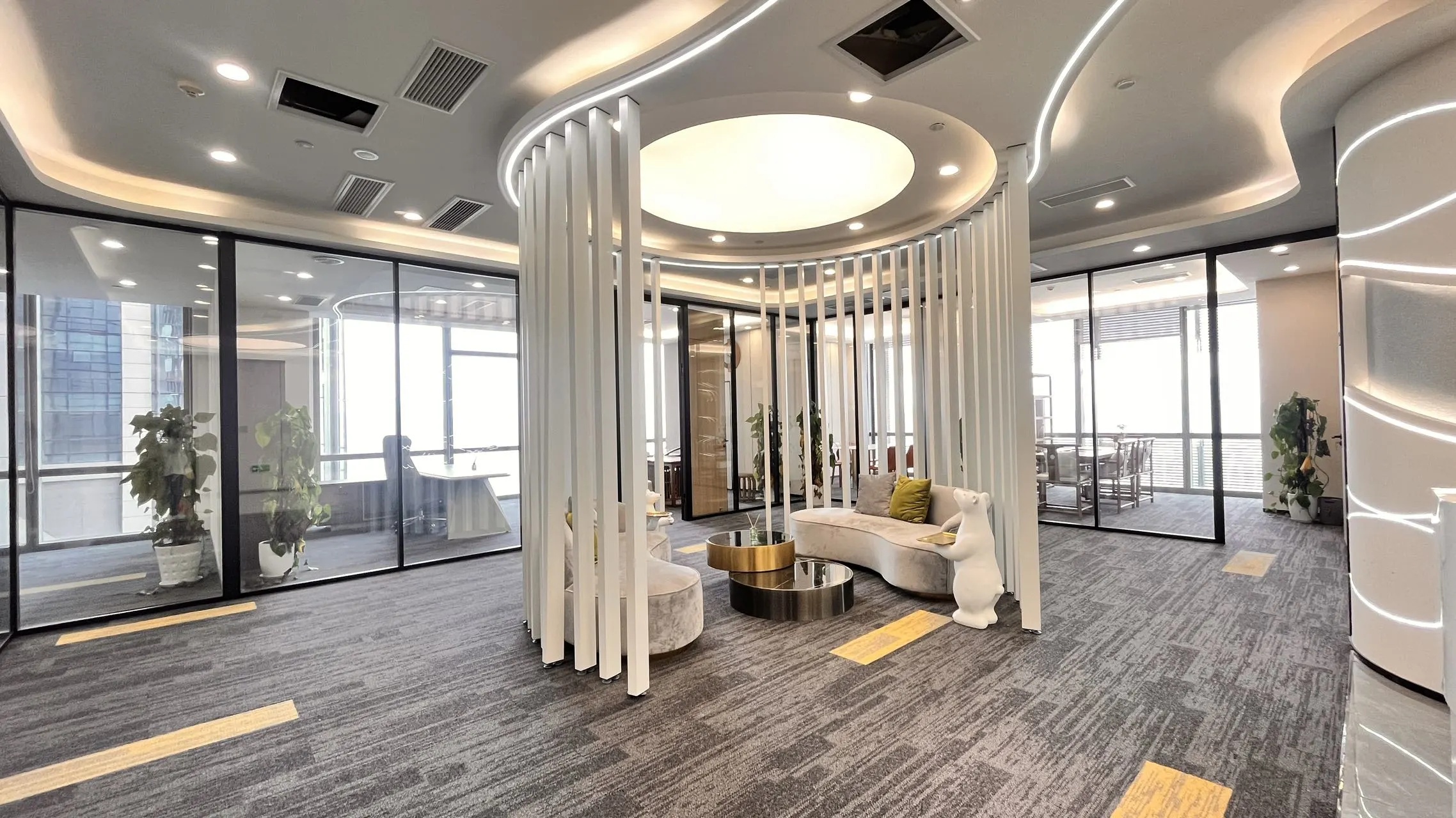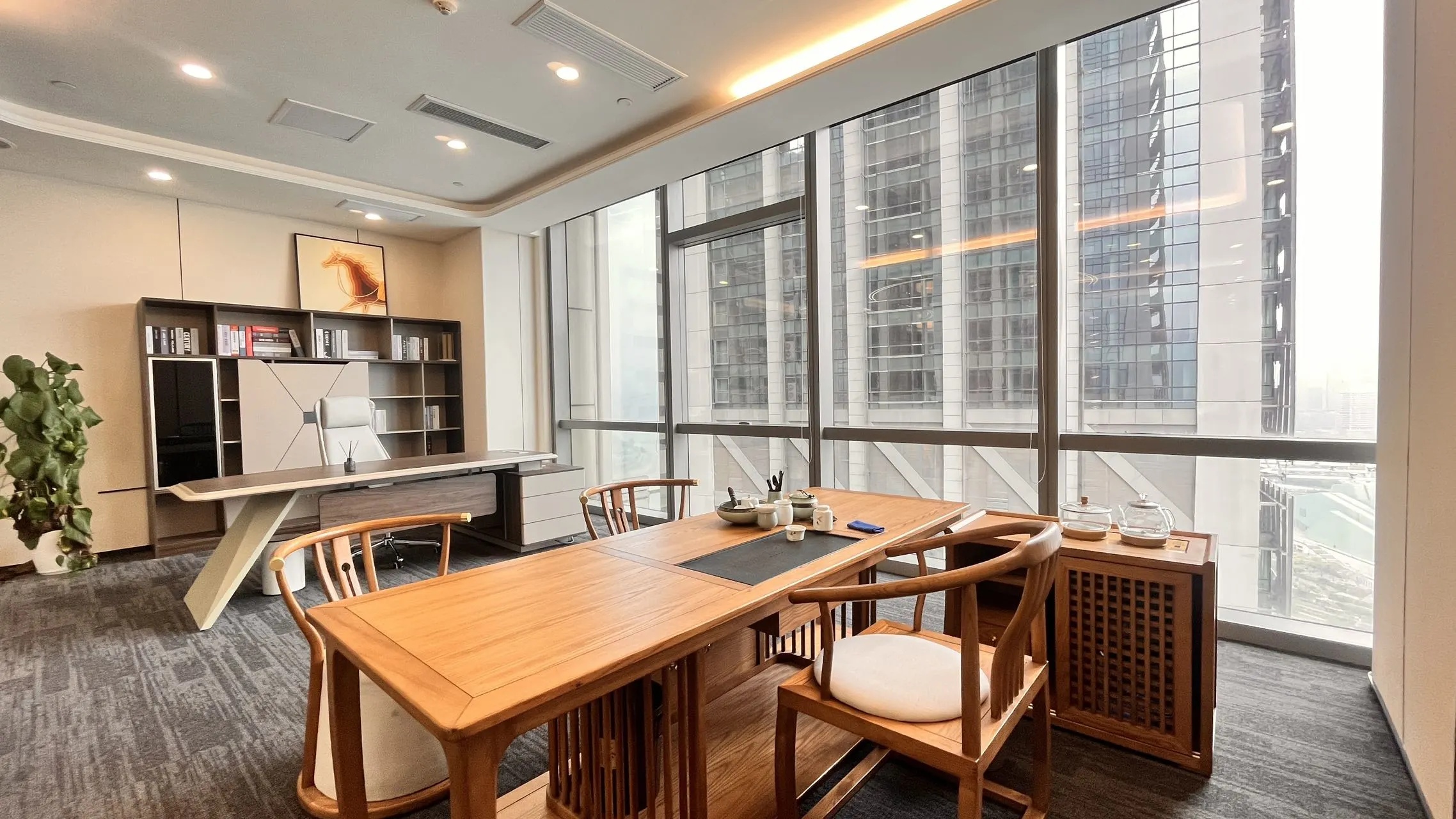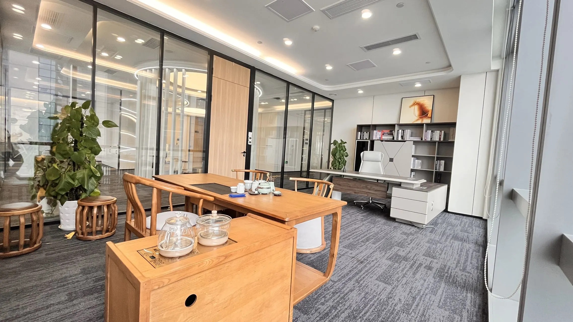 经典古韵与当代精致品质融合的大型落地书柜,铺满展厅空间。与展厅相连的茶室,通过大型中式屏风折叠门间隔,实现展示与接待功能的灵活变化。