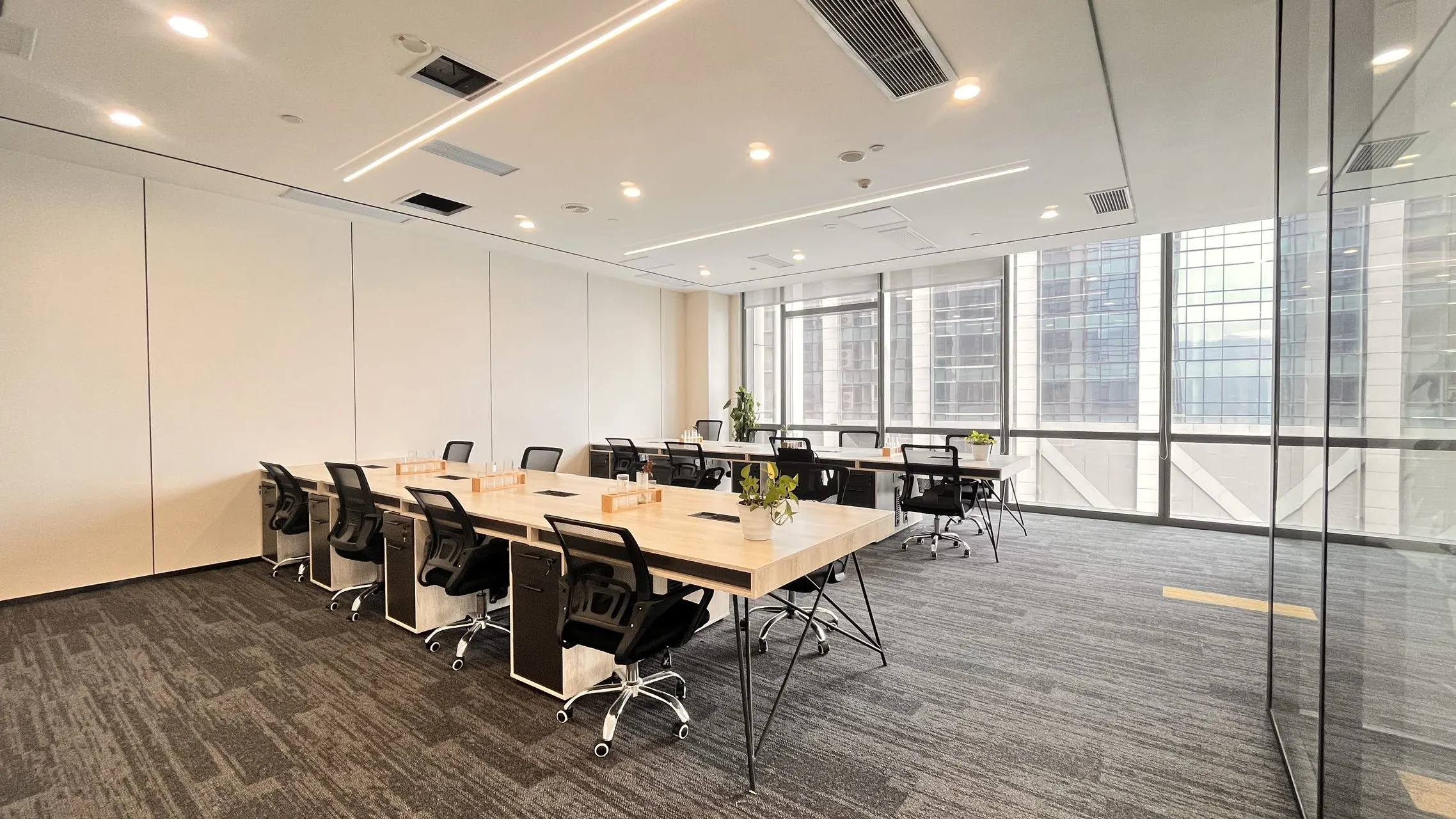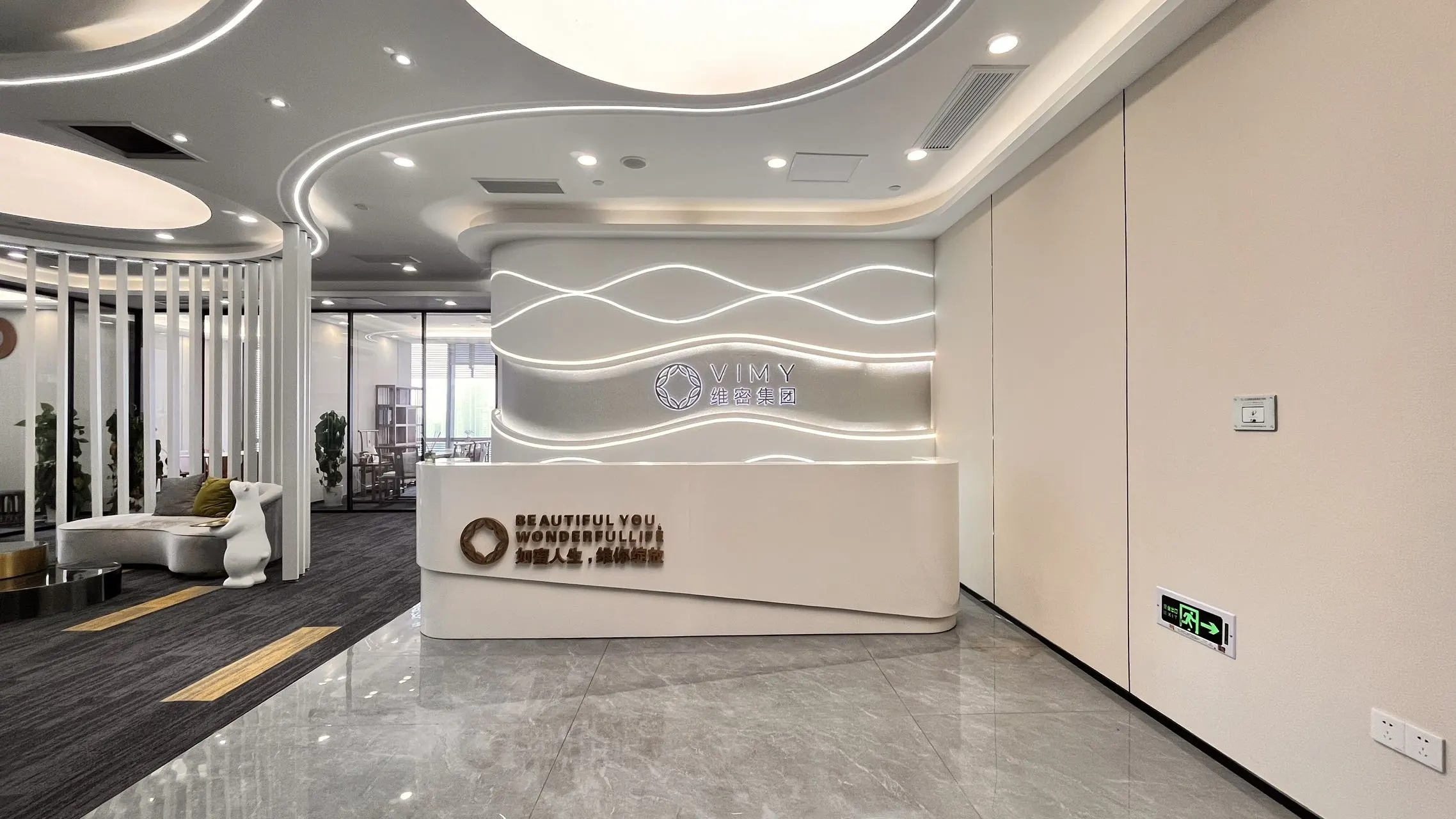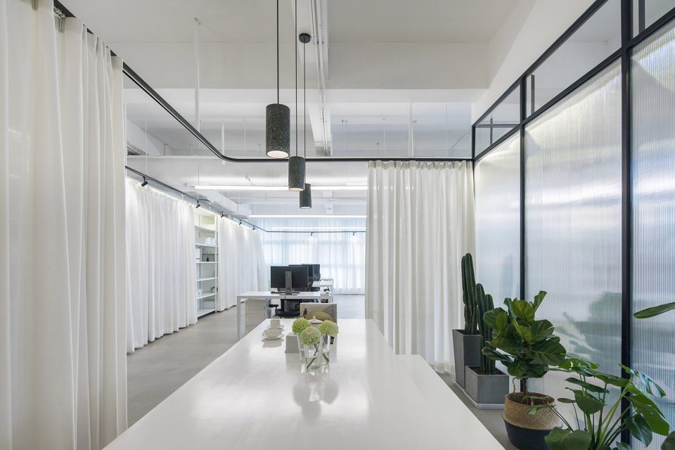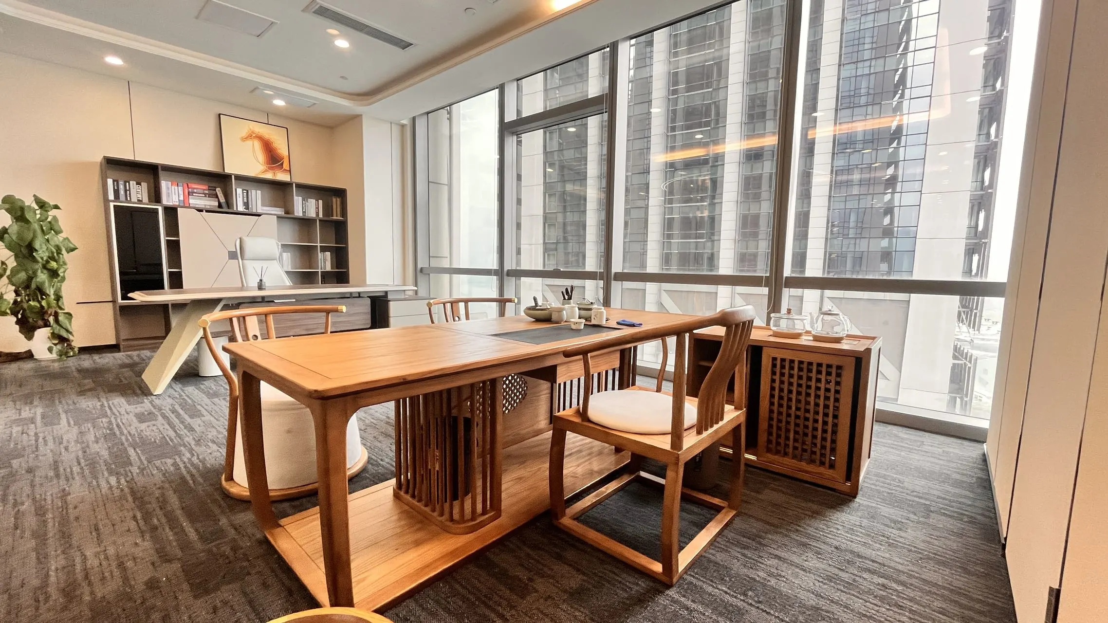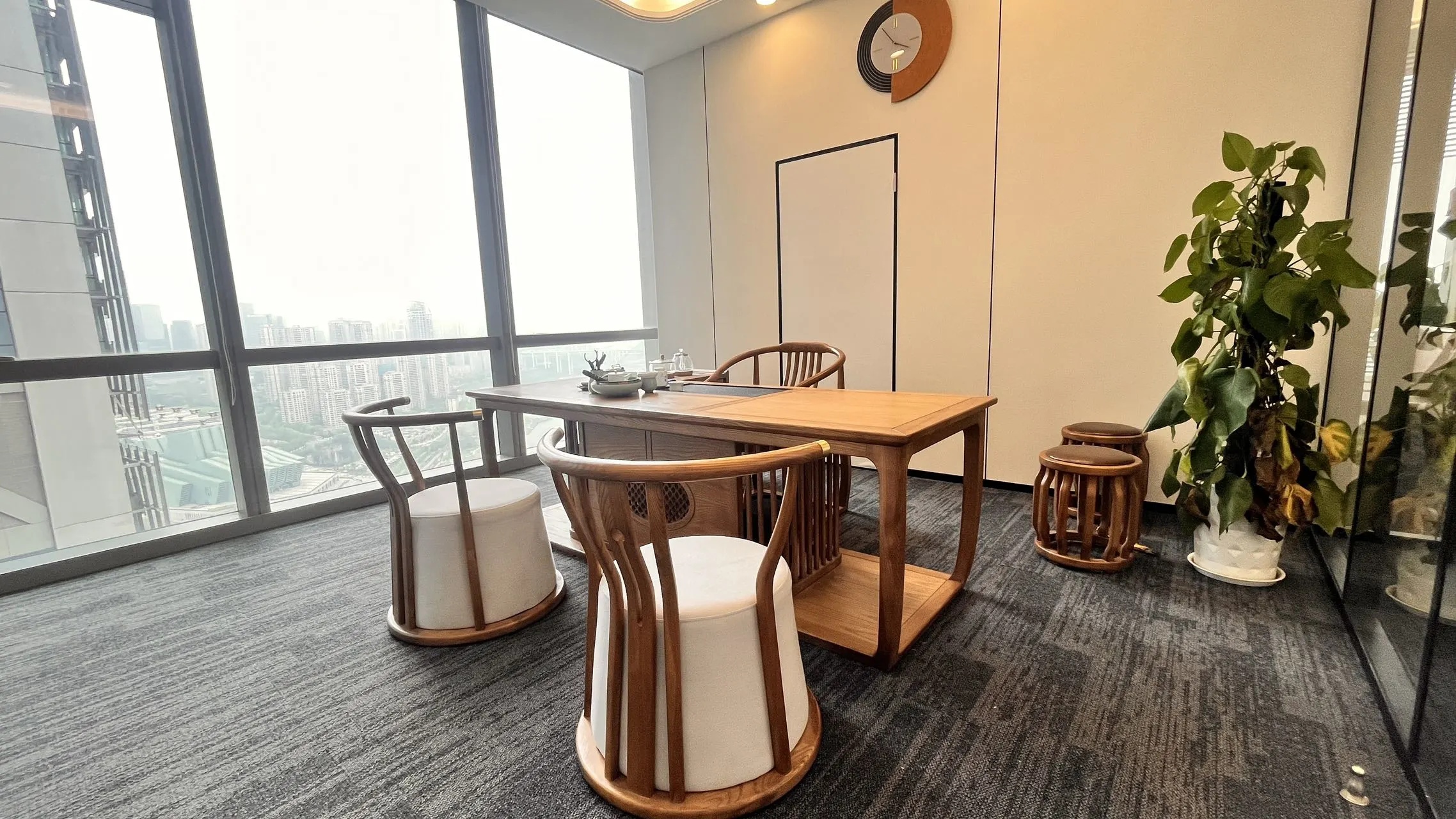 茶水间安排在两侧楼体之间的连廊,用新中式家具保持空间的简约轻松与文化气质,成为参观动线与办公动线的衔接中心。