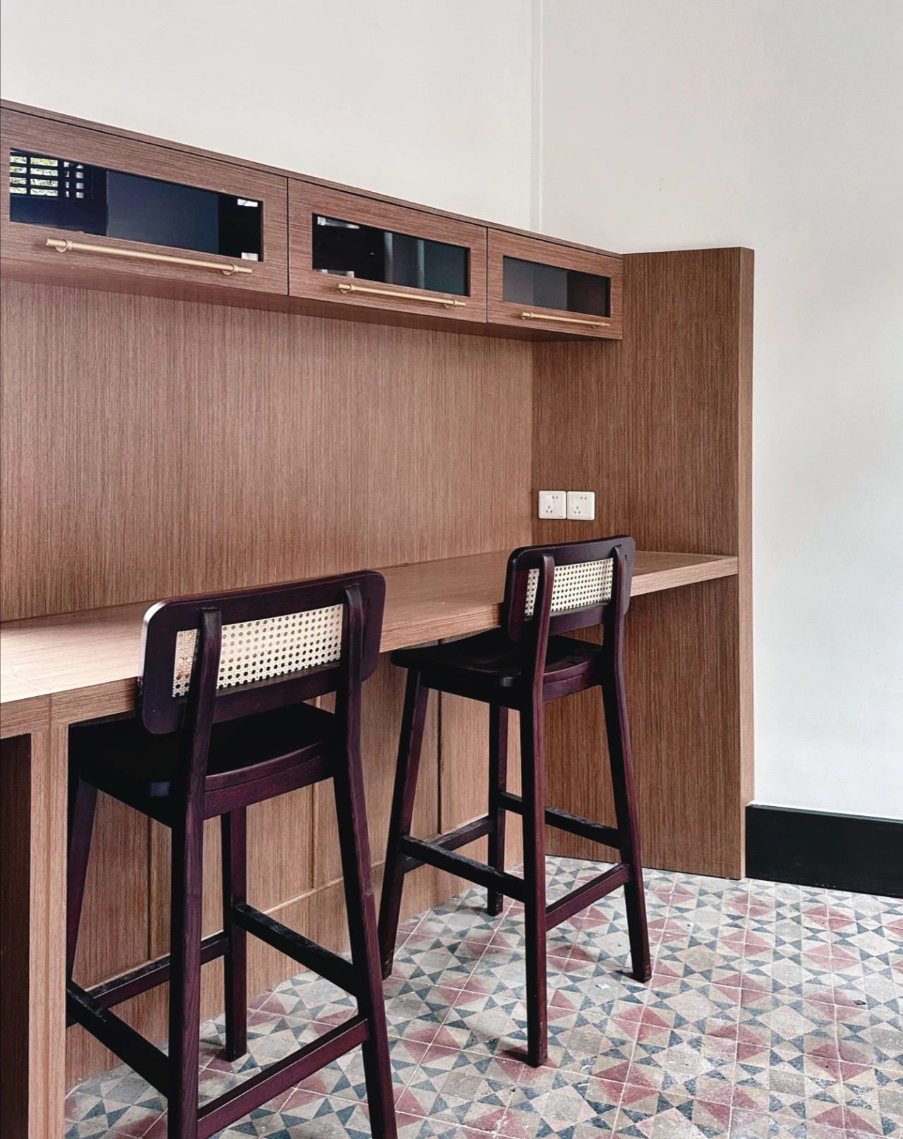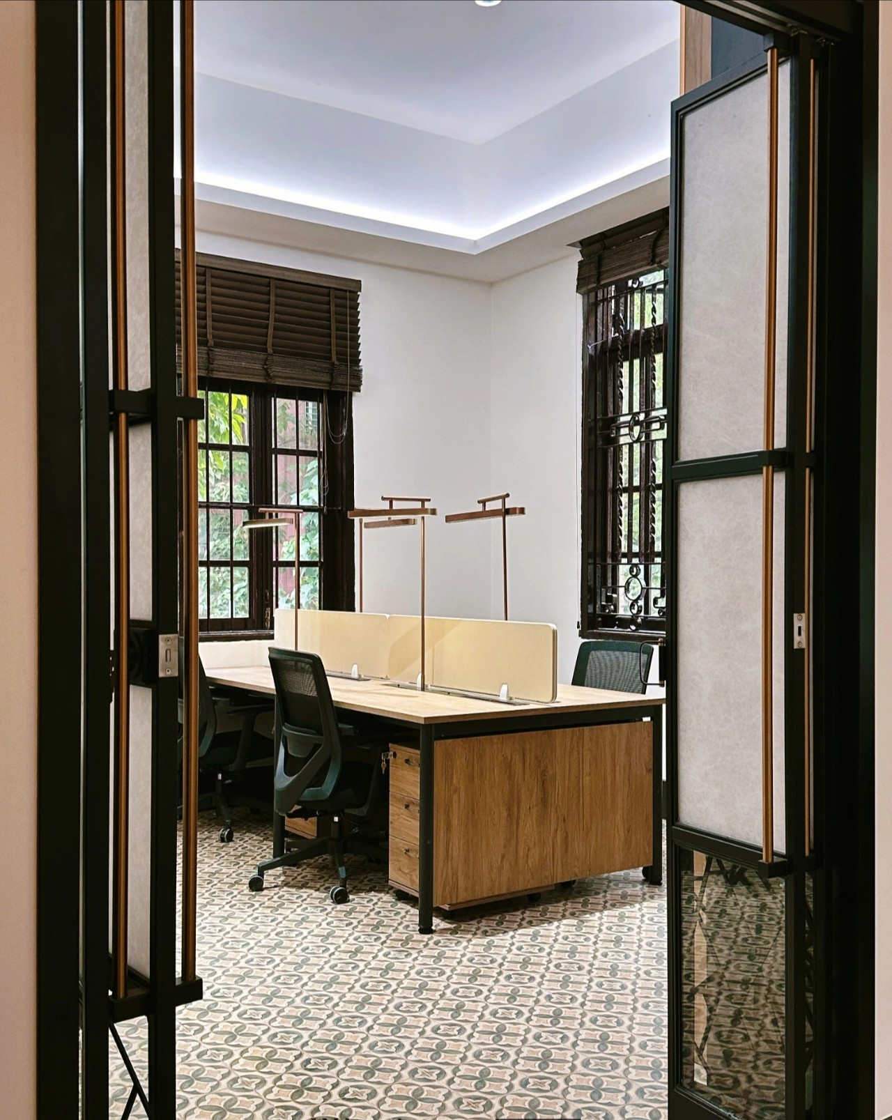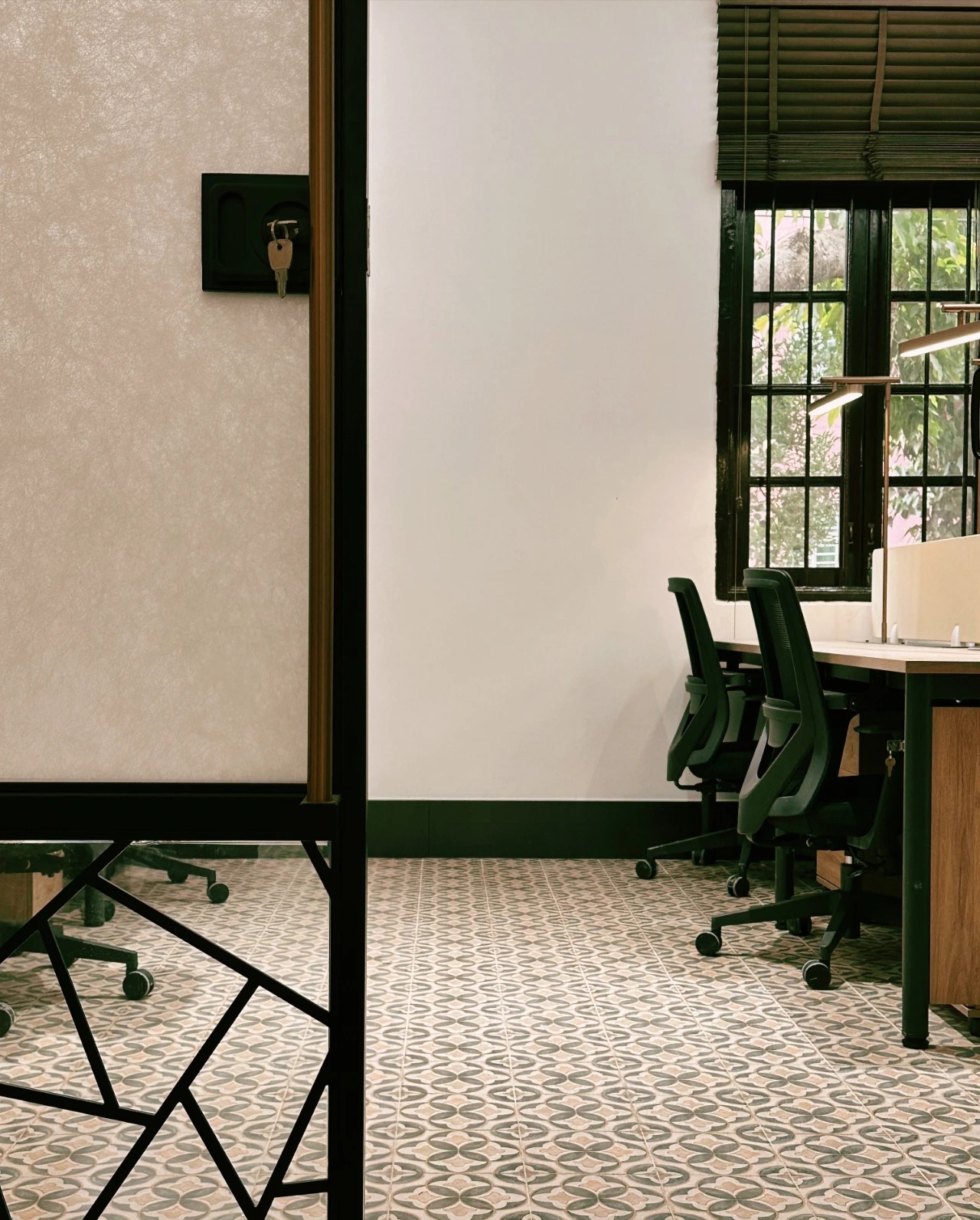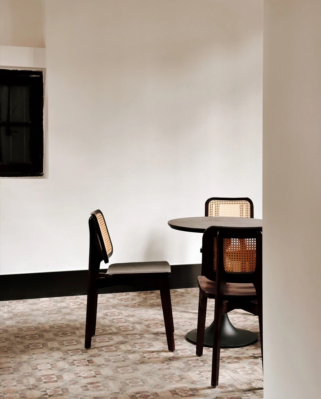 秉持修旧如故的原则,建筑修复保存西式栏杆、拱券、花阶砖等传统特色构件和工艺。室内设计聚焦在门窗和家具设计上。创研社开发了一系列融合满洲窗纹样和岭南书画的门窗屏风,通过将它们间插于在老洋楼走廊之中,在实用性上增添文化韵味。