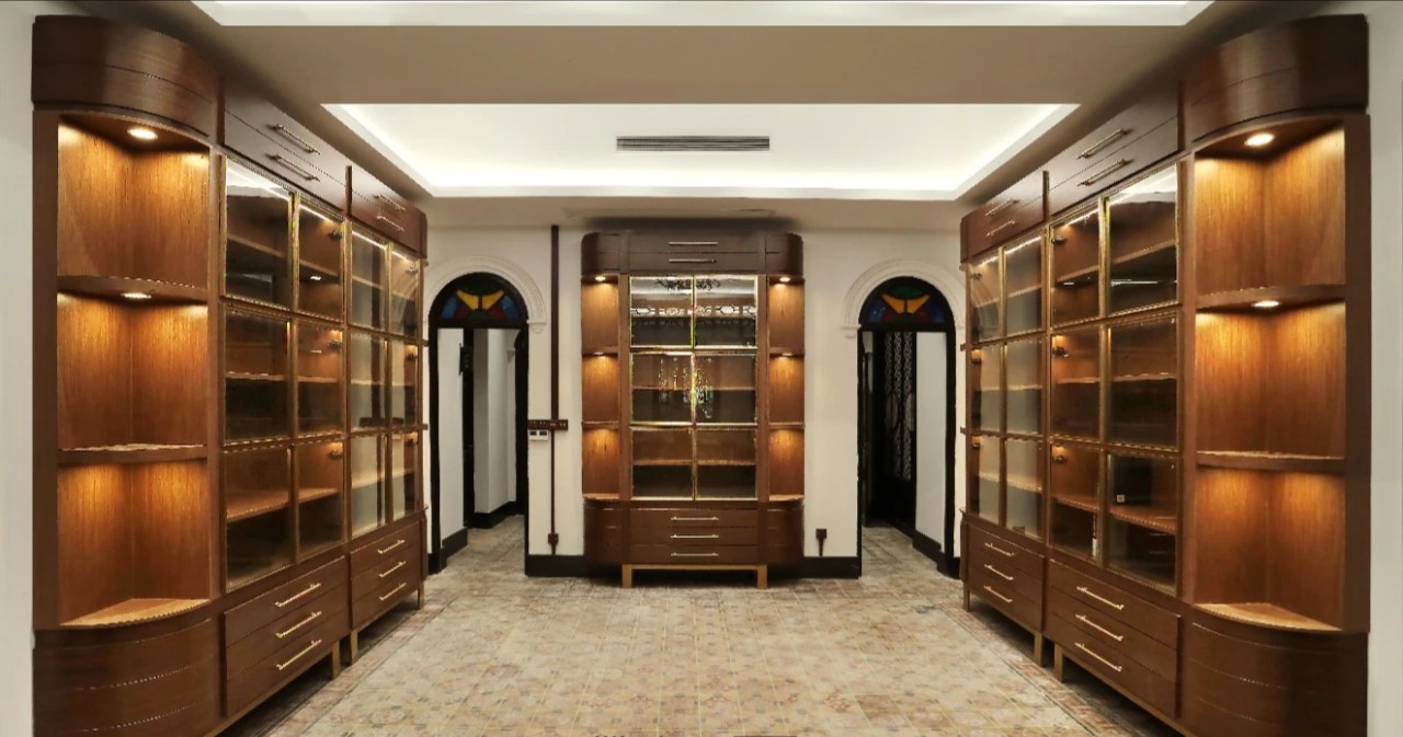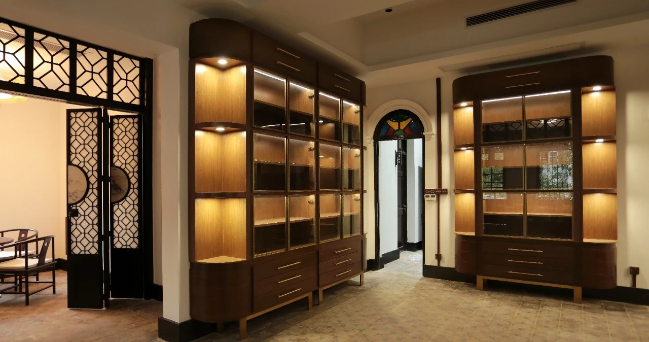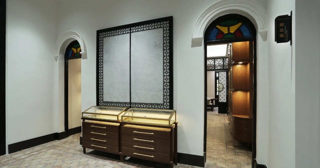 西侧三楼展示中心,展陈器架延续新中式风格,精致的当代设计感、中式屏风、水墨元素与老洋楼的满洲窗相映成趣。