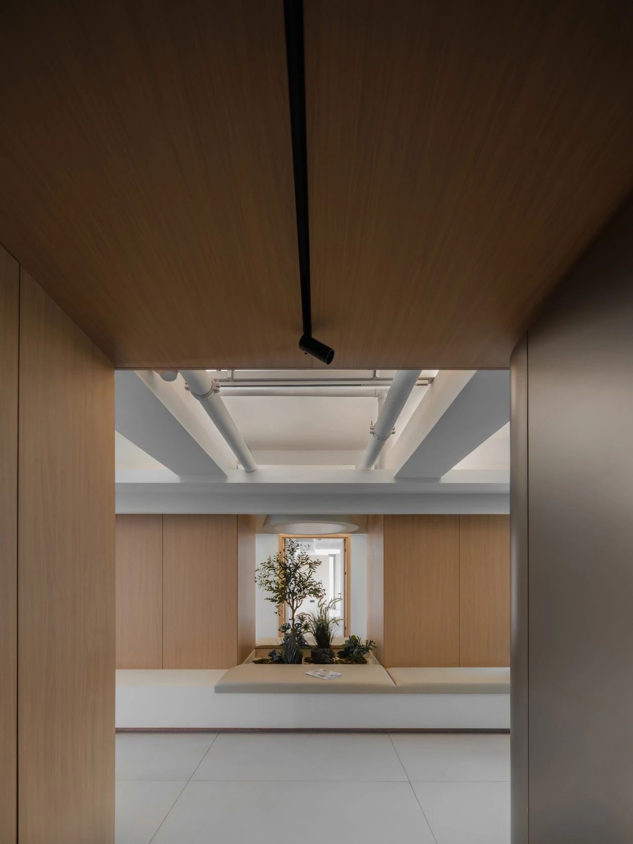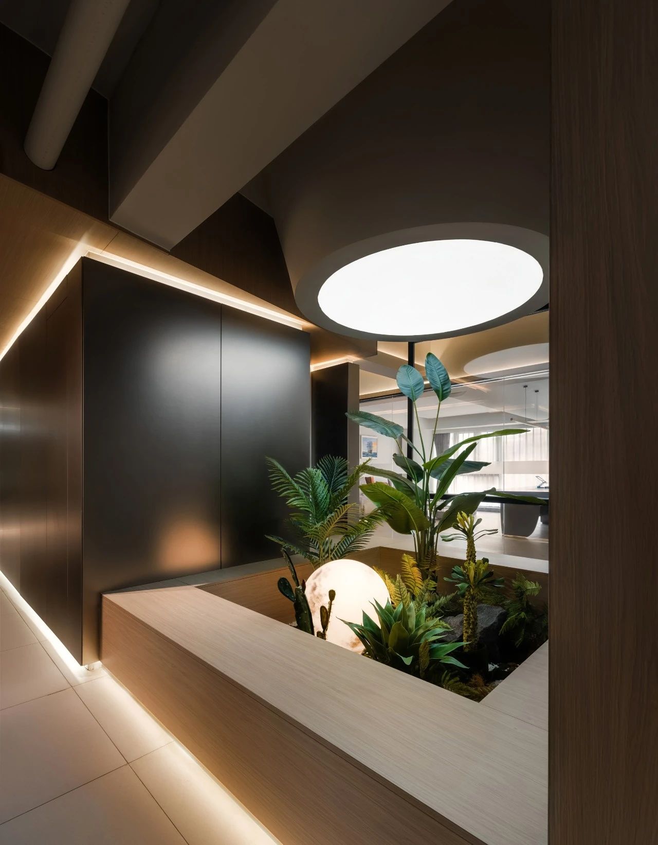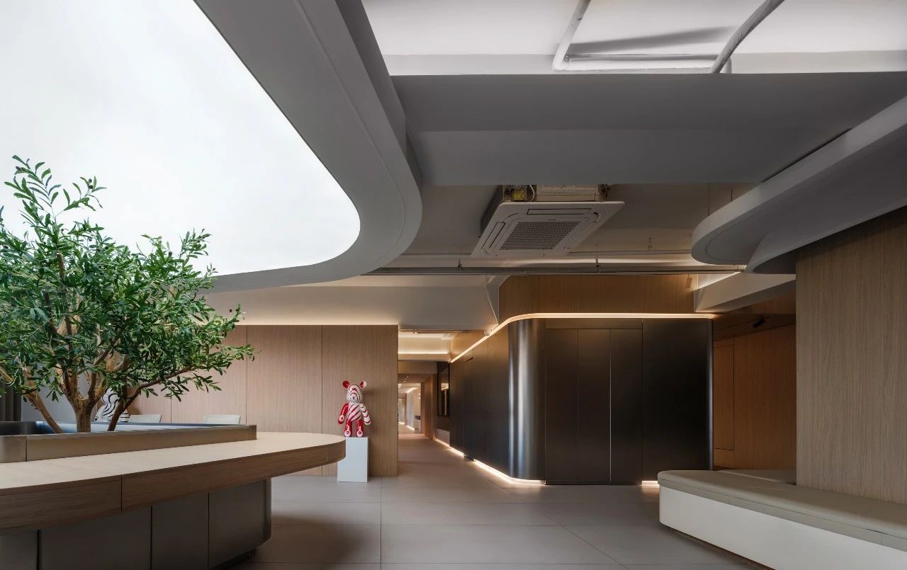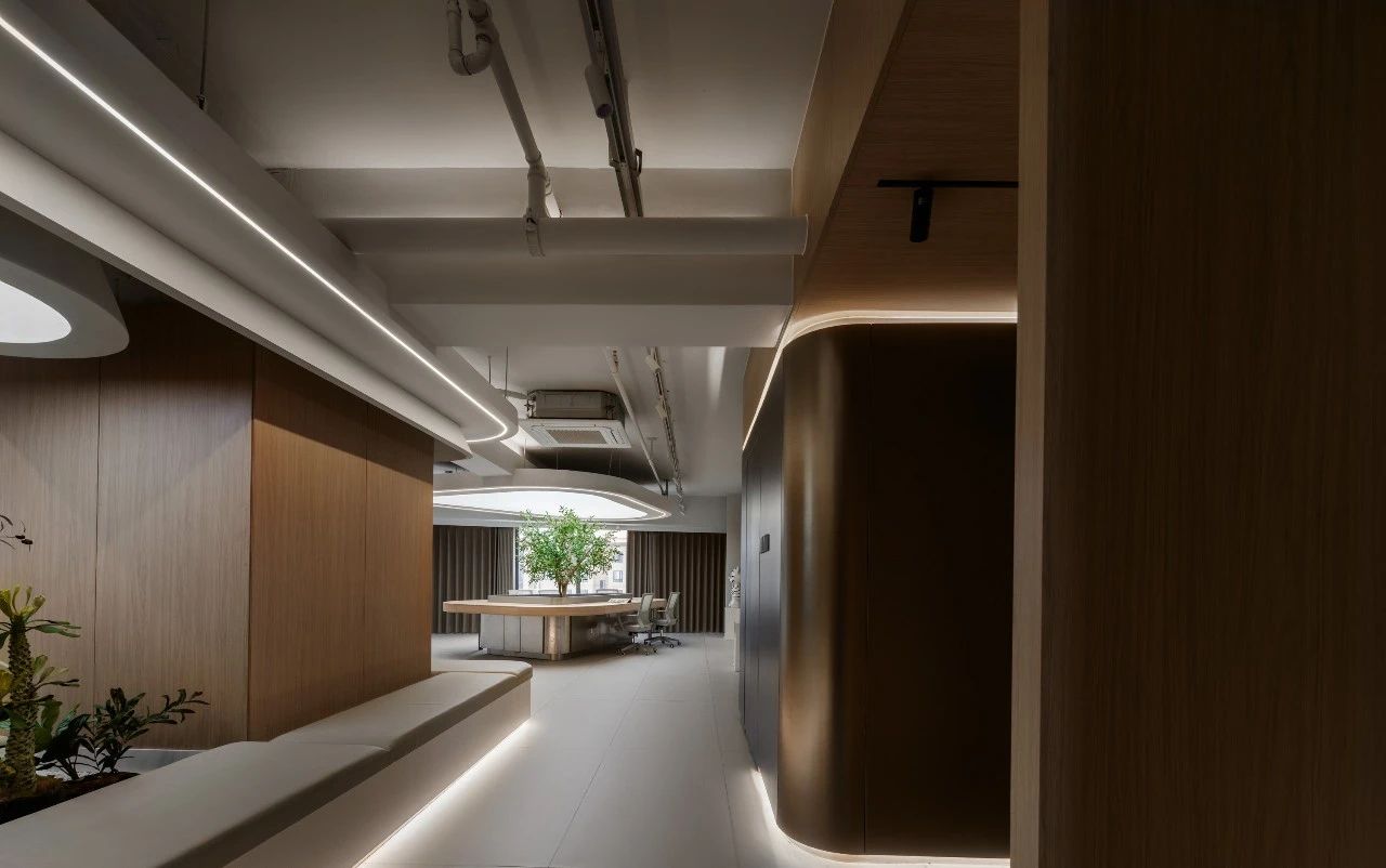 从电梯入口开始设计师巧妙地设置了一个过渡空间这个空间不仅是实际意义上的通道更是情感上的桥梁它象征着一种“先抑后扬”的设计理念,让每个人在进入工作状态之前,都有一个缓冲的过程。过渡空间的设计既开阔又充满变化,让人在移动中感受到空间的韵律。这些端景如同点缀在空间中的艺术品无论是一幅壁画、一个雕塑还是一处特色植物区每个端景都是为了让人们在日常工作流中随时能获得视觉上的愉悦和心灵上的慰藉处处有景意味着每个角落都有让人驻足欣赏的理由