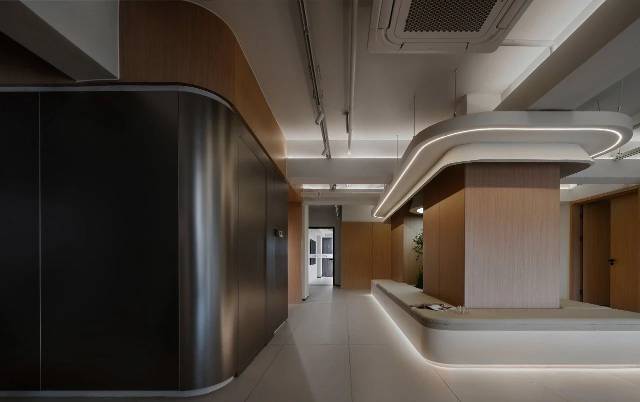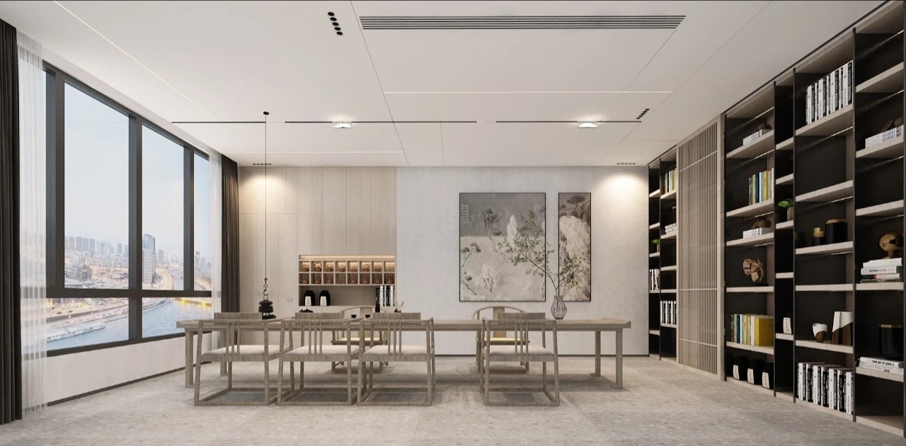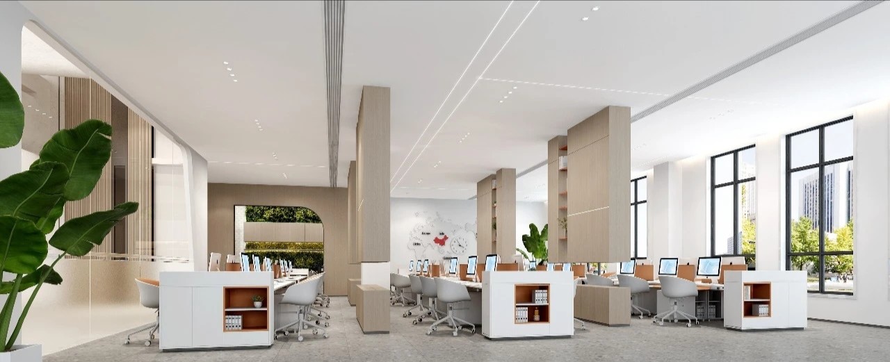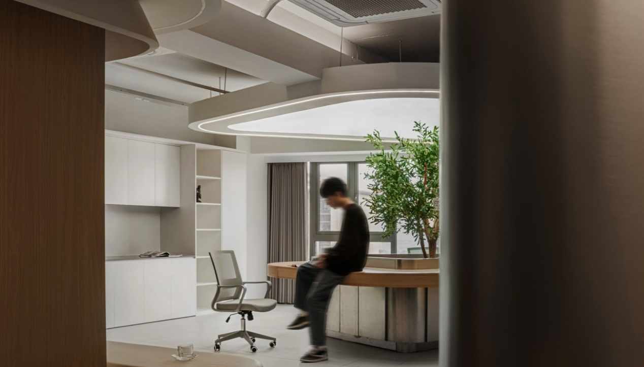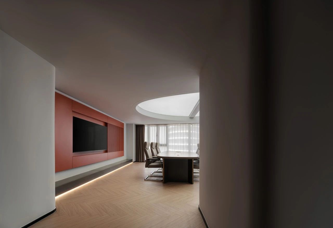 进入办公楼的主体之前,设计师特意设置了一个退让的玄关处这里摆放着干景。不仅增添了空间的美感,亦在无形中缓解了人们的心理压力。办公区域:由一系列工作空间组成,包括开放式办公区、独立办公室和团队协作室。设计上追求高效与私密性的平衡。