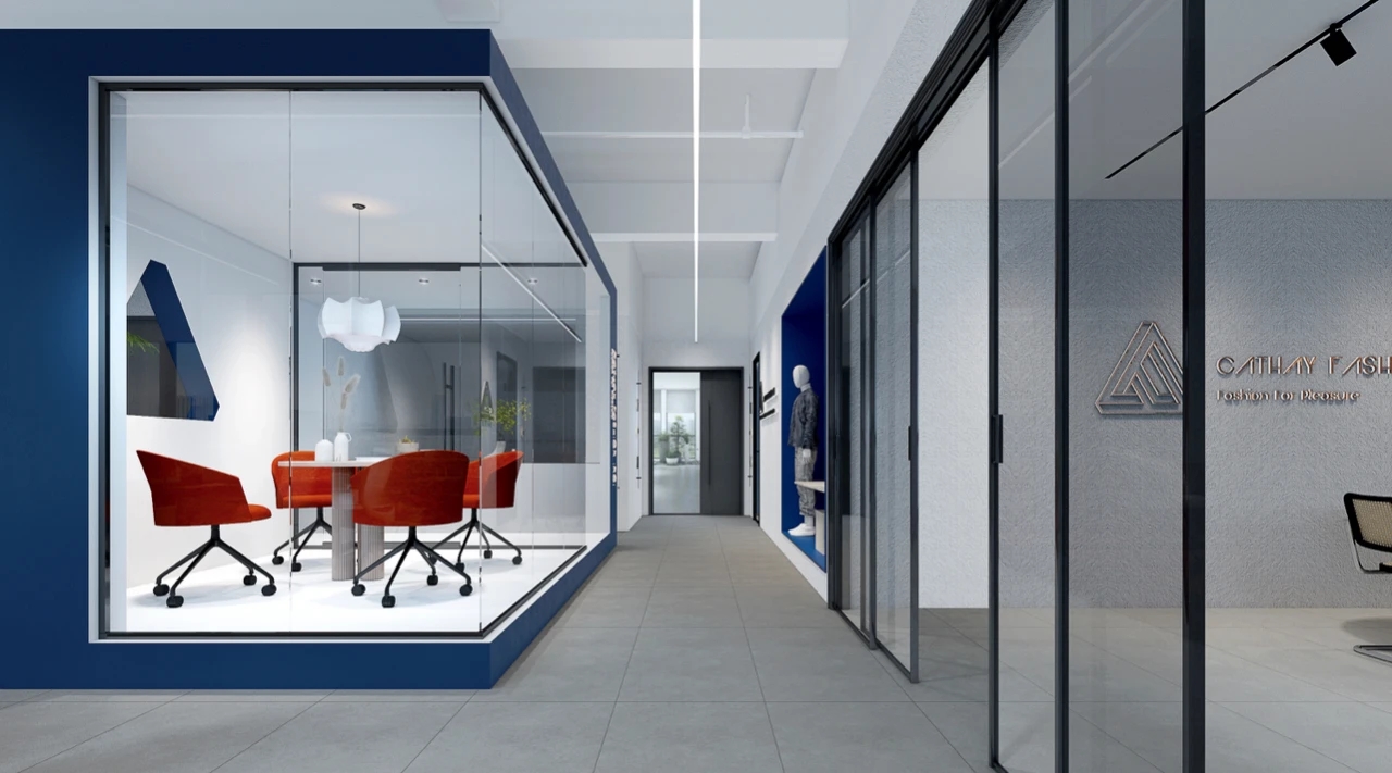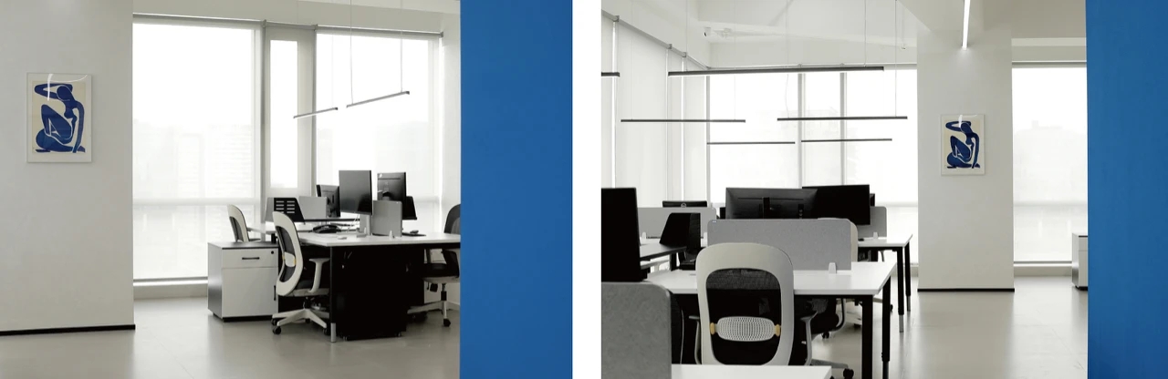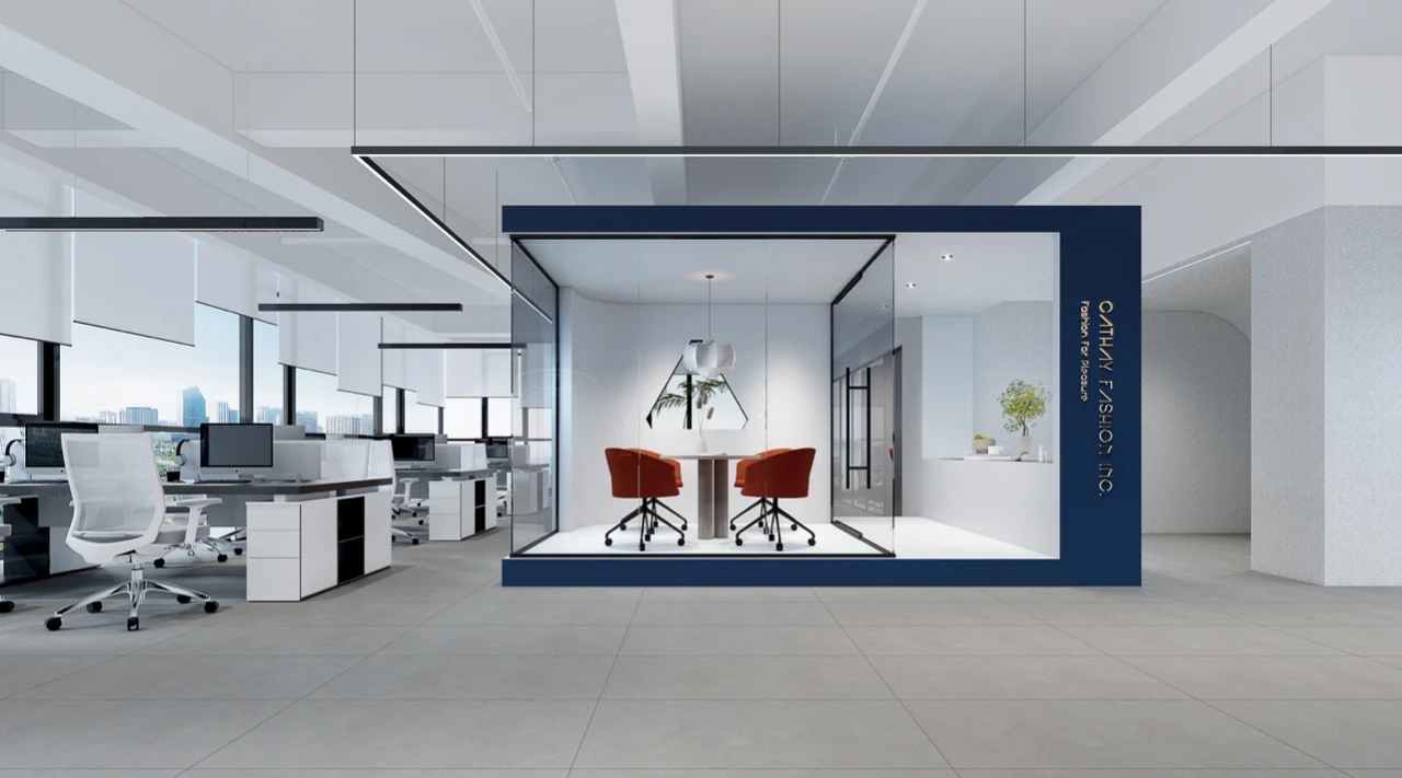空间仍是南北双面大落地采光的朝向优势较上一次的需求 本次增加了:A超大型仓库空间B独立的产品拍摄区C橱窗展示D会议室更是兼顾了产品展示厅功能E员工工位达20人F总经办G围绕中央区域的蓝盒子茶歇室(包含文印台、茶水台的集合功能)以蓝盒子为核心固行走动线间 移步寸光 目目见蓝为长期伏案办公的你缓解眼劳虽然本次作品没有太多的夸张造型 为设计而设计反而在横平竖直中 做好扎实的基本功唯一不甘愿平凡的蓝盒子是留于日常里的 内心保有的光亮也将个性埋藏进无声的关怀里