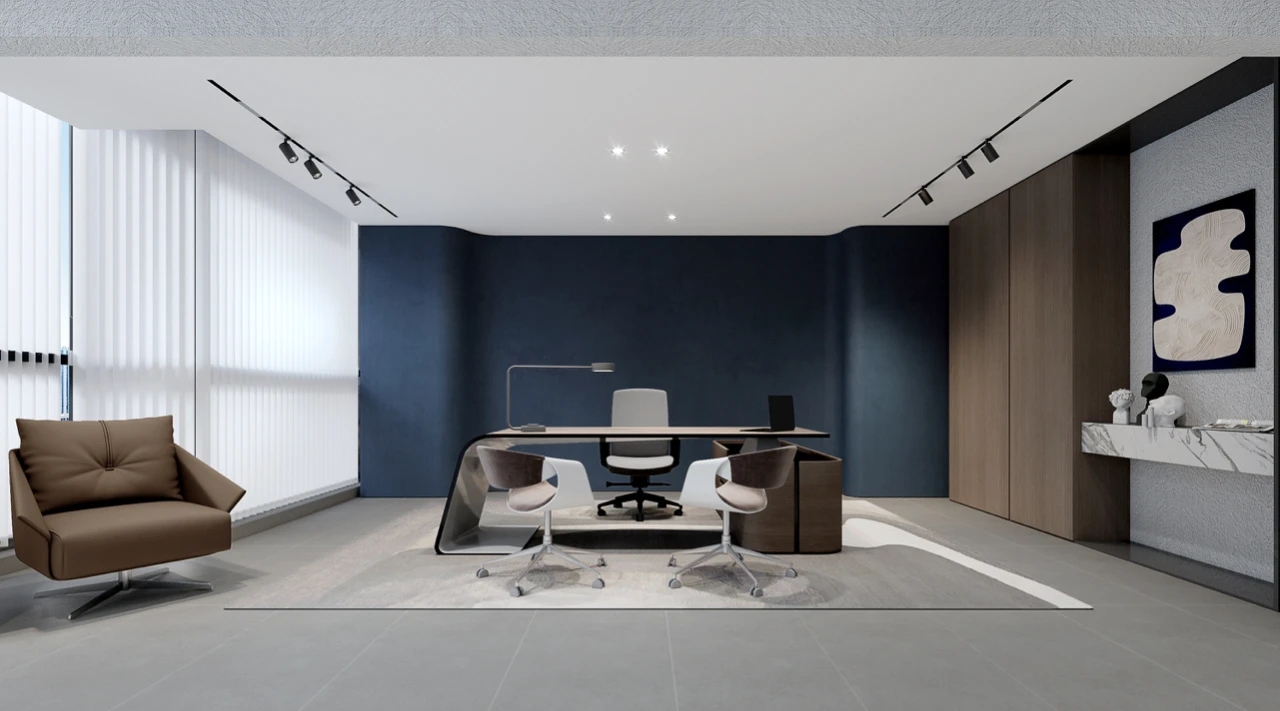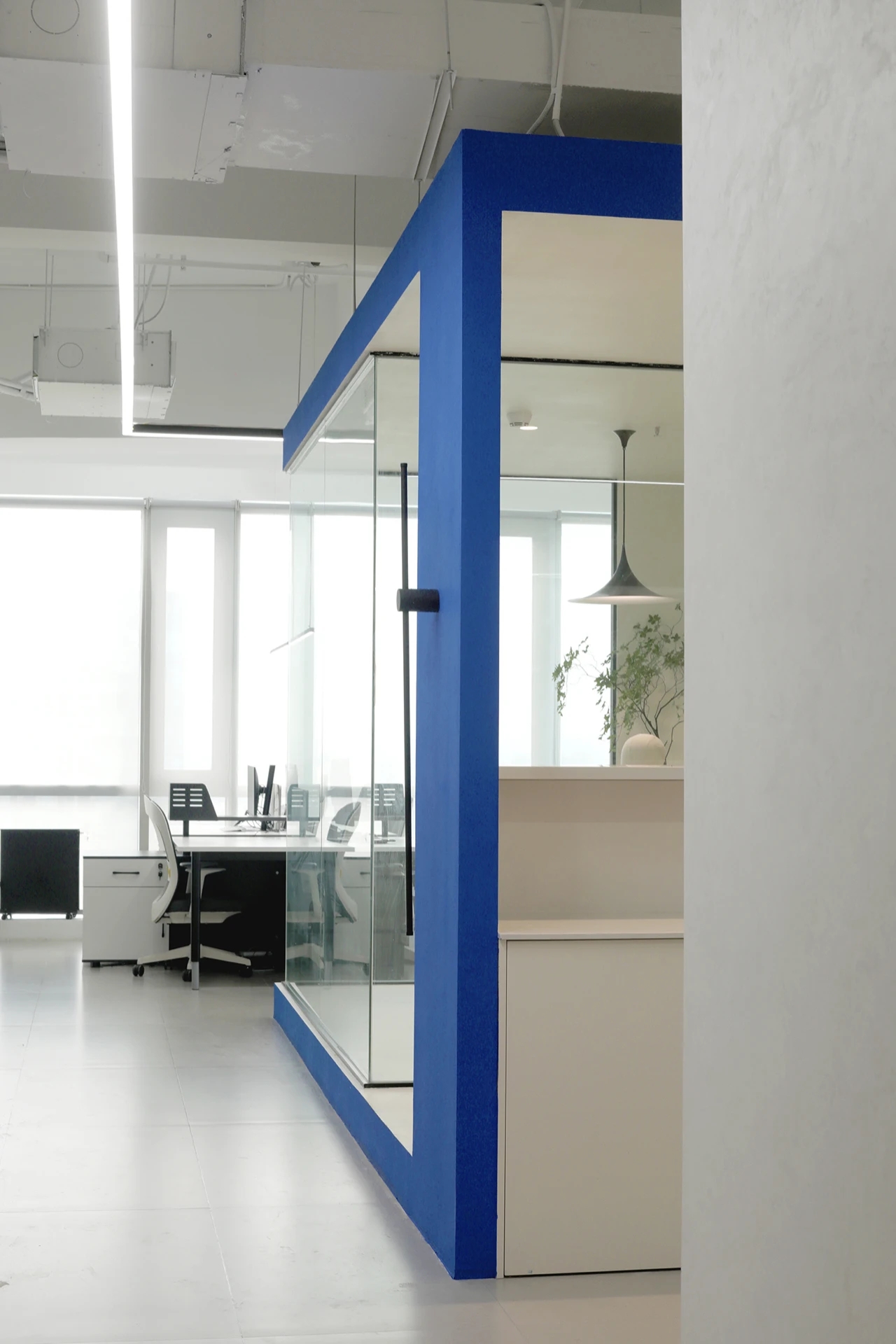 蓝盒子是空间里的精神领域它服务于你的重要客户接洽 服务于你的私密悄悄话服务于你工作之余的闲暇空歇又或只是空闲着什么也不做提醒日常忙碌中的人们时常独处 偶尔安静 放空蓄能 韬光养晦为下一个目标创造持久效率的动能