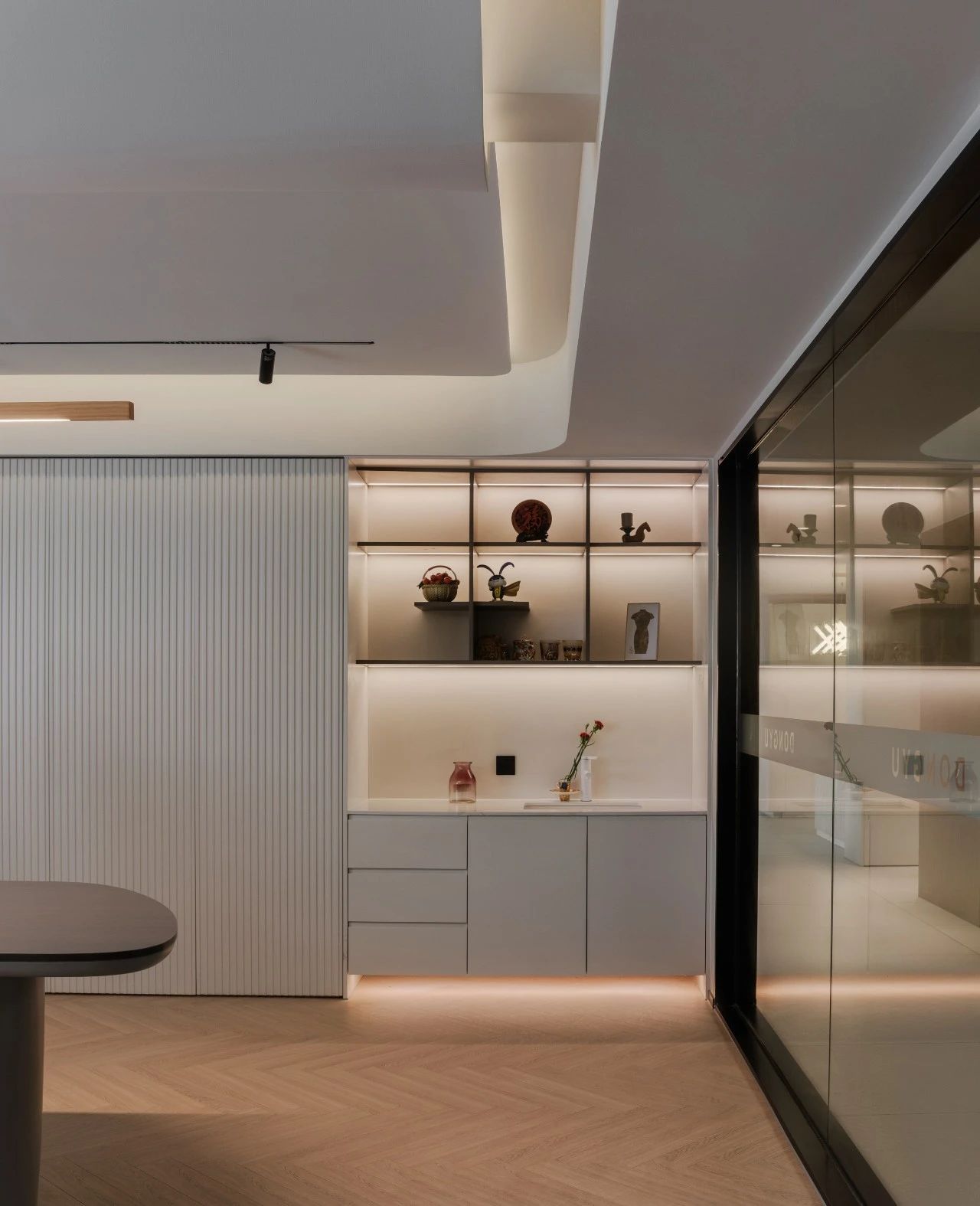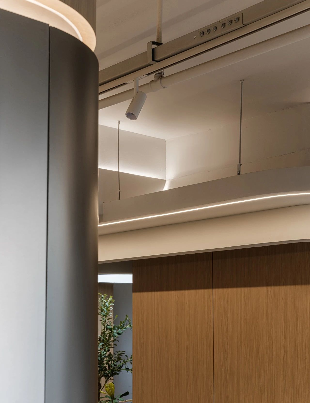 打破原有办公室给人的刻板印象设计师打造的一个“休闲式”工作空间它所承载的内容就有了更多的意义当空间不仅仅是空间本身透过吧台的空隙透进水吧区的仿真绿化墙体,与动车车窗外的果园景色起到一个呼应,布置考究的灯光和精心的细节处理来强化空间表达。隐约可见的现代动车与水磨石吧台玻璃砖的碰撞,打造连贯的设计语言。
