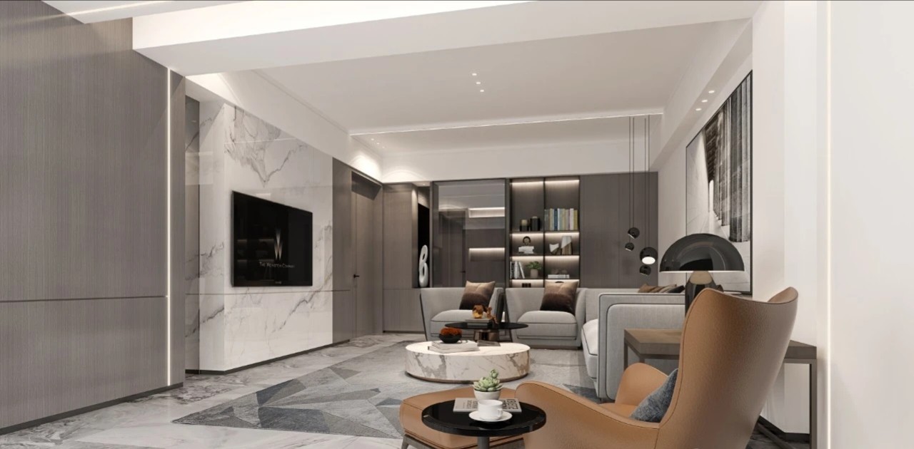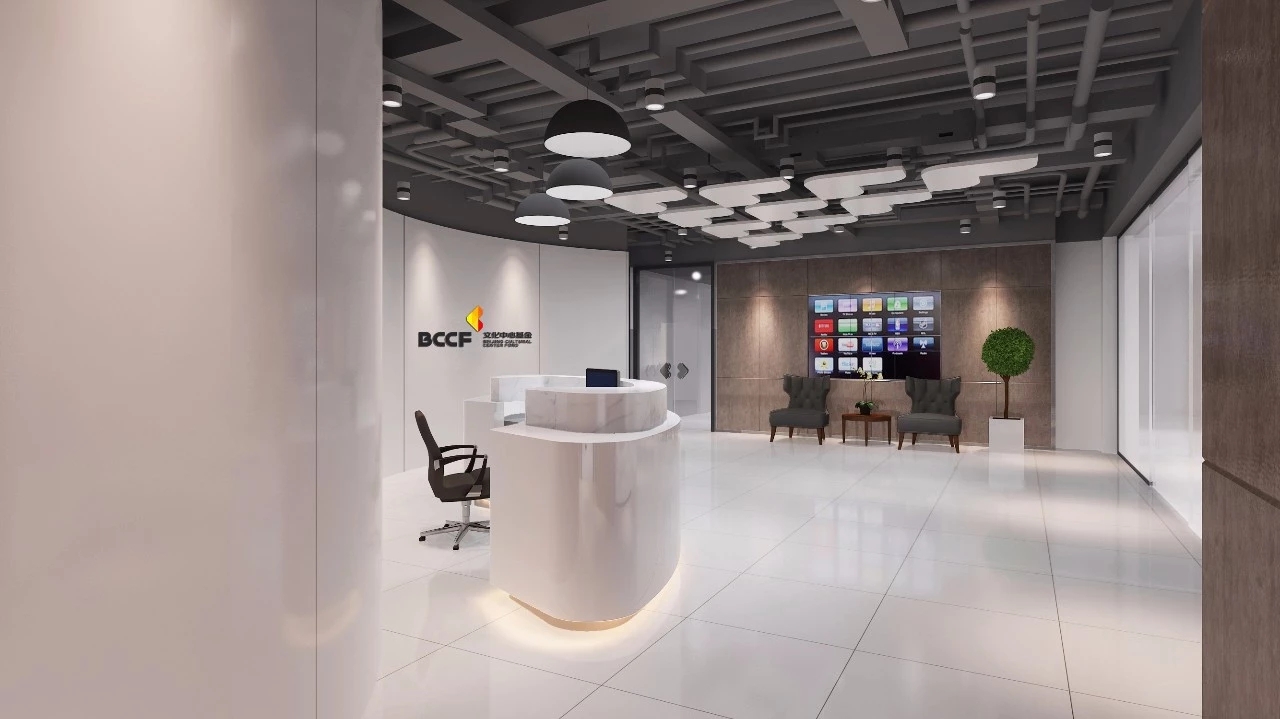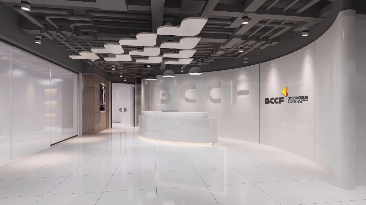 文化基金中心,以文化产业投资为主的金融企业。设计上以鱼(余)为设计理念,前厅弧形形象墙以水作为设计线索,天花局部吊顶以标识阵列的形式排列,由主入口向接待台和形象墙聚集,意喻企业蓬勃发展和财富的聚集。