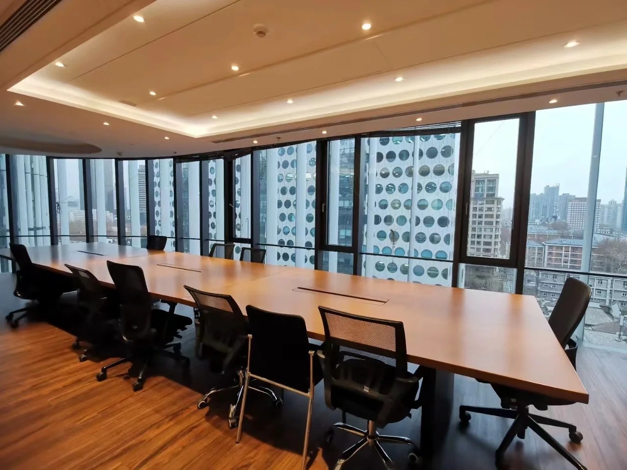 7層辦公區域用大面積金屬網天花來營造空間的開放性與通透感,在前台重點區域用到一些折線的造型來呼應萬科「V」字形象,體現出萬科追求卓悅的企業文化。圓形大會議室為萬科雲城總部最大的一個會議室,對隔音、吸音的要求較高。因此設計師大面積採用吸音板局部做休息壁龕,並用萬科紅來呼應企業的文化特質。