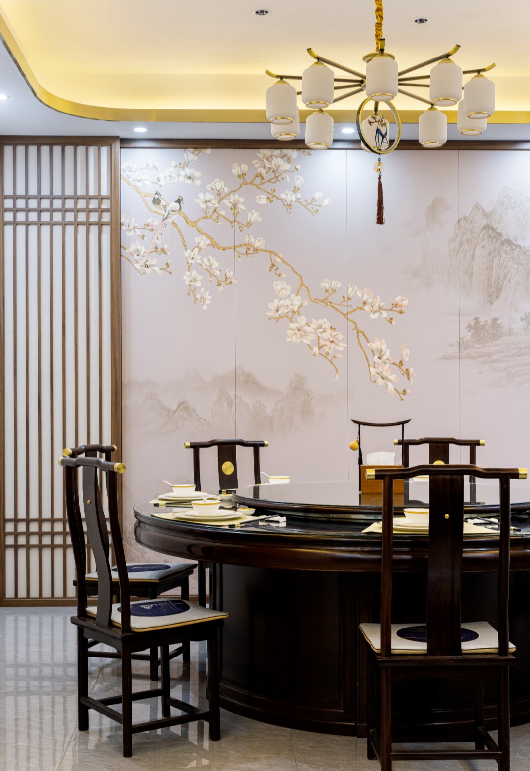 与茶室比邻的区域,我们做了一个餐厅区。这里有我们自主研发的“缘桌”,平时,同事时常在这里就餐。有时也会作为招待我们的朋友、业主的空间。我们在这里渡过很多个难忘的夜晚。