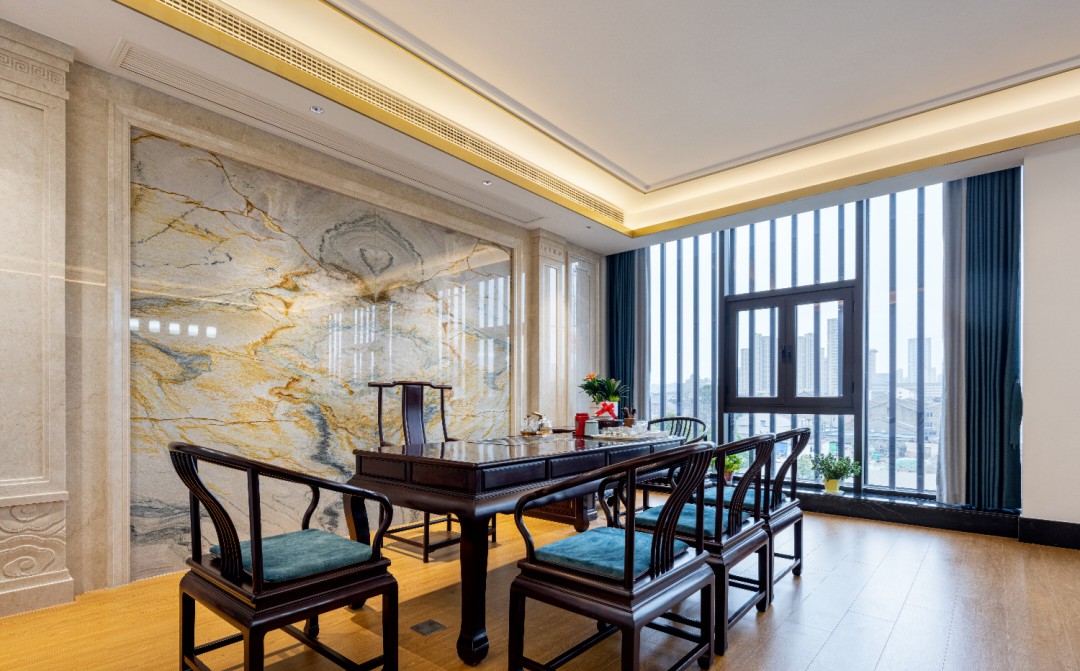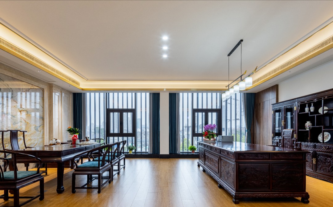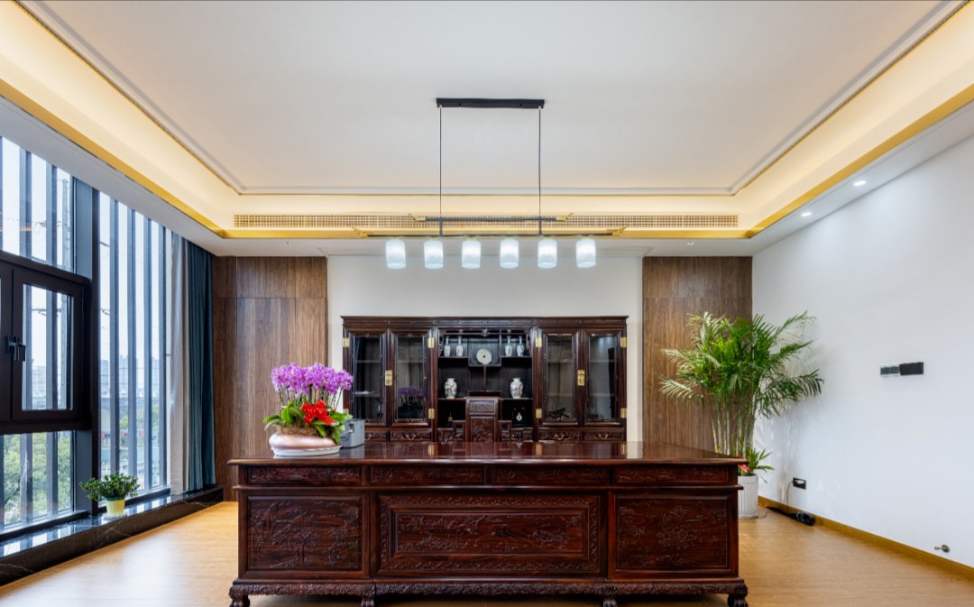 顶面的形态如流水般在空间里缓慢流淌,柔美弧线映衬建筑外立面的美感,让接待前厅和会议室的顶地合理地联动起来。