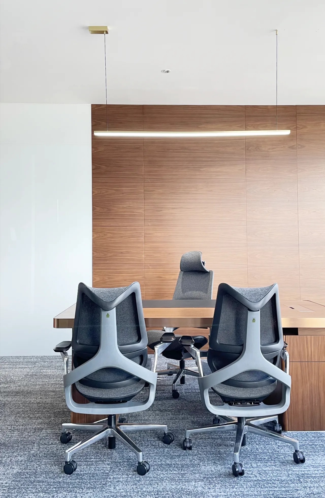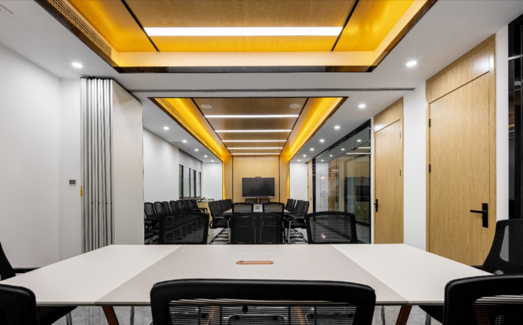 大、小会议室以灵活的隔断进行分割,开合之间,满足不同人数的会议需求。顶部的木饰面造型和灯带,将注意力瞬时聚焦到会议场景。银黑的极致运用,铺垫自信专业的职场气度,让身为宝基人的使命感与责任感油然而生。