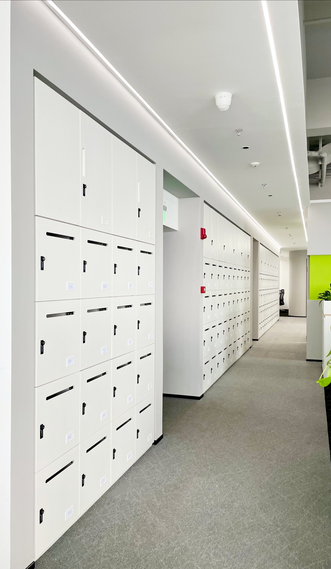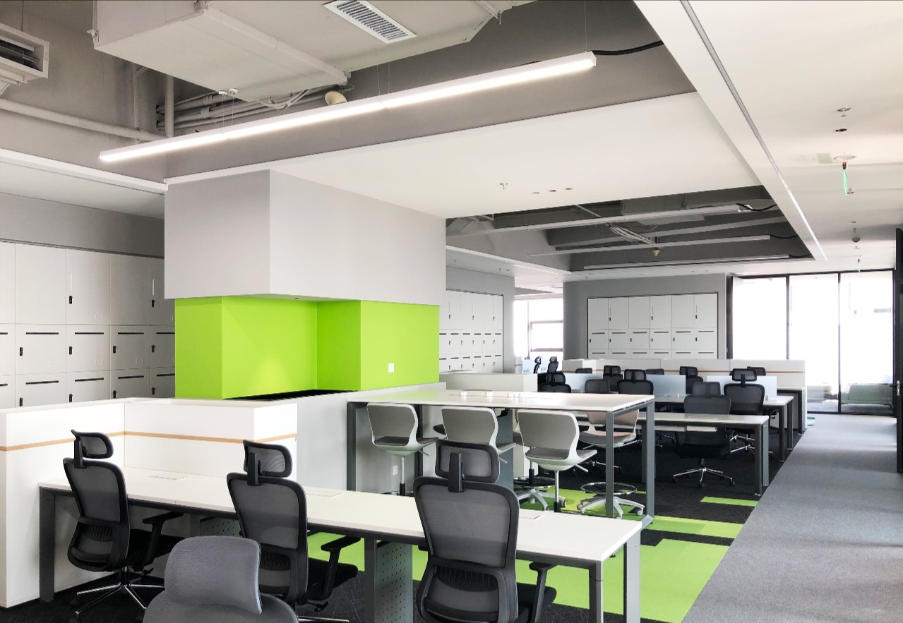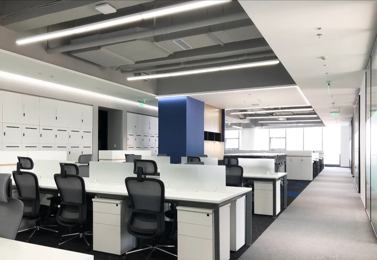 设计师利用原有的造型和材质进行搭配,加装线性灯,更换灯具色温,增加钢柜和局部不锈钢修饰,打造出简洁、干净、明亮的视觉系统,唤起人们对于企业专业性的认可。
