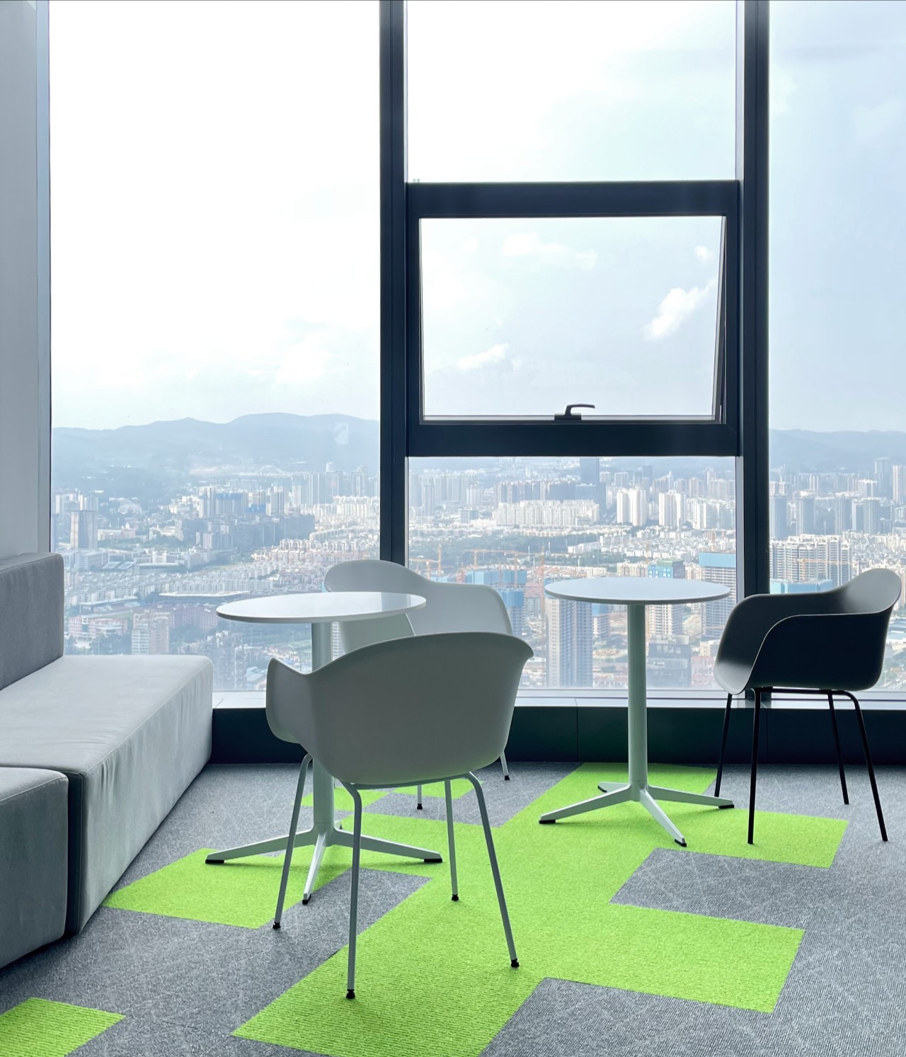 接待大厅设计兼具接待,会议,休闲,沙龙活动,茶水吧等一系列功能。大面积的幕墙玻璃完全开敞,将昆明城市景观引进室内,在此,人们既能感受到被尊重,也能自由地交谈、走动。