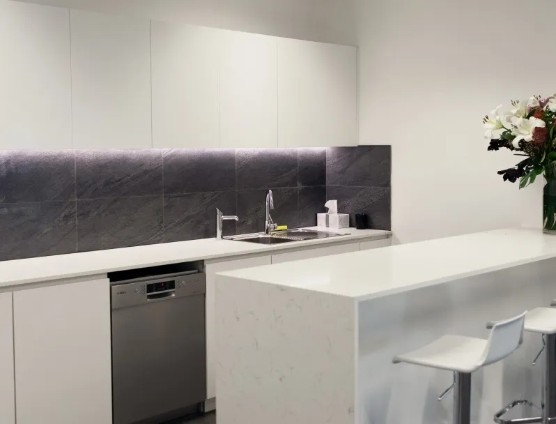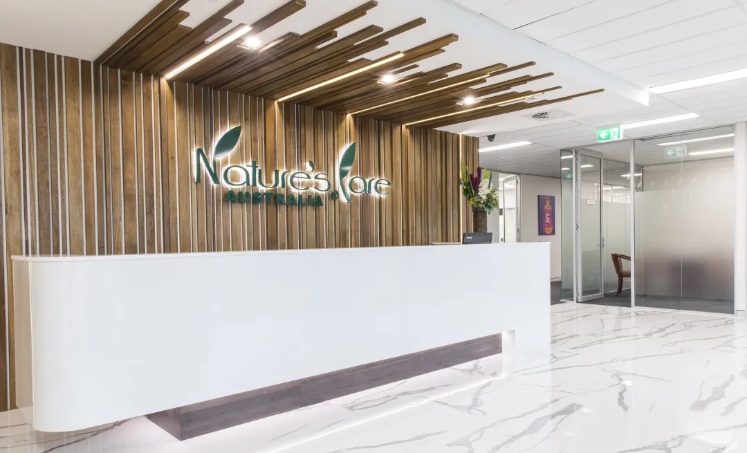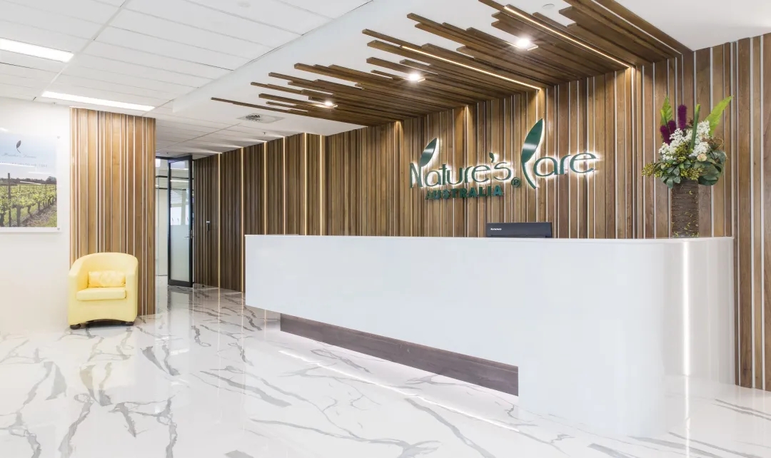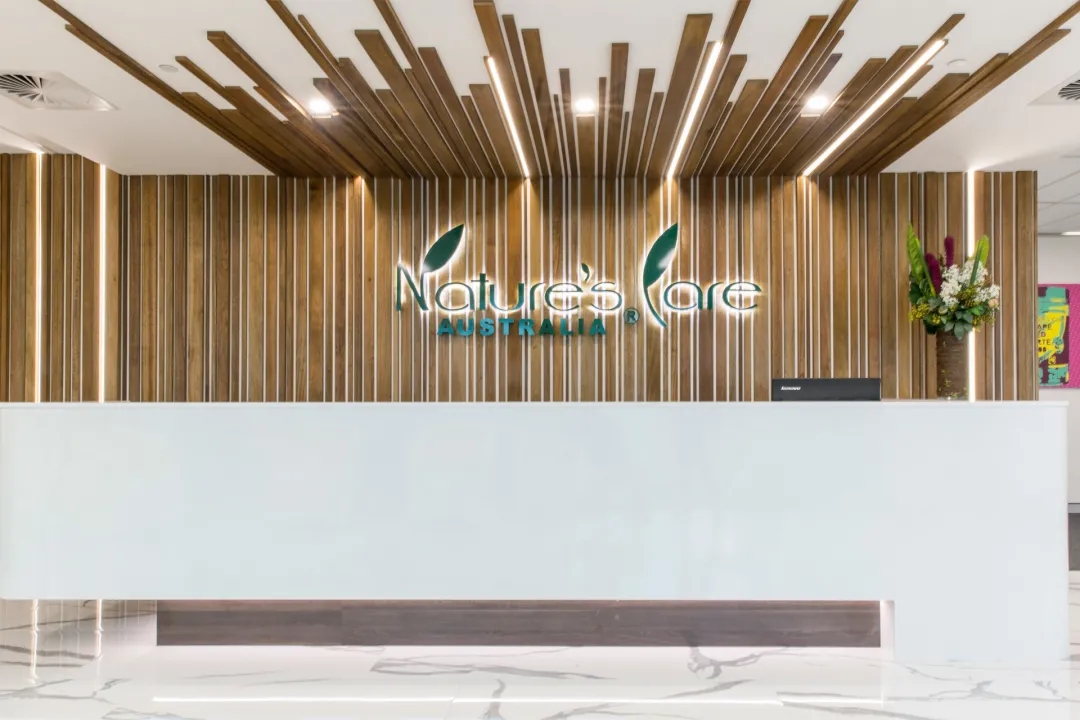 白色的前台后面搭配不规则木制板材与灯带巧妙结合做成的背景墙点缀着内发光的绿色的品牌logo设计感十足的同时又体现品牌自然健康的概念