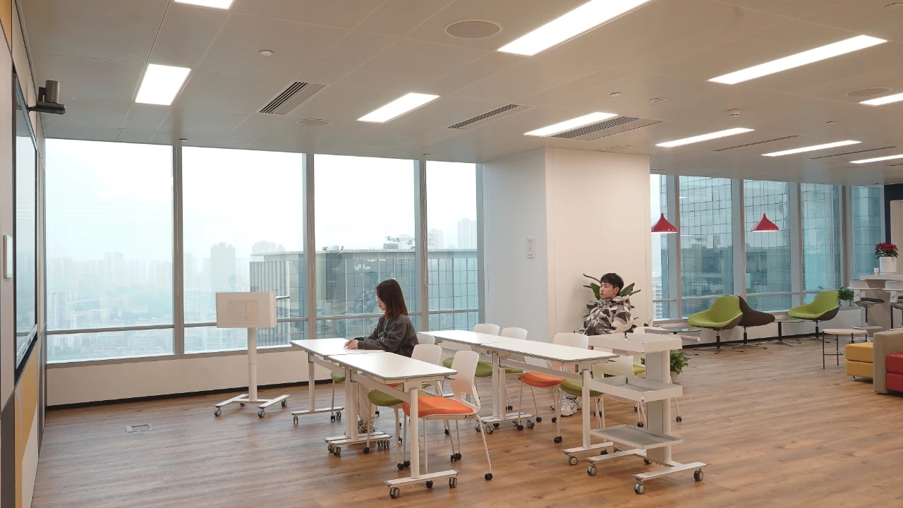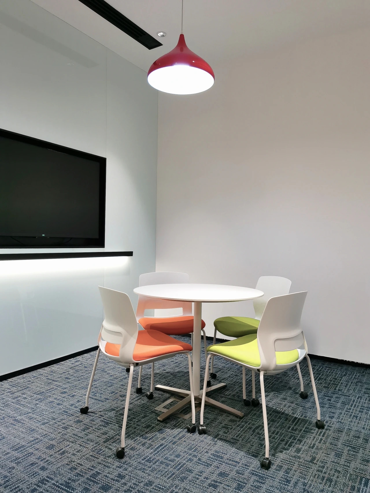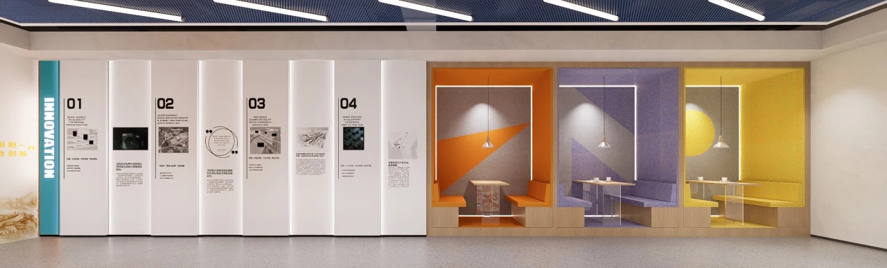 考虑到各种不同的空间属性,用交错的色彩来划分区域,形成视觉上的统一性,并为空间带来灵动和活力。橙色代表“社交区域”,橙色带来活跃的气氛,热情和有创造力的商谈在此展开。