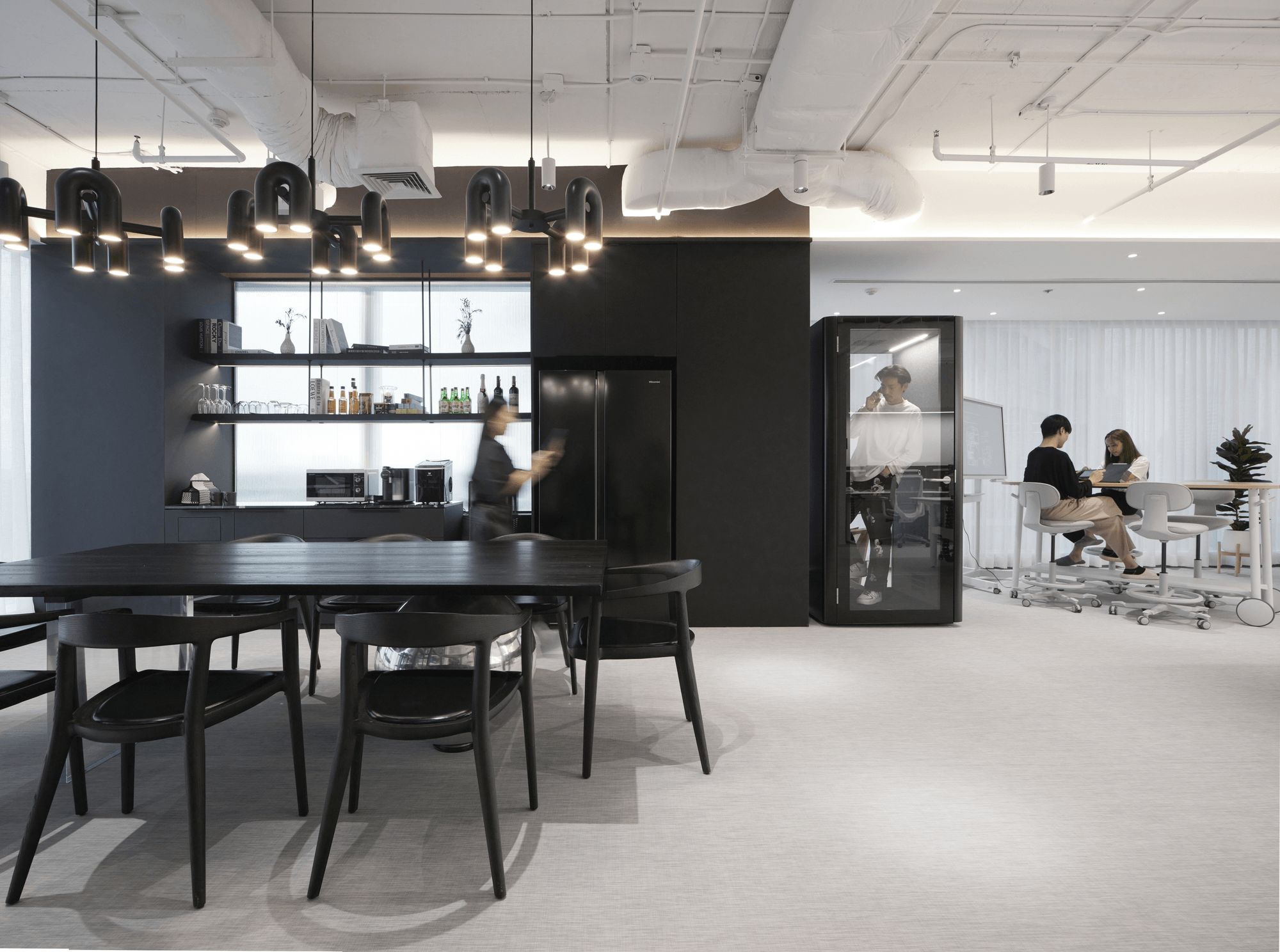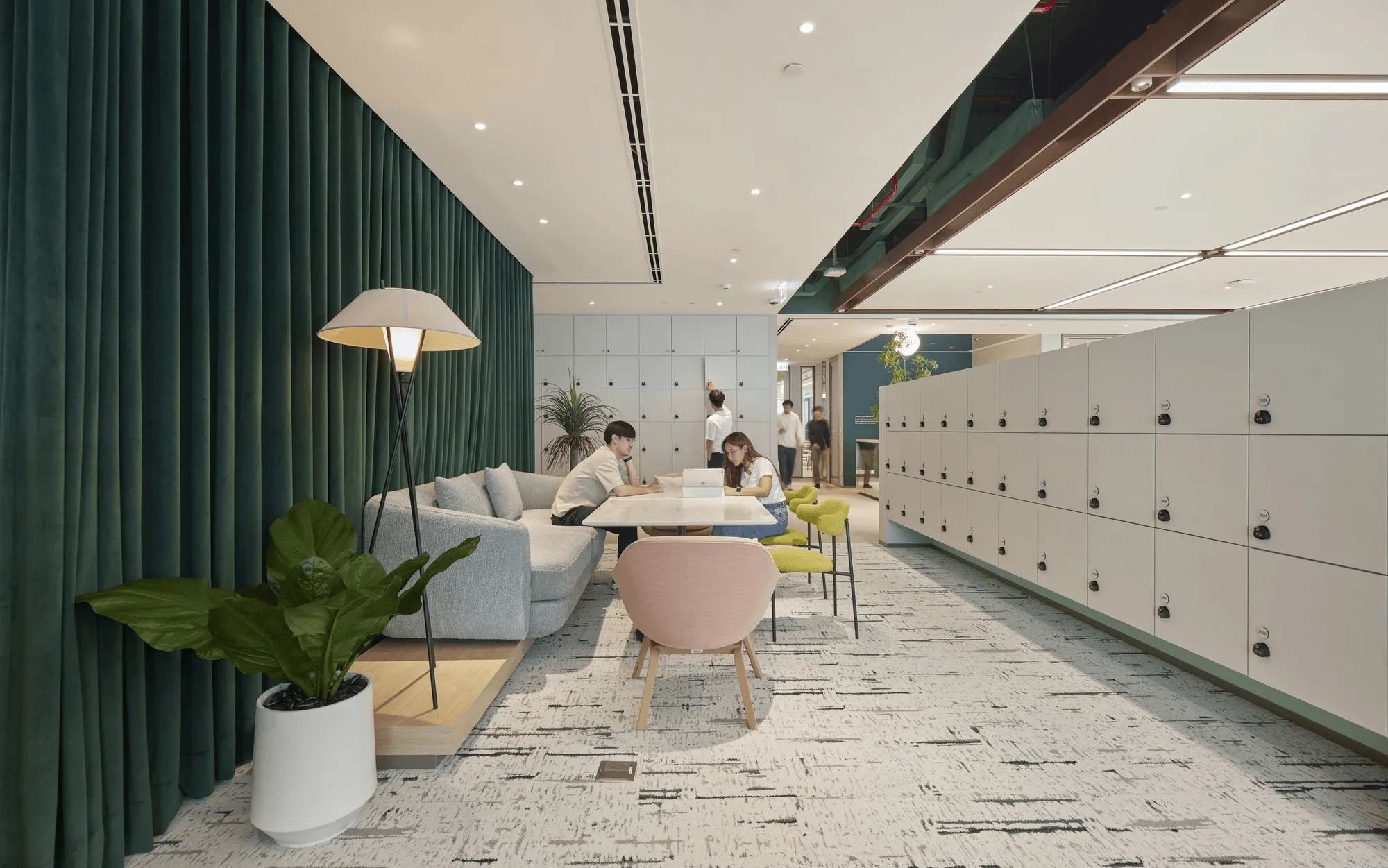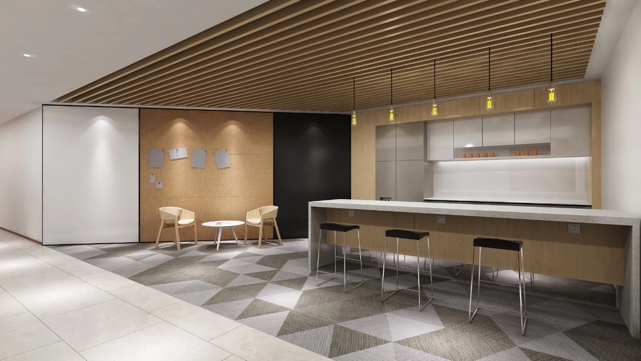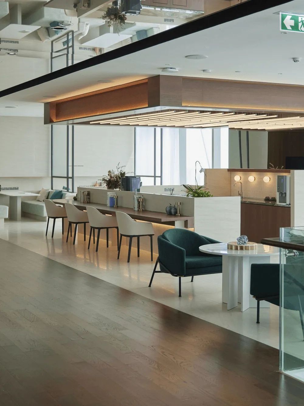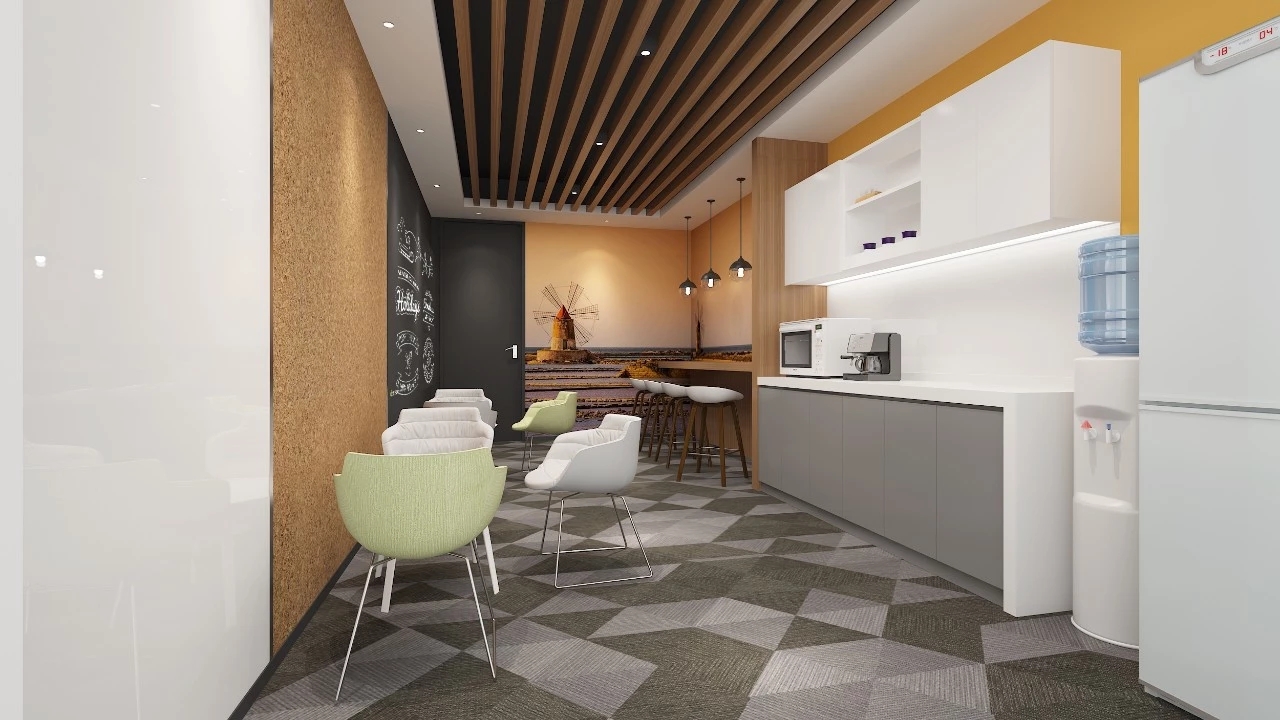值得一提的是,设计师将前台设计为形成弧线的引导,很自然地将人们的视线导向一旁的综合休息区。舒适的沙发,随意摆放的休闲座椅,既有自由开放的公共空间,也可以供1-2人安静地交流思考。你可以取一杯香茗,也可以泡一杯咖啡,或优雅、或俊逸。无论是聚会,还是庆功,或是一段头脑风暴的思维碰撞,总能留下几个时刻让你难忘。