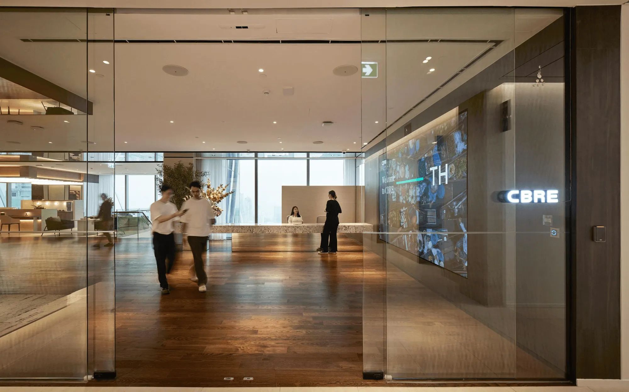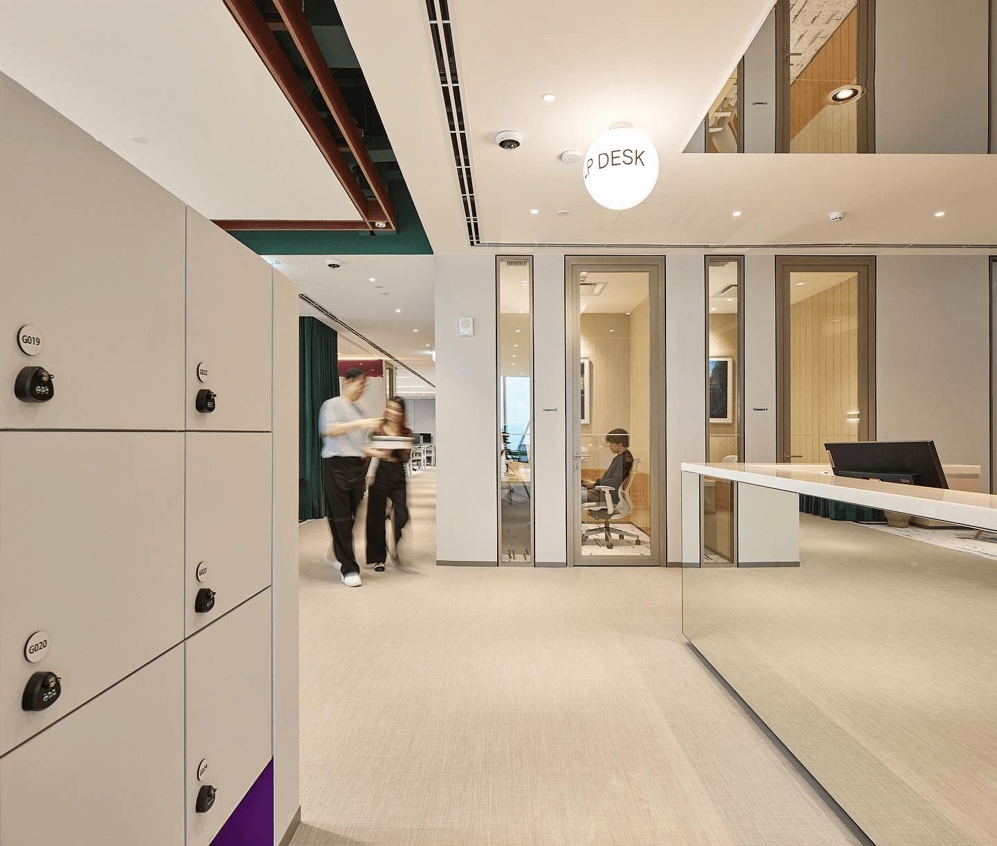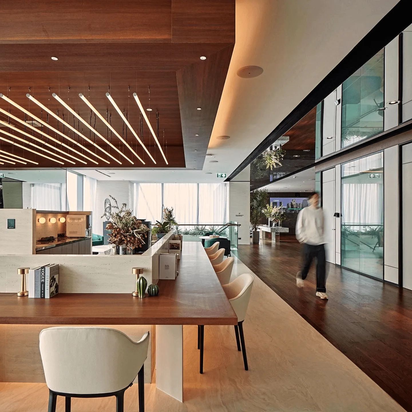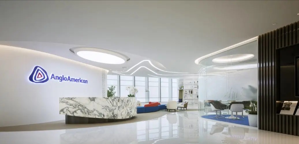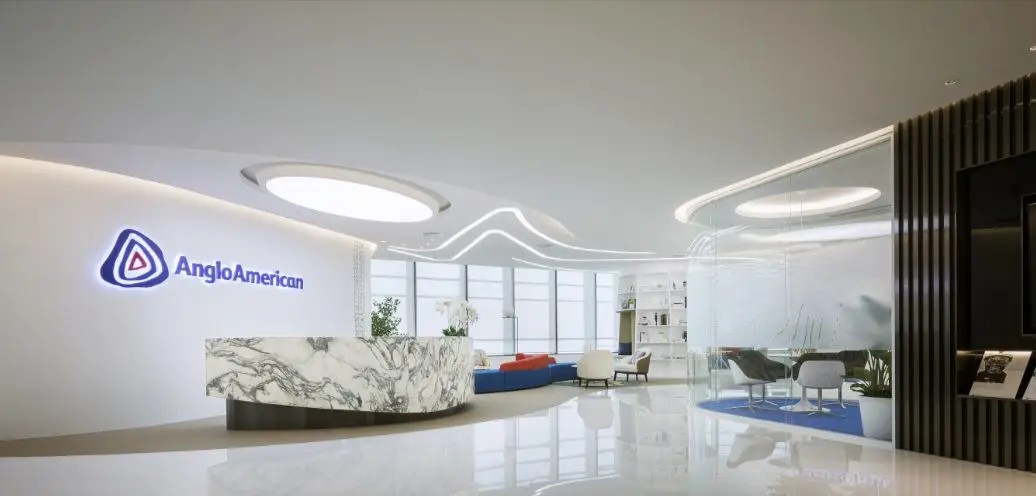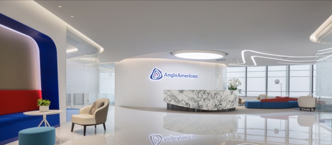 走出电梯,醒目雅致的色调吸引我们的视线。玻璃门后,第一瞬间占据视野的是“Anglo American”特点鲜明、红蓝相间,由地质等高线构成的Logo,也是设计师的色彩灵感之一。山水纹石材的前台,体现几分东方水墨意境。巧妙的是,山峦叠嶂曲线变化的天然材料从质地、图案、寓意等多方面呼应了英美资源集团的业务本身,也表达了对自然的敬畏。