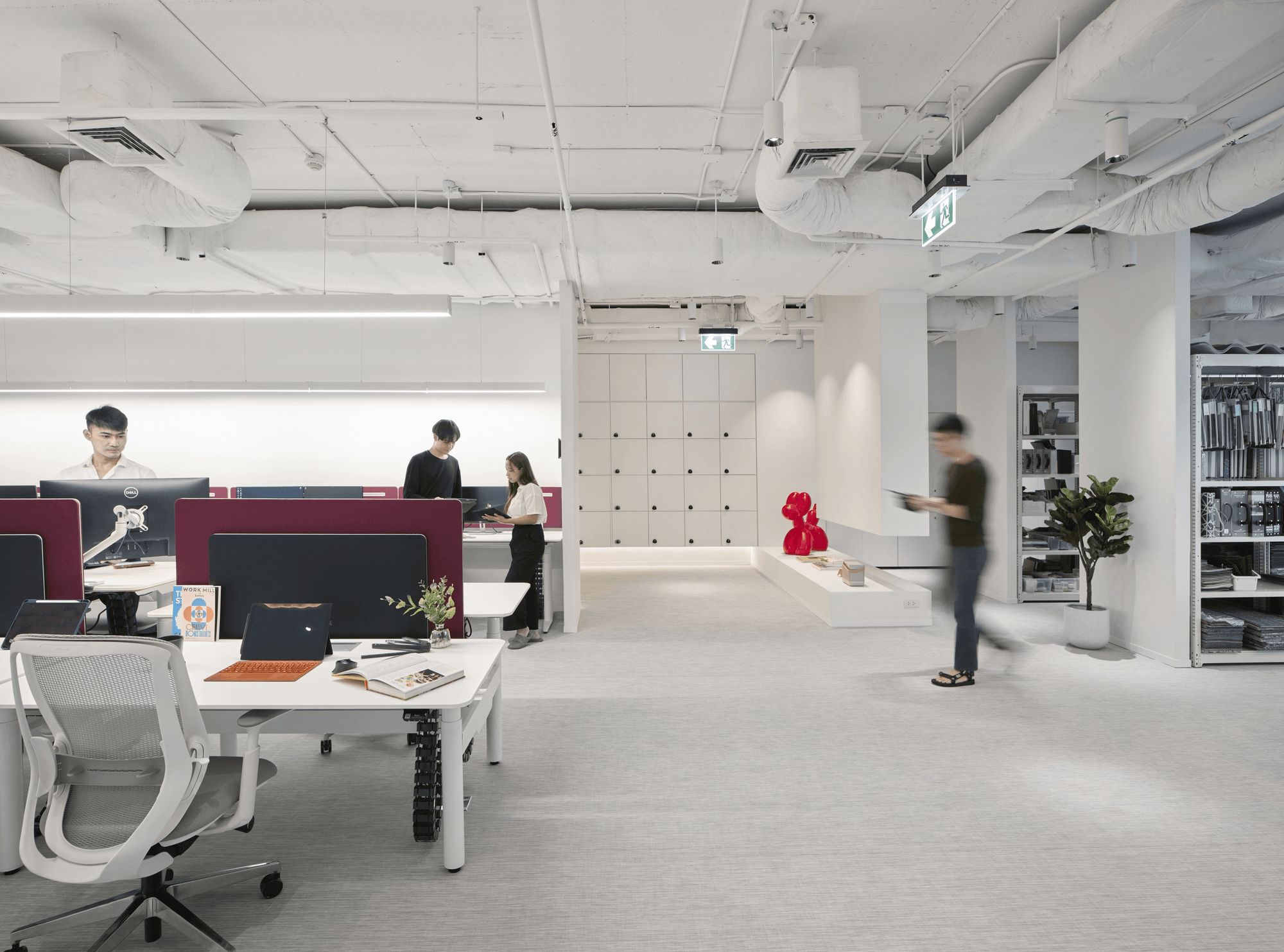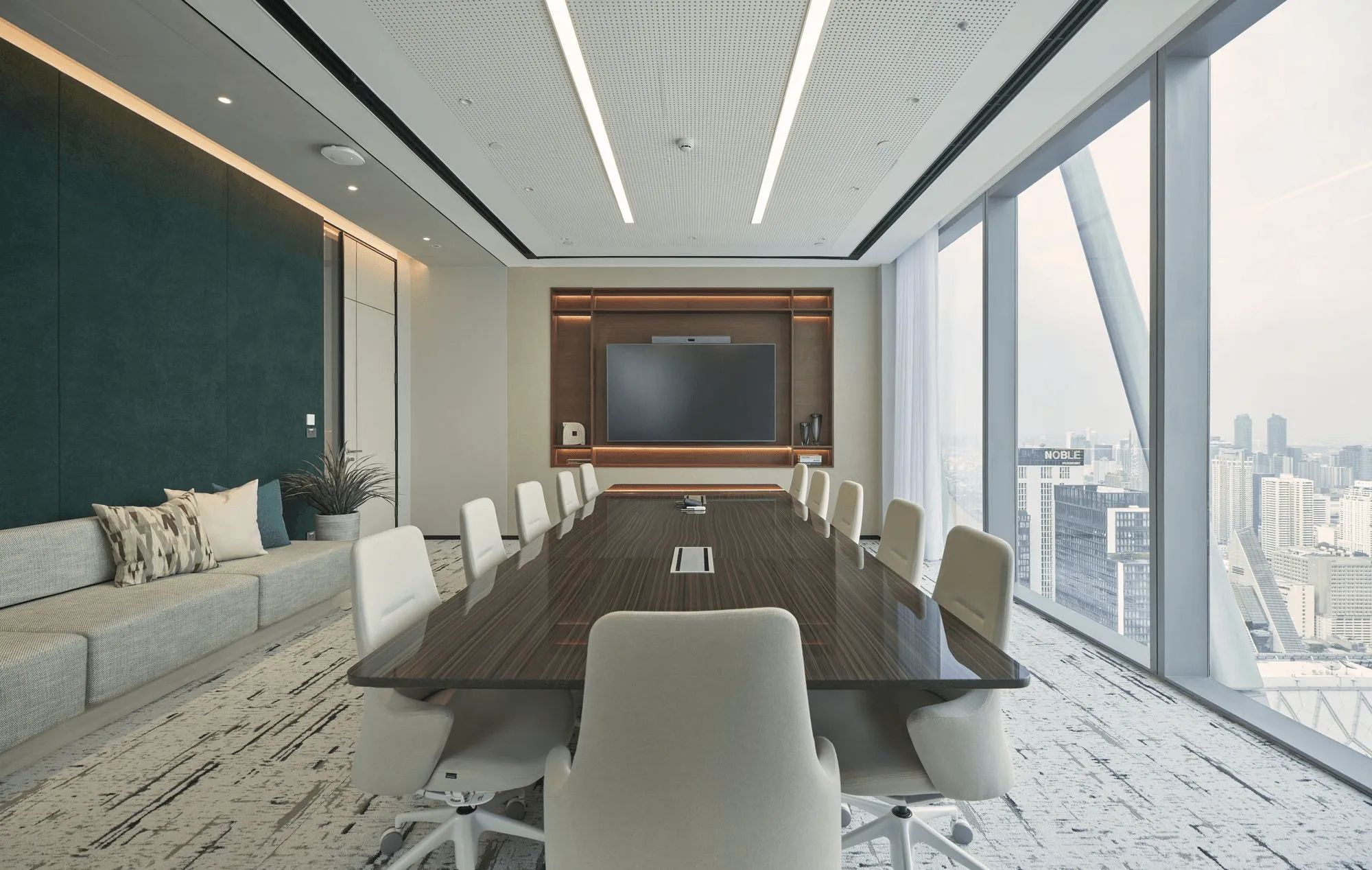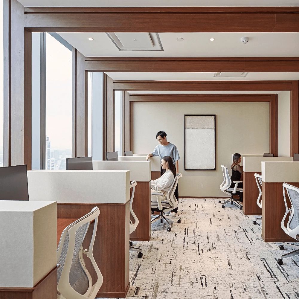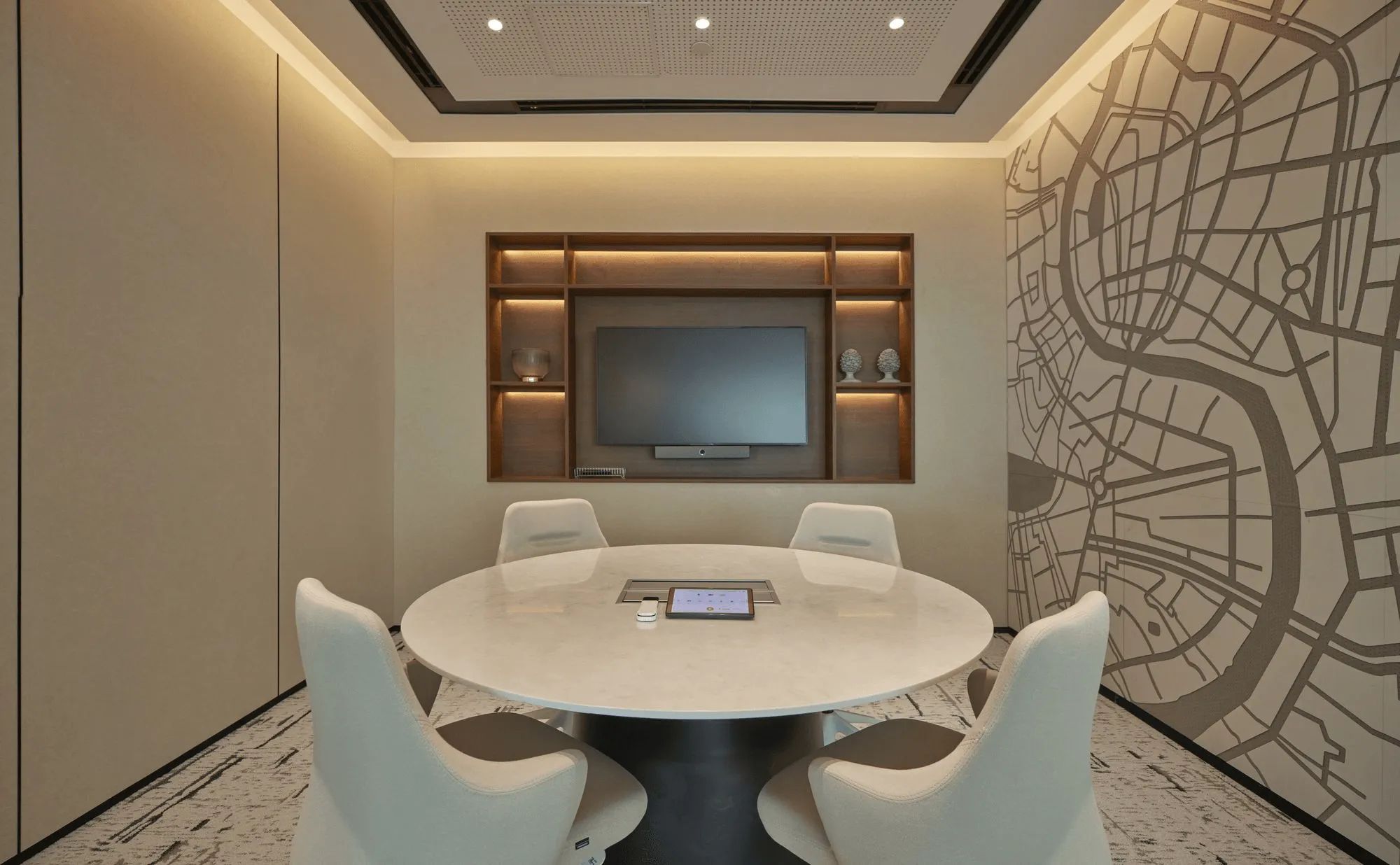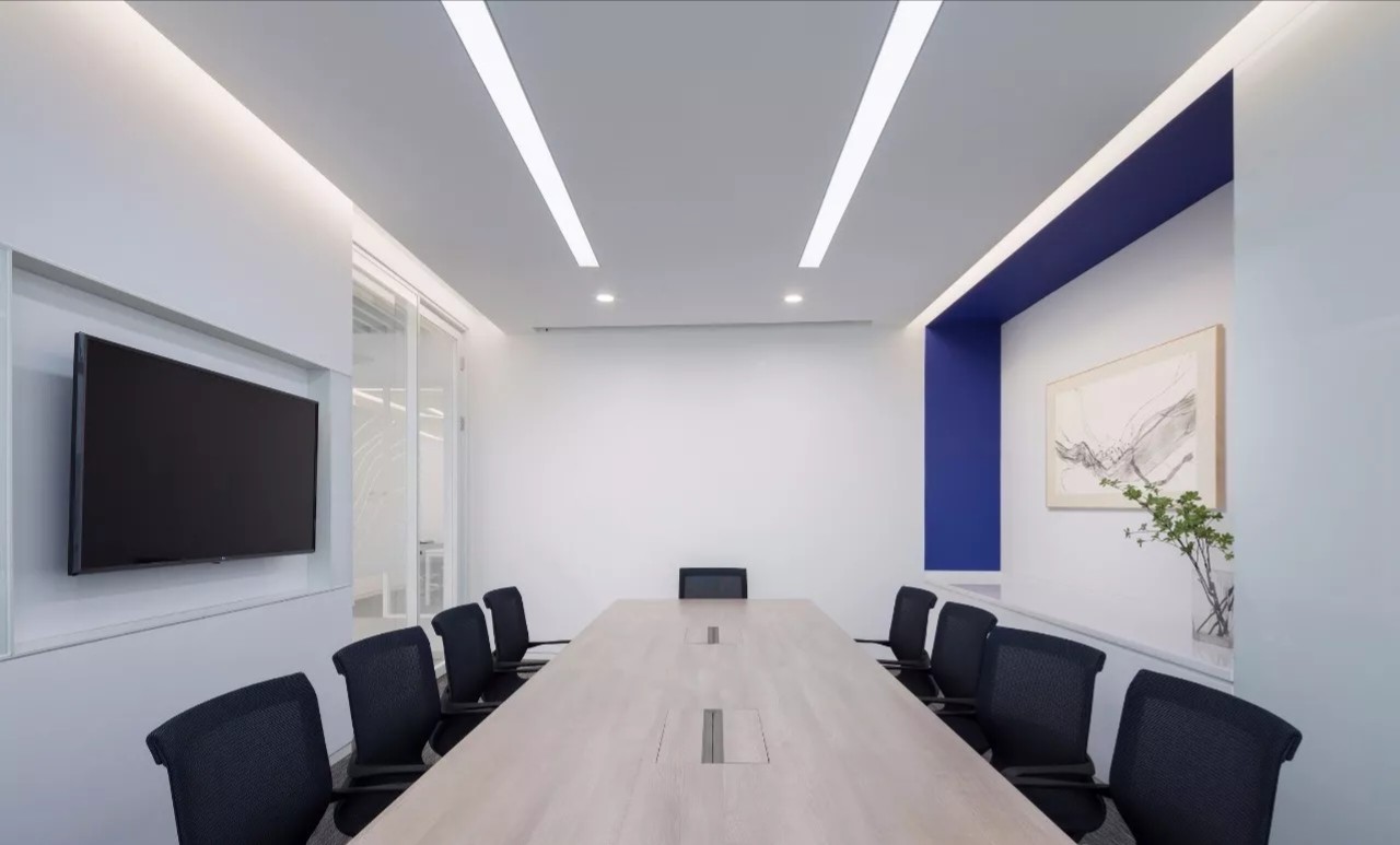 沿着地面钻石状菱形的白色石材走进空间,会发现地质等高线的元素无处不在。Insideco的设计师为了延续地质等高线的品牌形象,在天花板的采光部分使用了软膜天花的工艺包裹光源,贯穿了曲线绵延的视觉效果。流线地毯与天花灯带交相辉映,一步一景亦融合,令整个空间的层次生动有趣。不仅彰显设计师在细节处理上的独到之处,更是将英美资源集团的品牌形象与办公空间设计精妙融合。