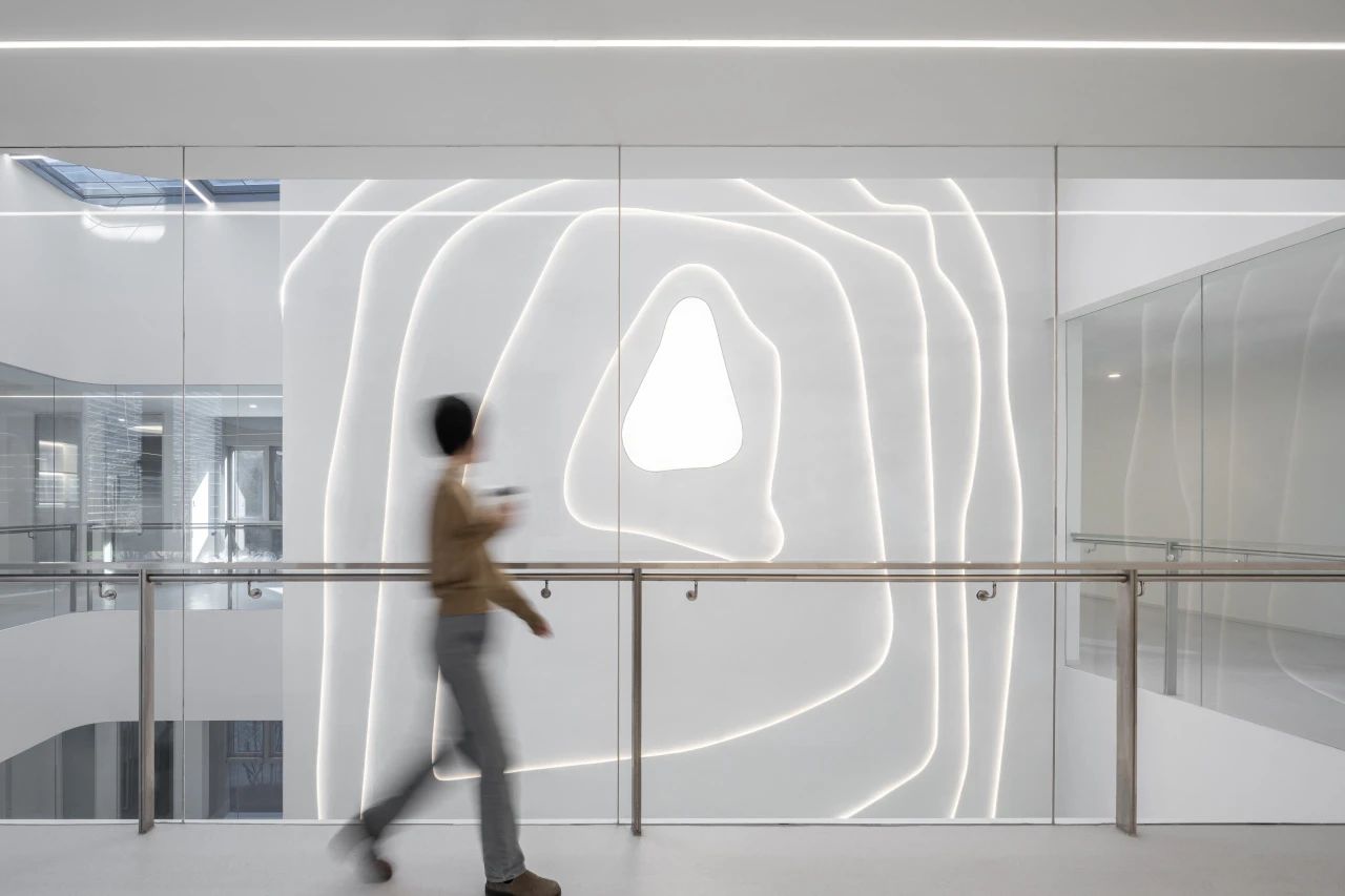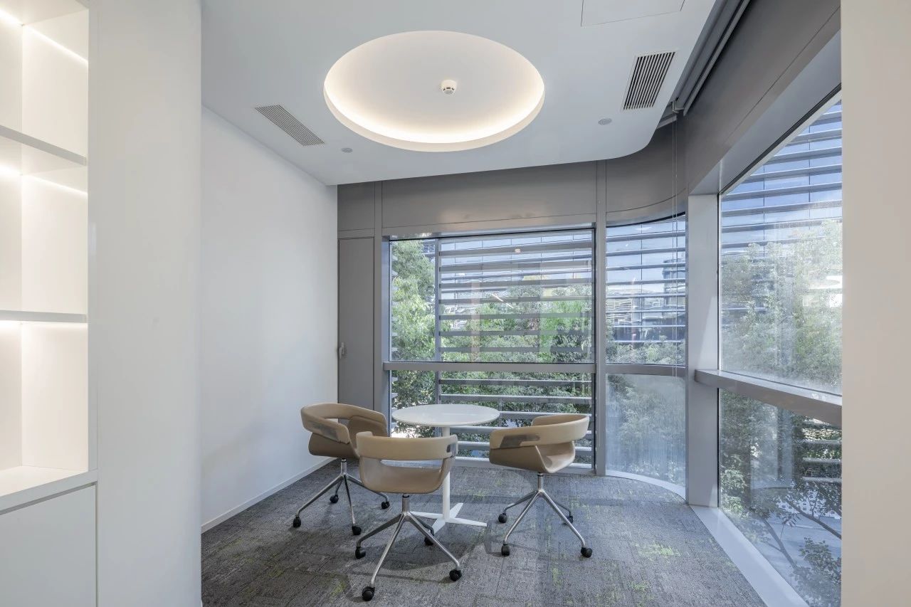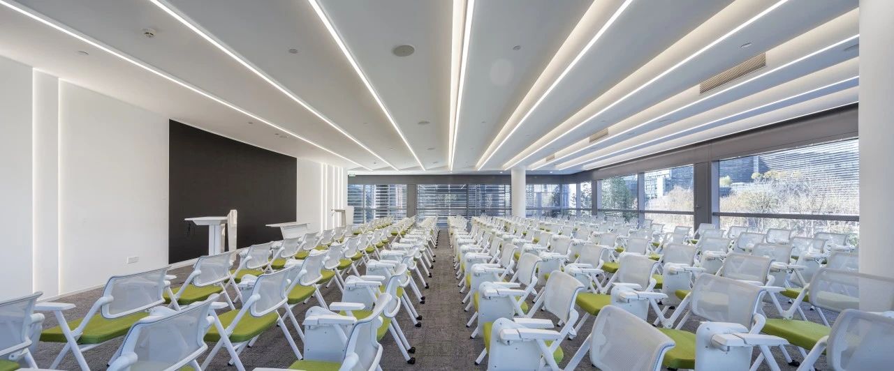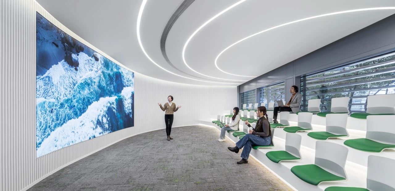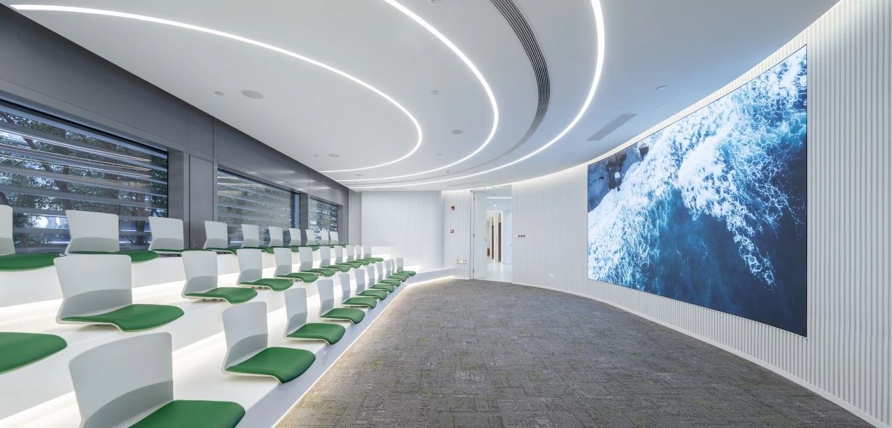 不同功能大小的会议室阶梯教室和培训中心集中在二层代表着思想的汇聚我们打破传统培训场所严肃、秩序分明的印象用不规则的弧形灯带升级美学趣味配合卡座带来的观影感增强员工的参与感与归属感