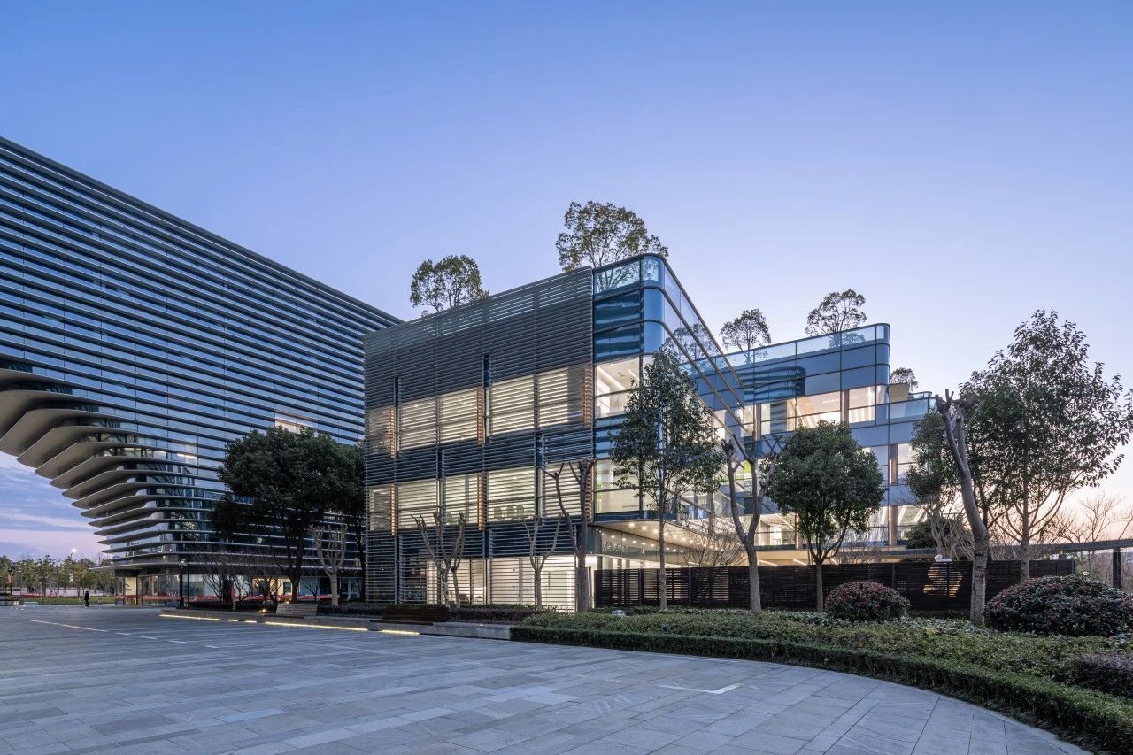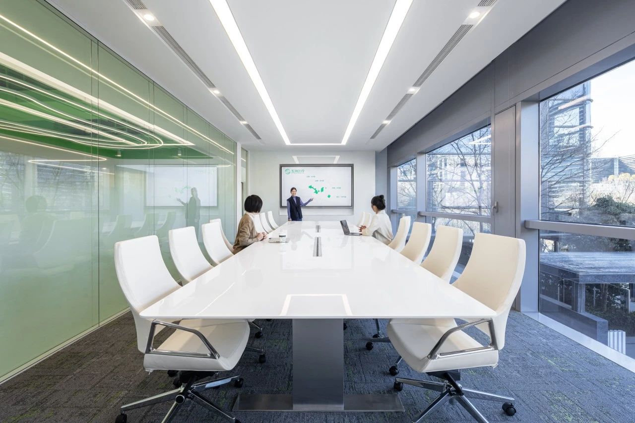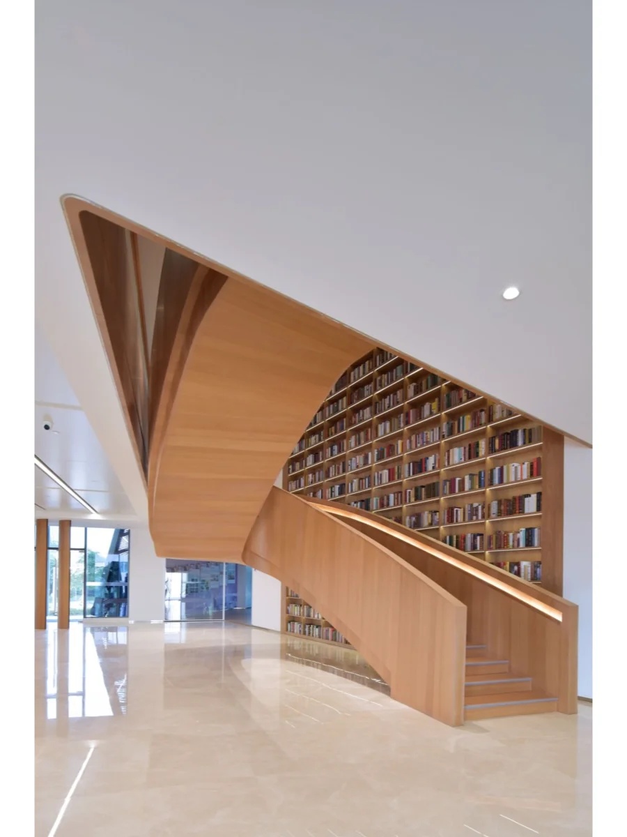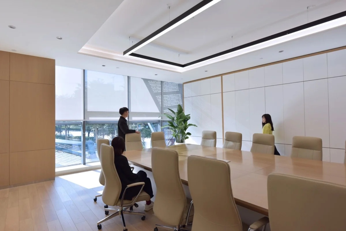 不同功能大小的会议室阶梯教室和培训中心集中在二层代表着思想的汇聚我们打破传统培训场所严肃、秩序分明的印象用不规则的弧形灯带升级美学趣味配合卡座带来的观影感增强员工的参与感与归属感