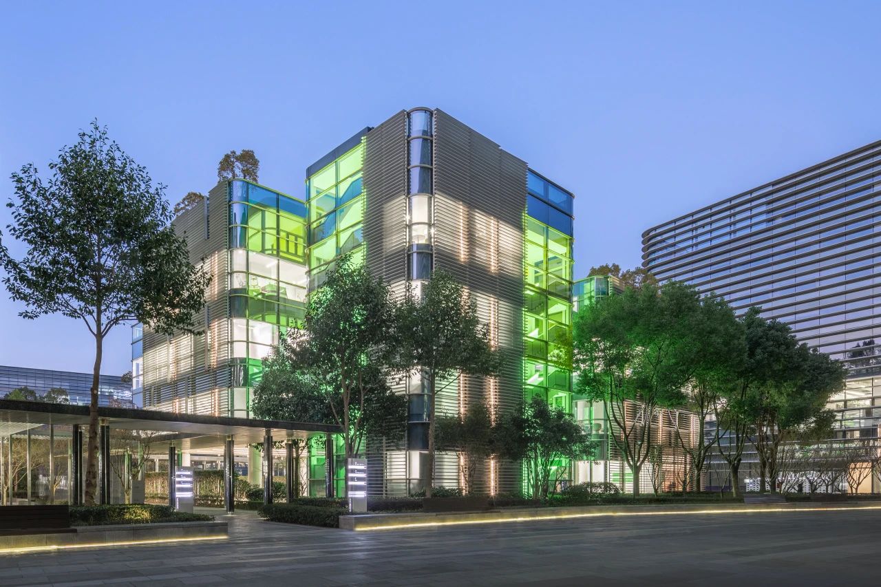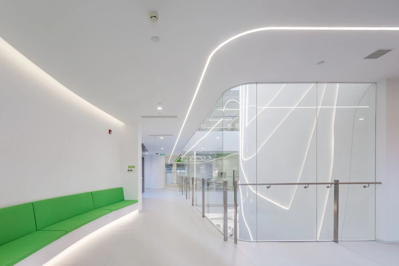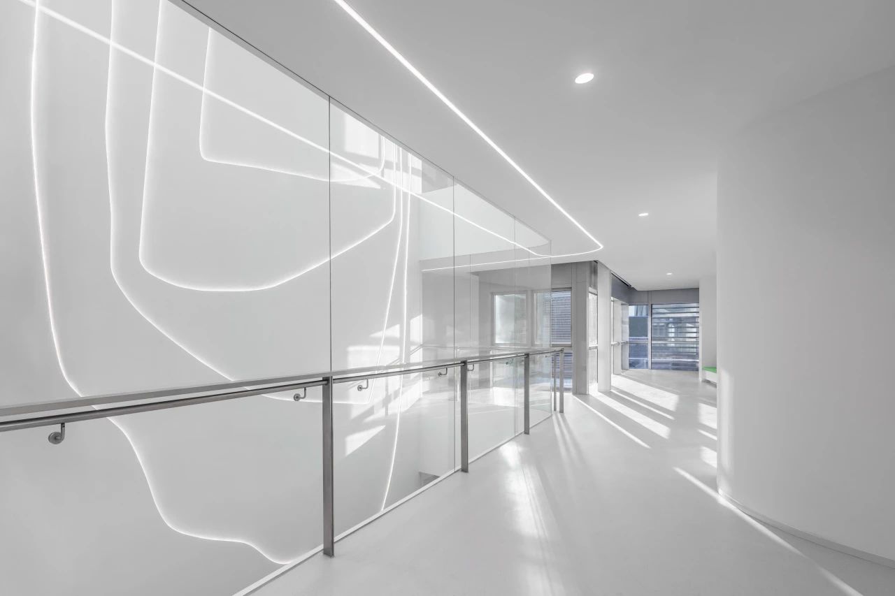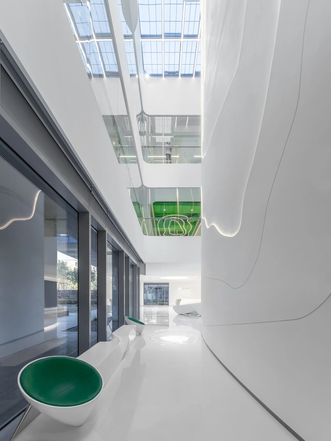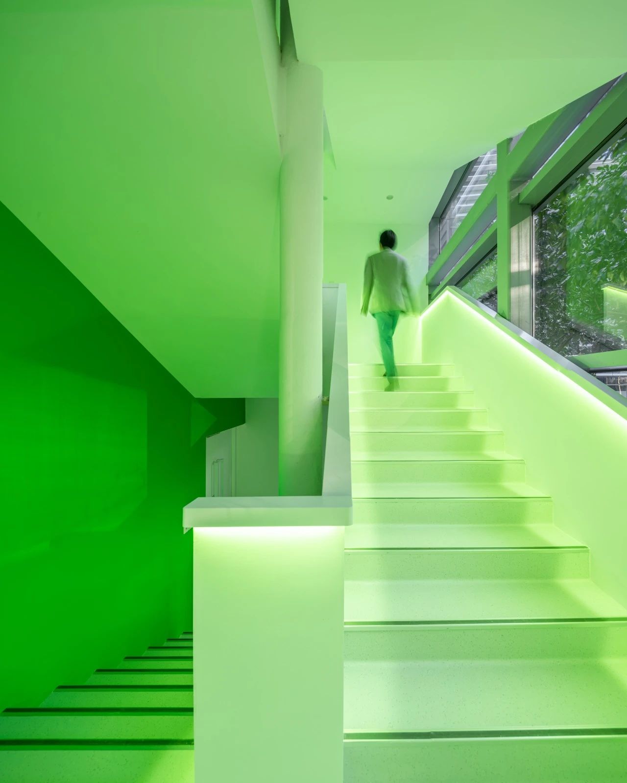 通过光效设计这座独栋从下至上楼梯的绿色光影由浓变淡生命力不息不靡的动态感跃入眼帘