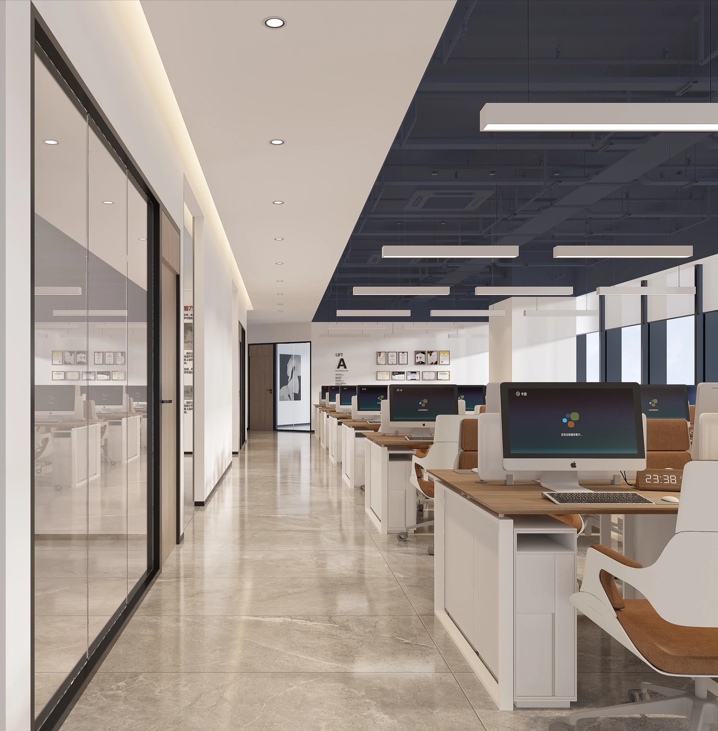 为了提高办公的舒适性和效率,设计师将综合办公区设在二楼,除了独立的经理室和高管办公室外,通过中部回廊的设计形成了办公室空间的天然分隔及动线划分,保证各个不同区域的独立性和相对安静的办公环境,令工作效率和人员关系得到优化和改善。