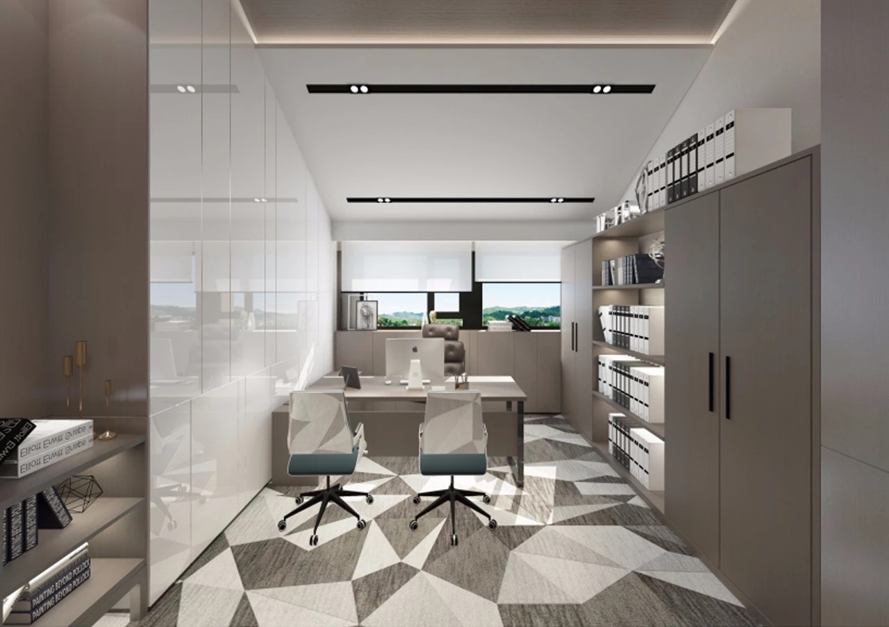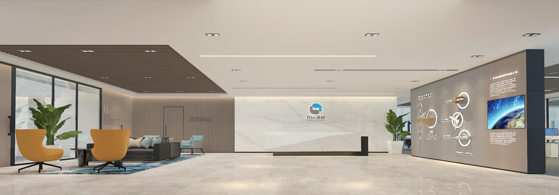为了更加贴近公司的行业属性,以及对全球业务发展的办公需求,设计师从甲方行业相关的矿石元素中得到灵感,并运用了解构主义手法,对矿石造型进行抽象切割,形成了简约时尚且具有公司业务特征的办公空间。