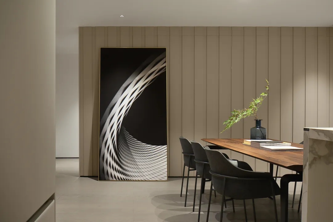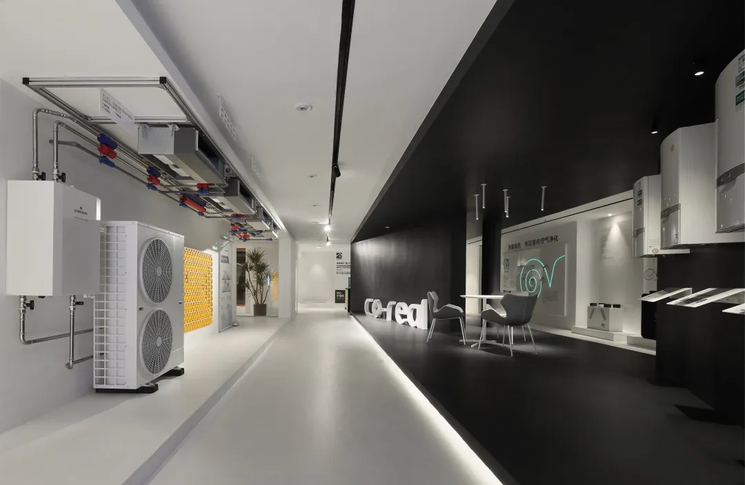 在智能家居展示区内,简洁的视觉表达和空间装饰,包含了沟通与传达的力量。空间内设可瑞舒适家的四恒系统,保证了整个空间恒温,恒湿,恒氧,恒静,而智能系统则保障了整个办公环境能舒适、便捷、智慧地运行。
