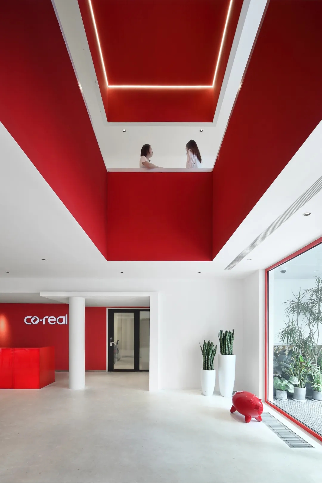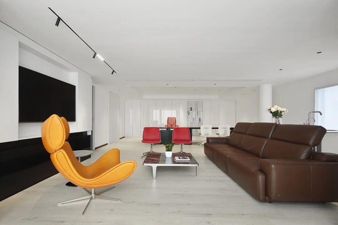共享大厅是平面动线和垂直动线的中心,为了协调空间的松、紧关系,设计师用一个挑高的中庭,把空间的尺度打开,呈现宏大的空间场域,整体感觉更通透。
