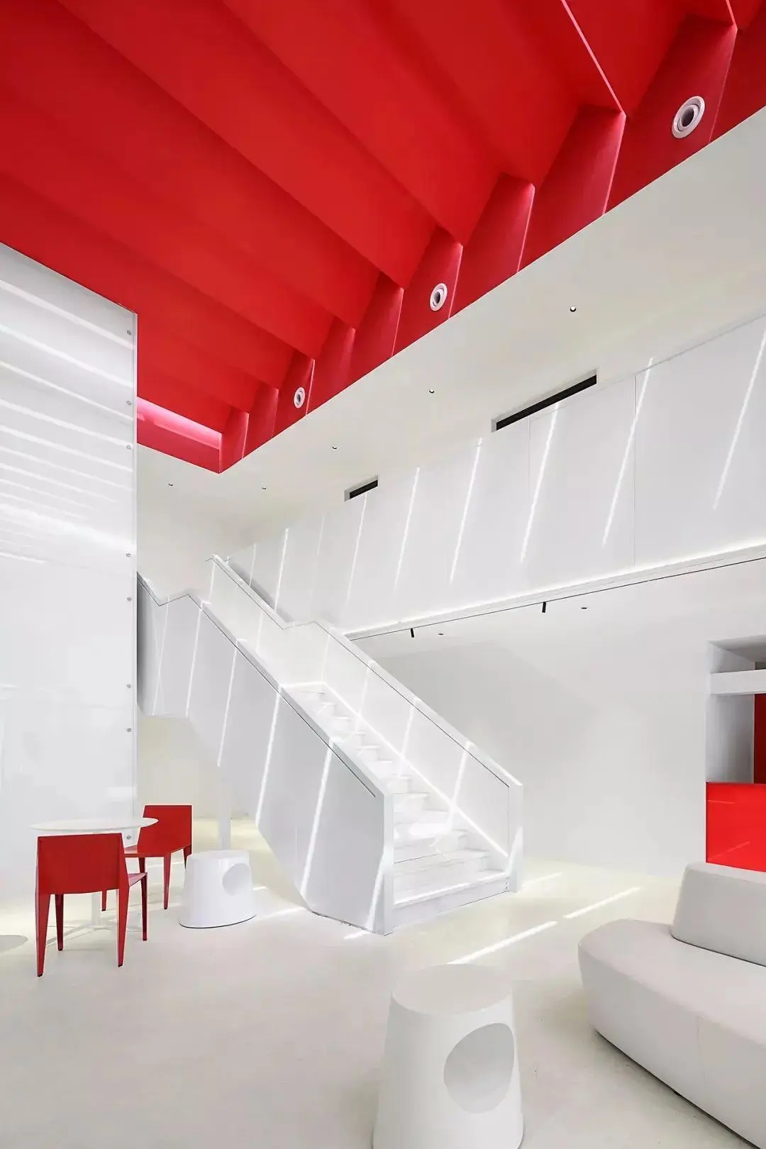 设计师注重自然光的艺术运用,通过对顶部折线形天花的处理,在折角处设计透光区,不仅吸纳了自然光进入室内,而且通过这些光线的变化,让空间使用者能感知时间的变化和光的律动。