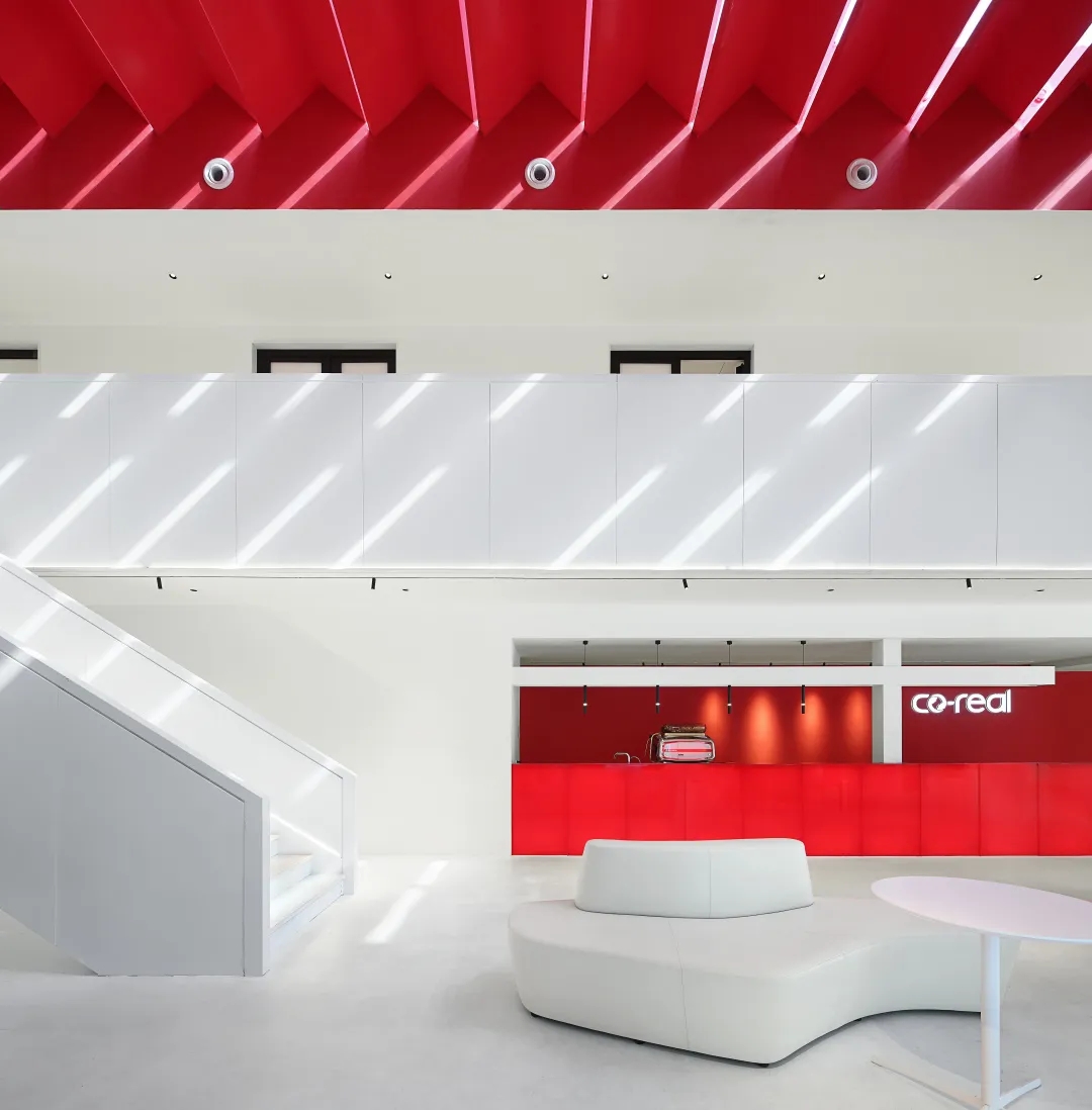 一楼的产品展示区设计研讨区和洽谈区,不同产品的每个局部展示空间之间有着相互衔接的关系,员工、访客可以自由穿行。而黑白的色彩变化则增强了空间的识别性,加上可瑞标志元素的运用,视觉体验上更加丰富。