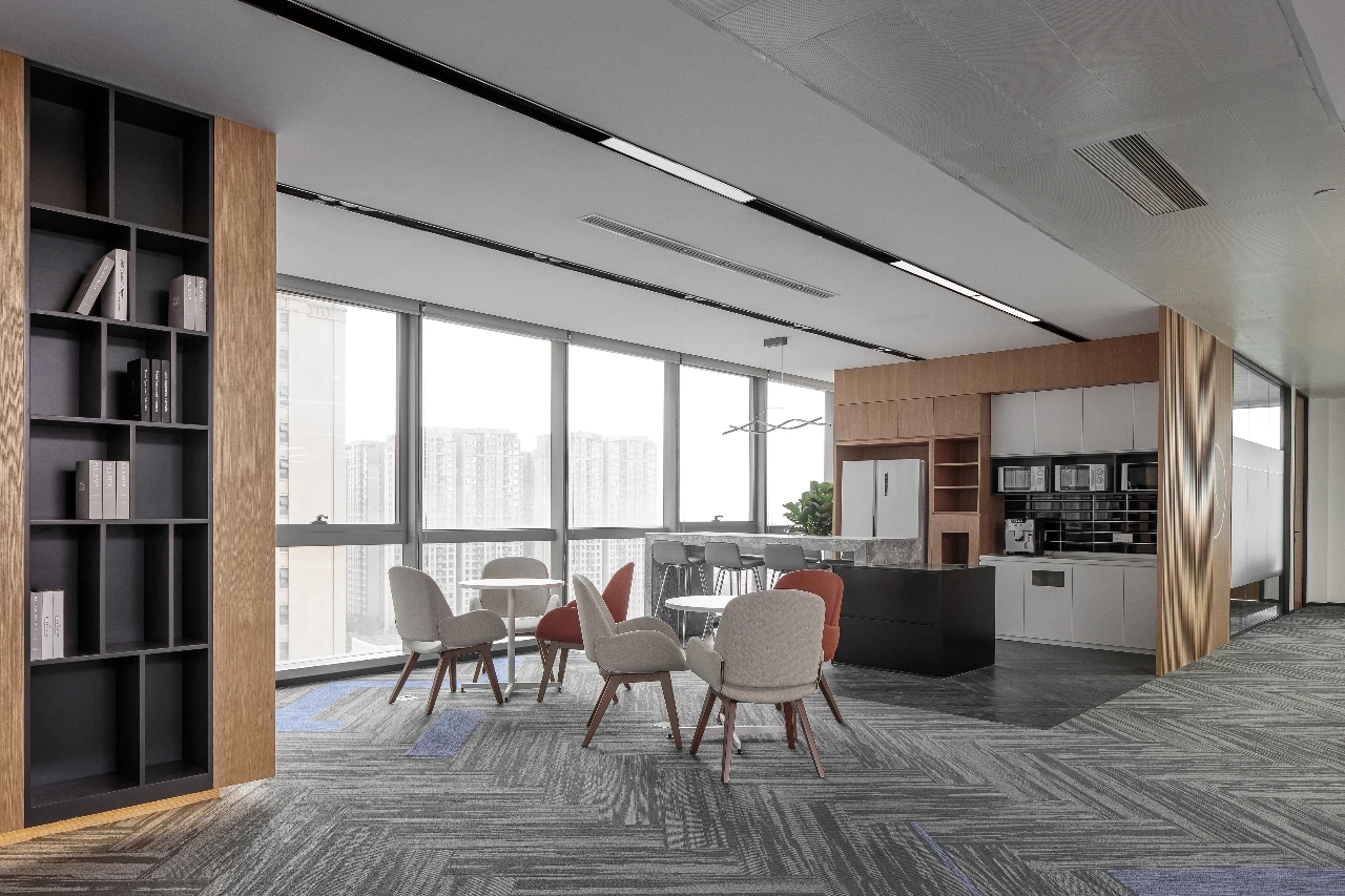 左边区域是以曲面构筑出的茶水间,完成功能的划分之余,消解了场景的孤寂,令人感受到空间游玩的趣味性
