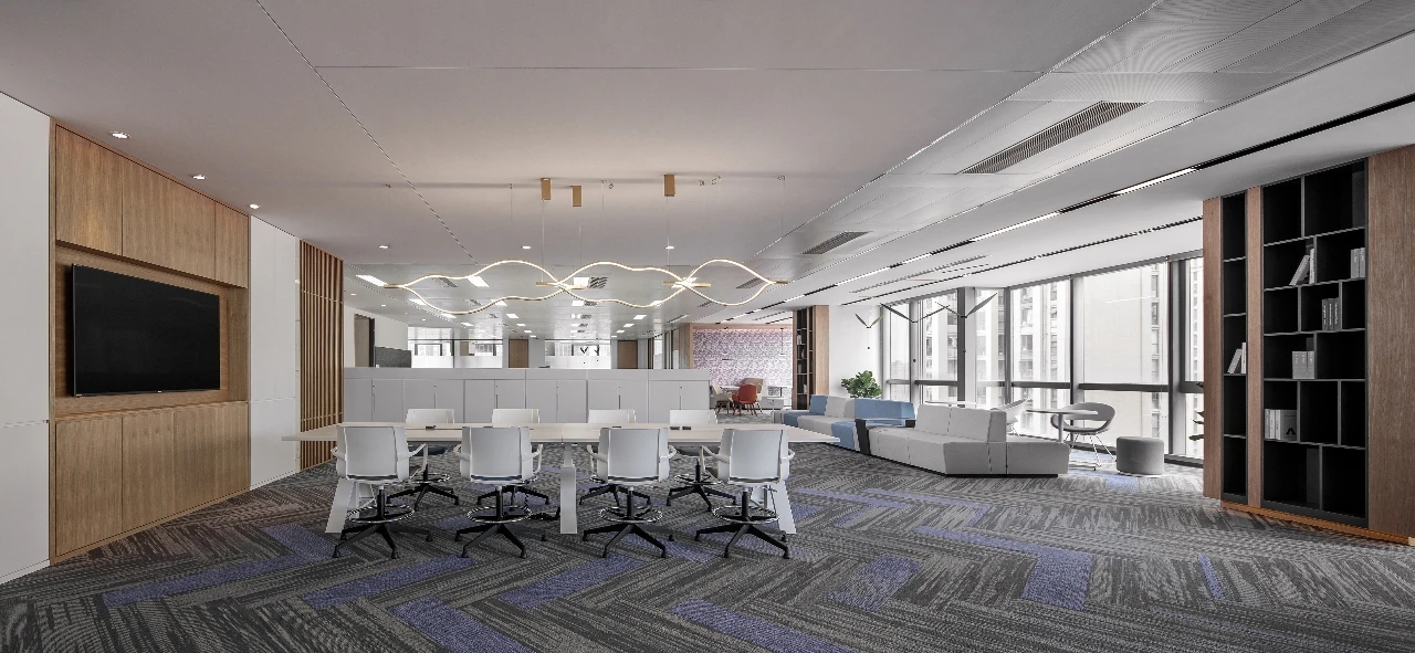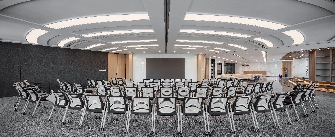 在中线位置的隔板完全关闭的情况下,钻石型的异形大会议室可分割为两间独立使用的会议室,且为了更加契合日常会议的使用需求,整体墙面采用着吸音力良好的硬包材质。而当使用者收叠起中线隔板,推开那面藏有巨幕LED的活动隔墙后,这里又可灵活转换为兼顾大型会议、职业培训、模拟法庭等其它用途的综合空间。