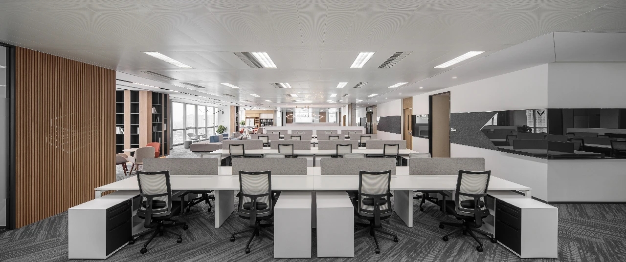 与此前的18层办公室相比,14层空间在用色与VI的表达上彼此呼应着,依旧延续着现代简约的黑、白、灰、木色的色彩搭配,并缀以局部VI色提升,只是此次更新在同色系的明度选取上会更为轻盈温柔一些。且我们在VIP室、办公室等区域加入了许多木制元素,这些天然大方的材料亦会使得空间质感随时间推移而生发出另一番韵味。