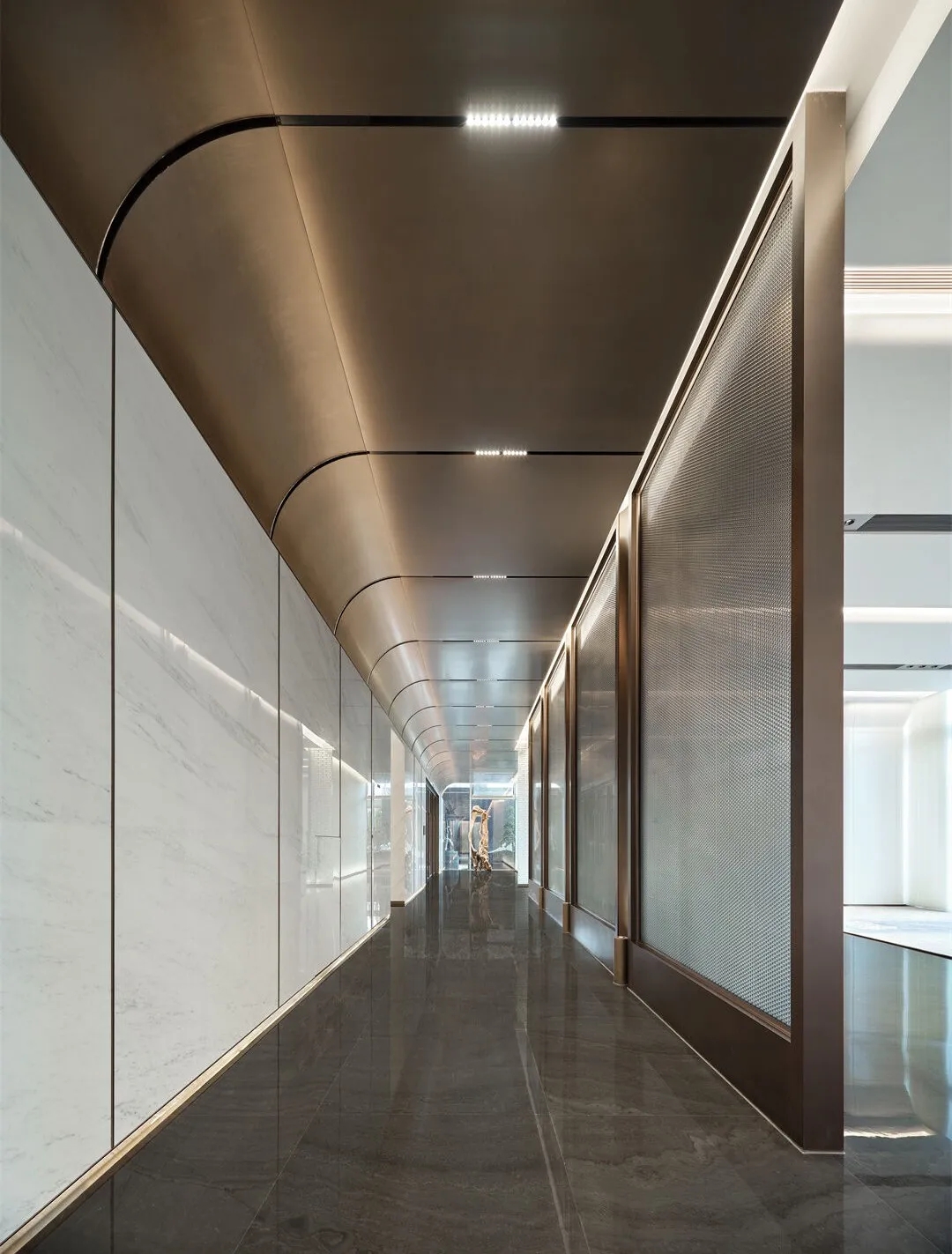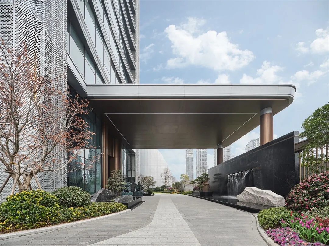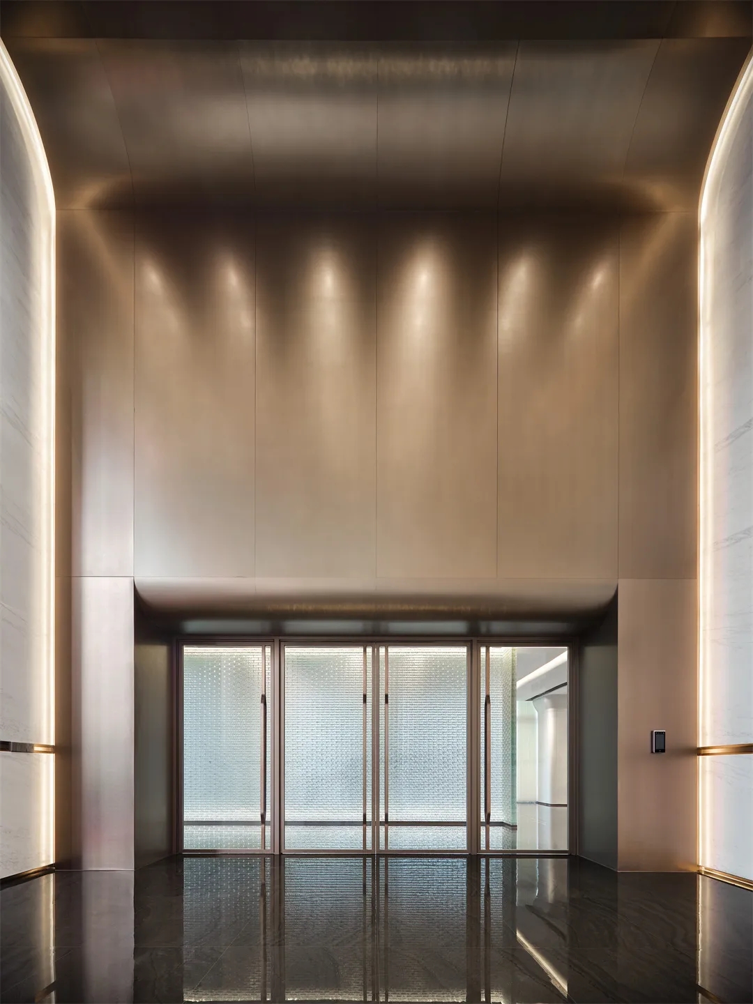 在这片由金属主导的天地中,大理石以其独特的纹理和温润的光泽,成为了空间中的点睛之笔。恢弘大气的入口,搭配门廊两侧,高大的金属柱子巍峨耸立,反射着柔和的光芒,与周围的环境融为一体。