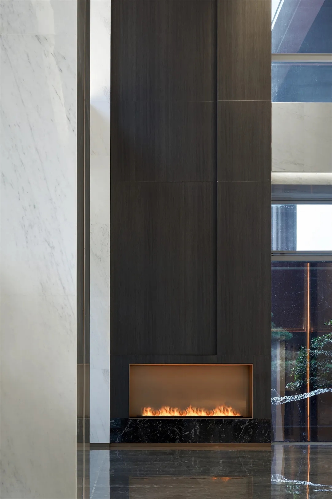 仿真壁炉作为大堂的一大亮点,被巧妙地嵌入到木饰面与大理石的交接处,仿佛是从大自然中精心雕琢而来。它静静地燃烧着,散发出温馨的光芒,为整个空间带来了一抹温暖的色彩。