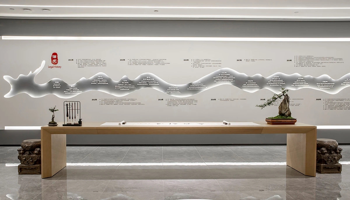 律所的核心价值观“爱与创造”融入空间细节中,律史墙恍如从时间长河飞遁而来的一条远古巨龙。“道法自然”﹑“法天象地”。东方哲学从庄子的“有实而无乎处者,宇也;有长而无本剽者,宙也。”到佛法里的“诸法相续迁流,刹那生灭之分位者,假立为时。这是阐述时间的真相和本质,这是“无造作,无是非,无取舍,无断常,无凡无圣。经云:非凡夫行,非圣贤行,是菩萨行”,去除目的、欲望、造作,去除一切分别见,就连成圣成佛的欲望也去除,平常心是平等一禅心,是诸法平等的真正落实。