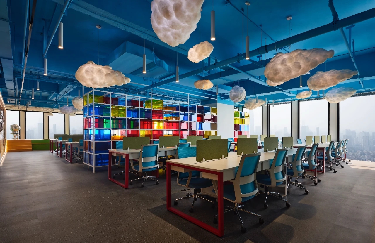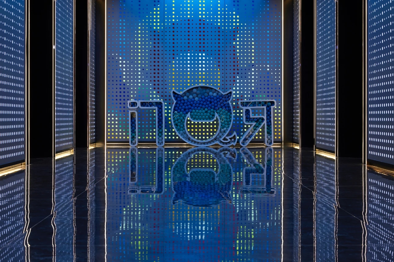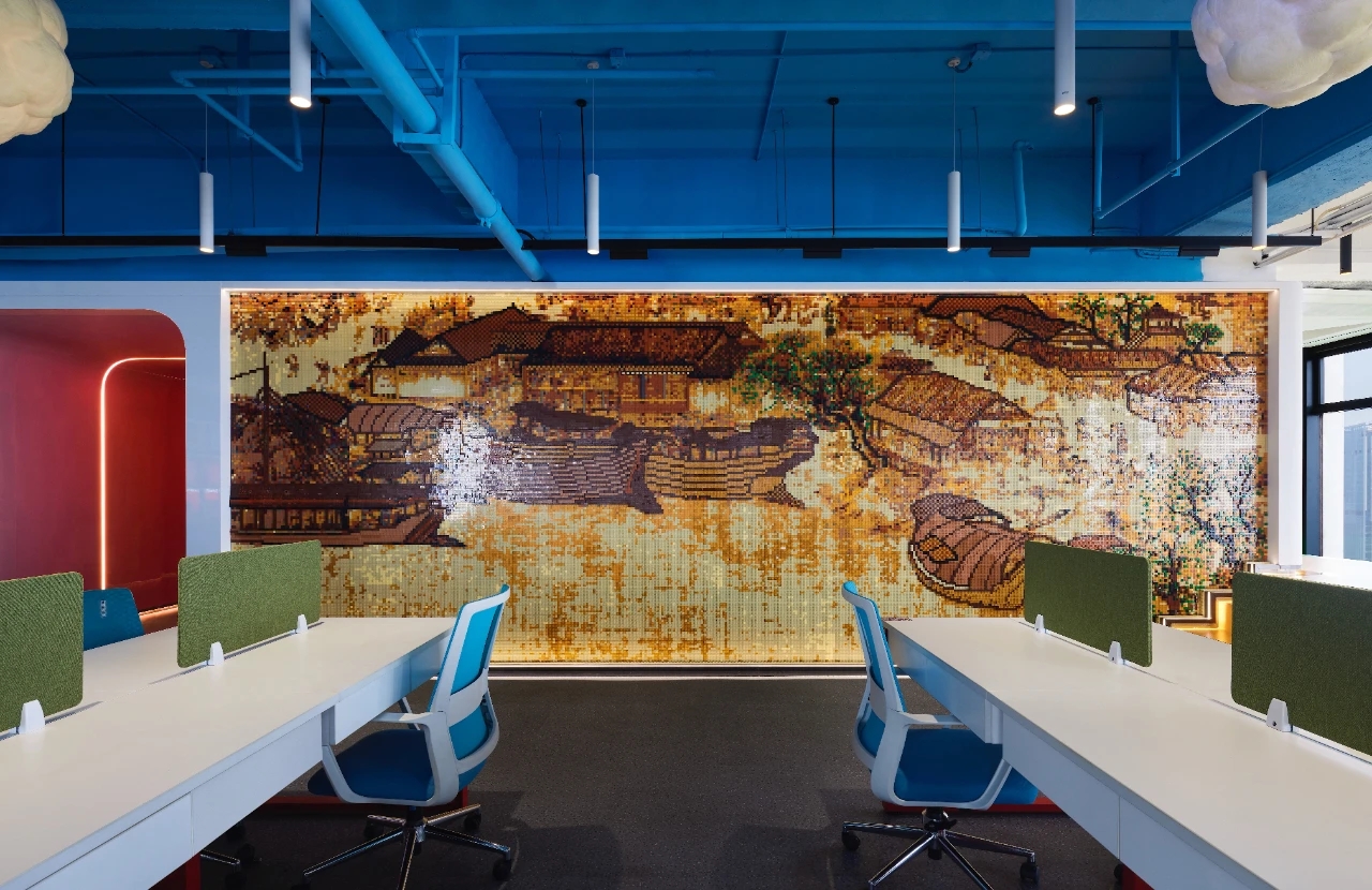 采用积木元素,颠覆性地运用500万粒积木颗粒,对中华艺术瑰宝进行二次创造,在空间中讲述传统文化故事,营造出兼具国潮韵味和风尚LOOK的办公环境。