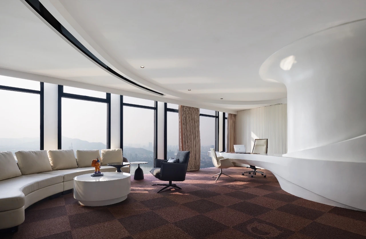积木不仅是空间的亮点,也是动线的导引。玉兔奔月紧邻的,便是总裁办公室,拥有良好的采光和优美的室内风景。整体空间以白色为主,突出漆面光亮的质感,与窗外的自然景观相得益彰。宽大舒适的弧形沙发,显示主人的热情与亲切。