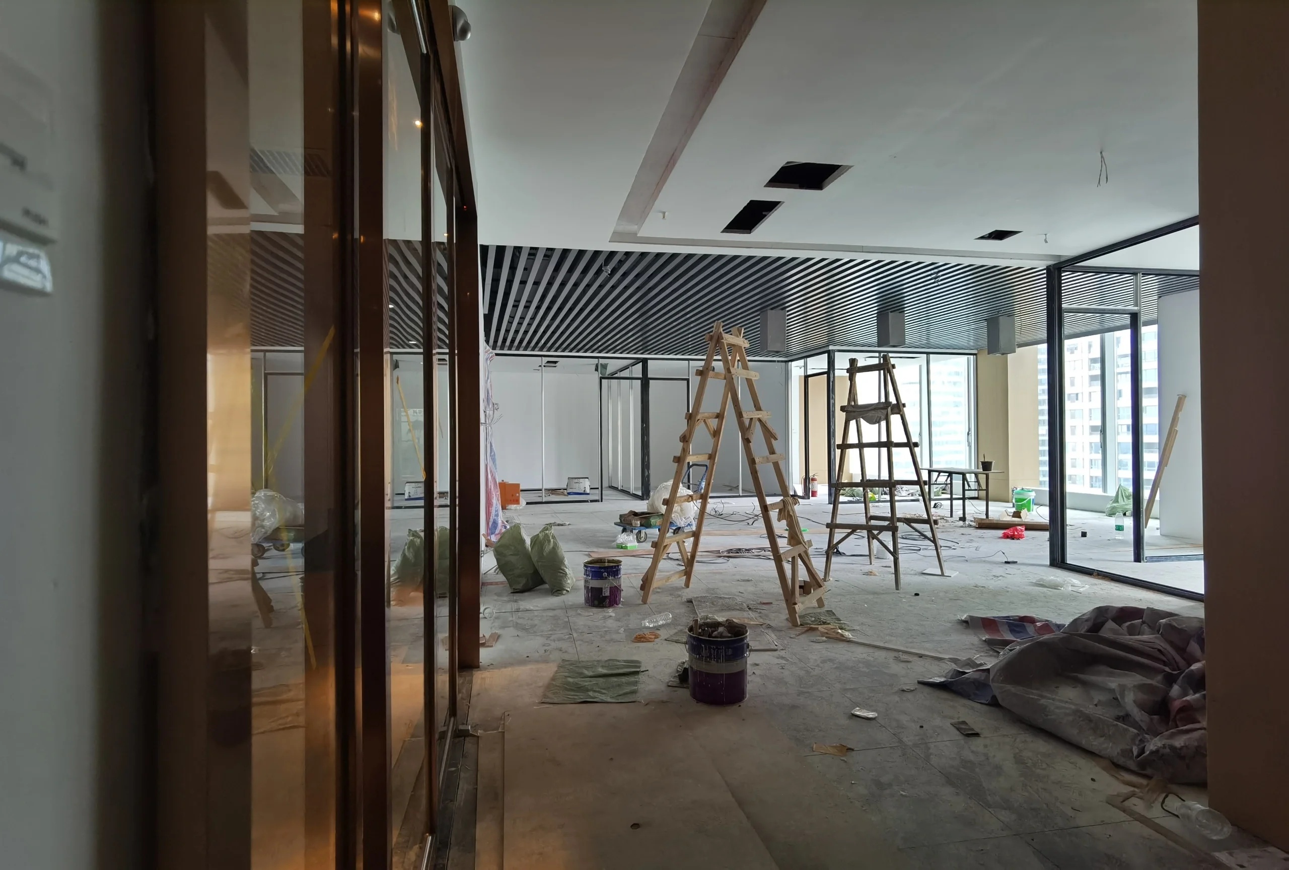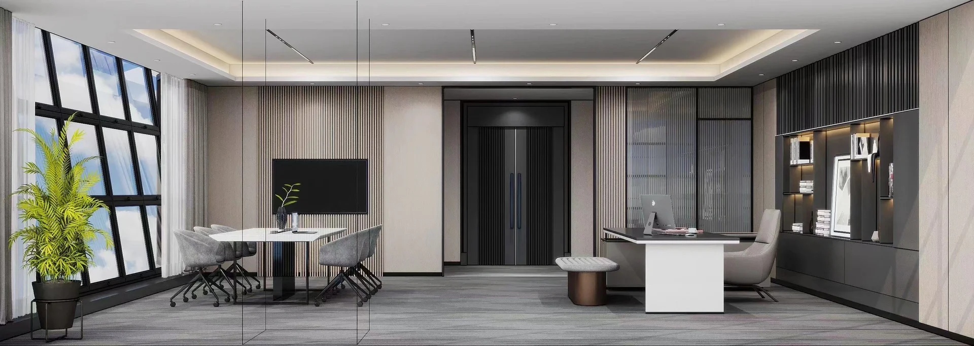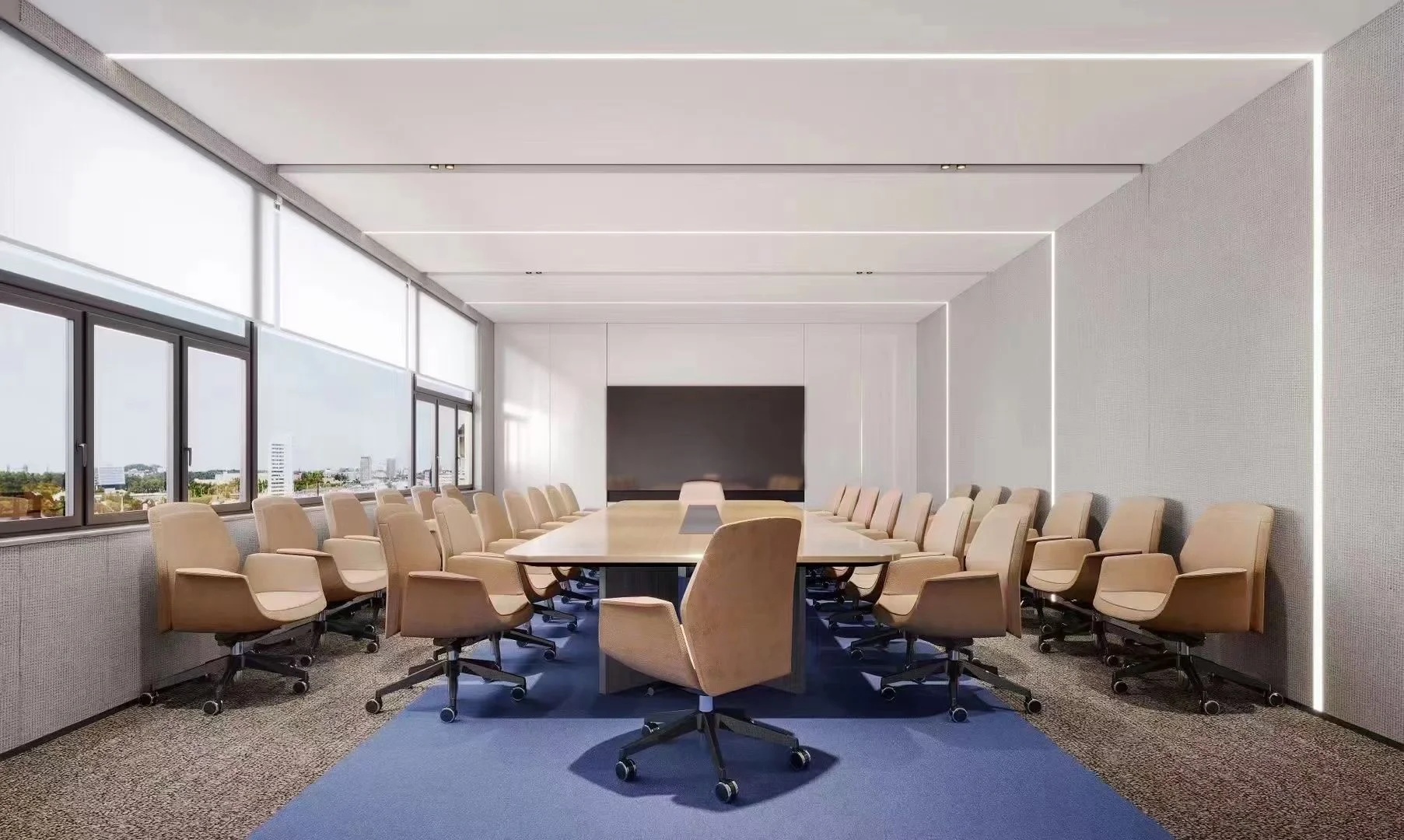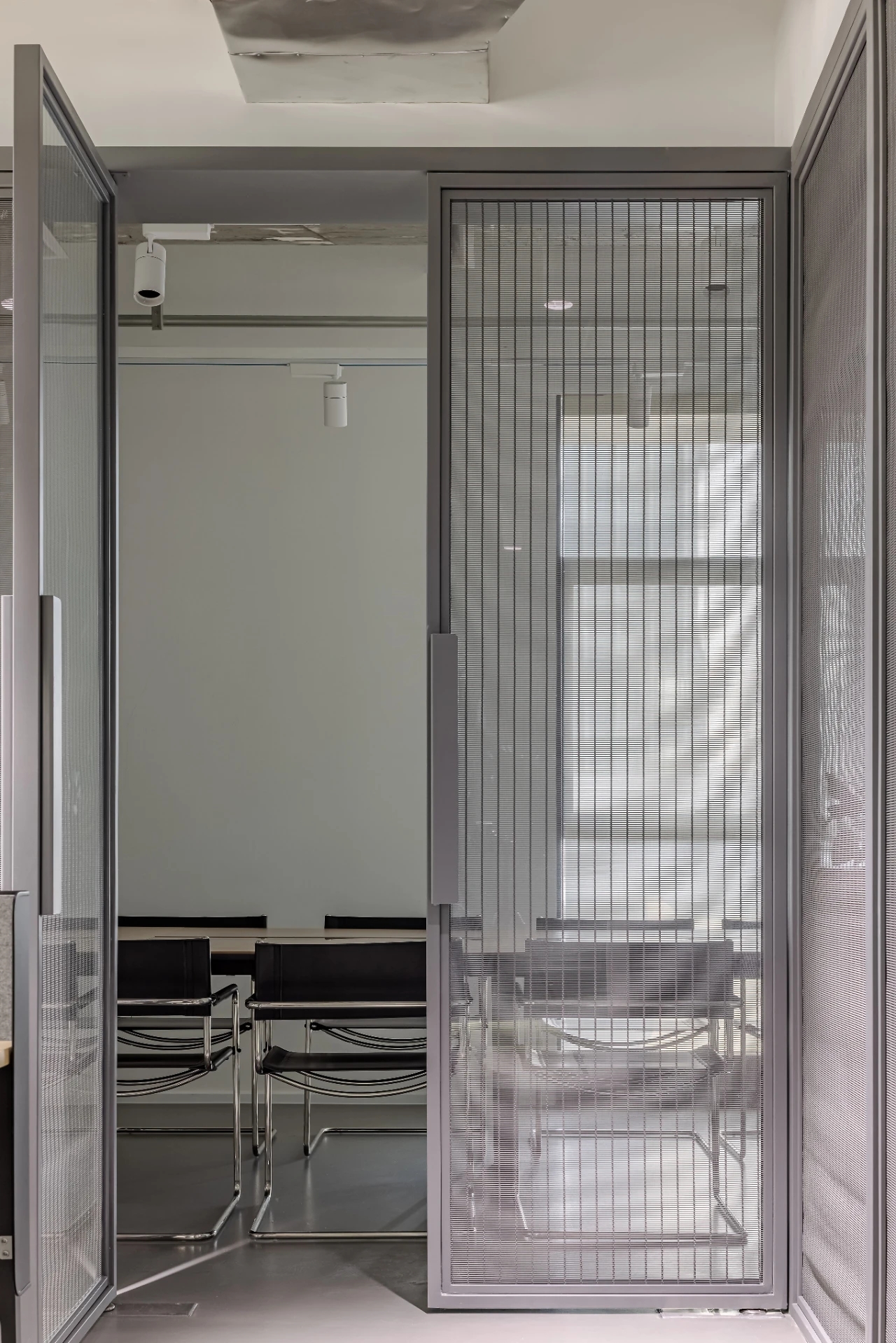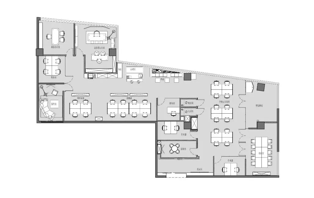 空间定位以开放性为主,在保证办公区最大限度的开放之下,设计使其他功能区块均匀分布,工作环境显得更紧密。橄榄色的家具,在粗犷锐利的裸露工业感空间里,铺陈出独特的氛围,细节严谨而颇具活力。场所的原始感与陈设的内敛碰撞出丰富的空间表情。点缀性的装饰画与绿植则赋予空间舒适的观感,与整体有序的空间达成平衡。空间整体布局中,设计在不规则的场地上,着重营造出中轴序列,从而提高办公空间的通达性与功能性。动线联通的两块办公区域,也利用动线的递进,将功能连贯地置入。