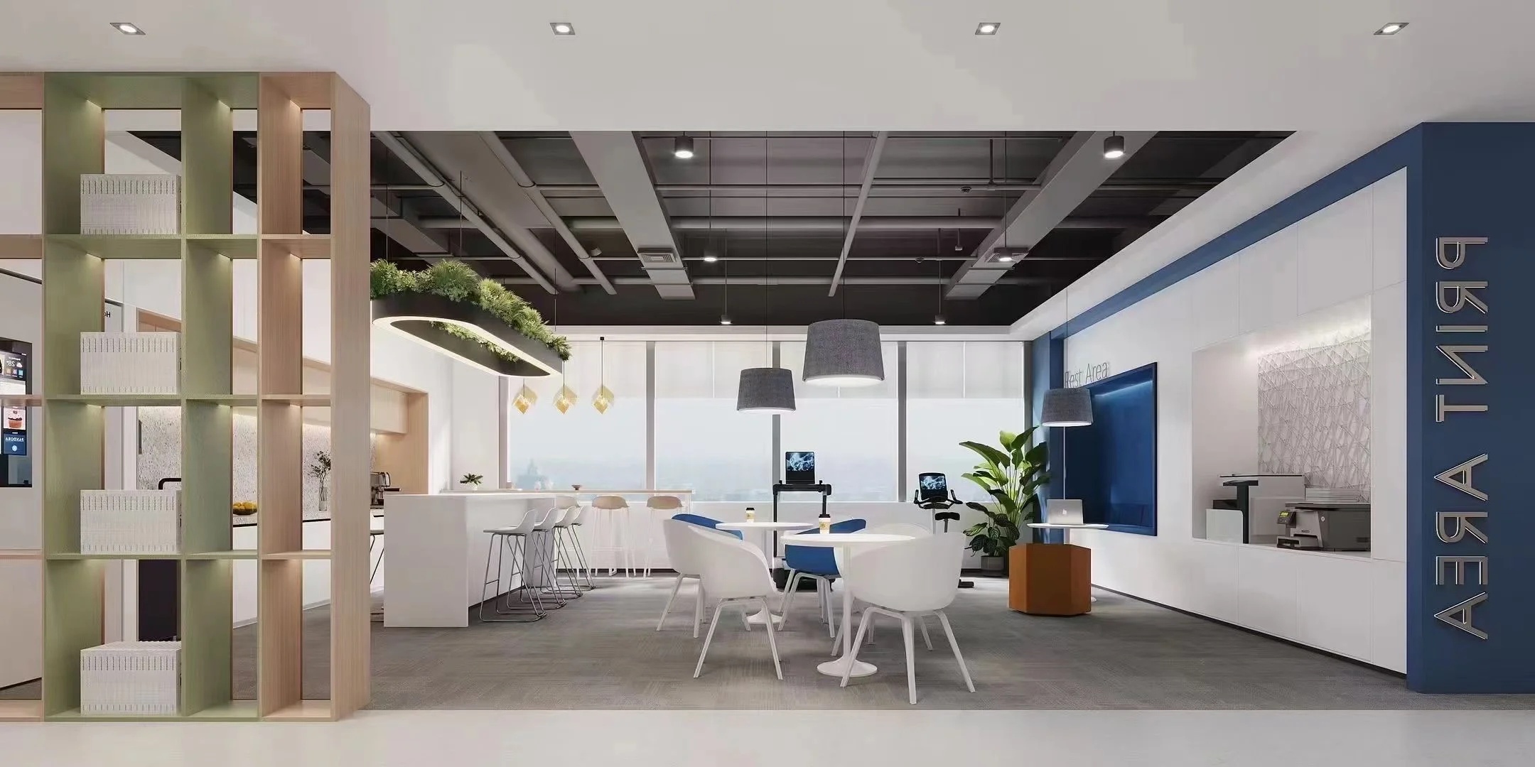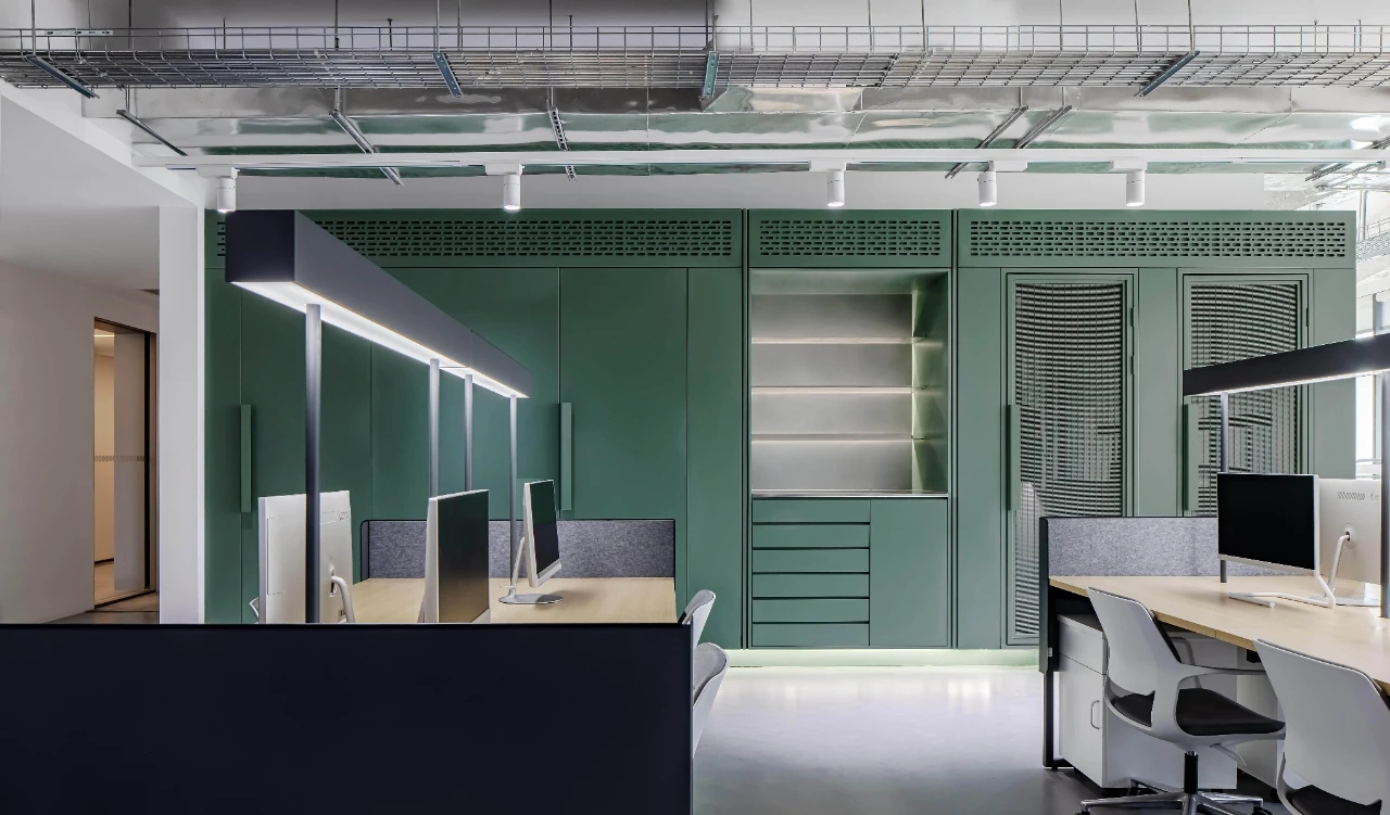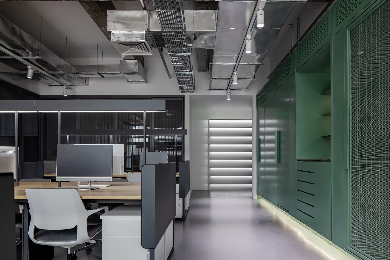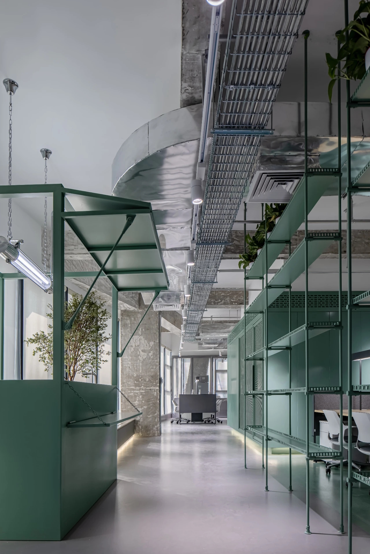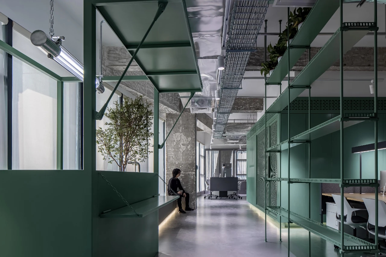 大面积的办公区域难免会显得单调,于是设计在工作桌中增添了一些创意细节。沿长桌两端设置的围挡采用特殊材质,可拆装的靠内饰面为随贴的便签贴纸提供便捷,增强了办公桌的功能性。靠外的面板是磨砂银灰材质,易于清理维护,且迎合办公区的工作场景。空间开放休憩区域置入了街面店铺式的室内装置,再搭配同色系的置物陈列架,使得这抹橄榄绿成为空间中视觉活跃的存在。环境的整体氛围,被一些反秩序性的空间元素增强了其连贯性。