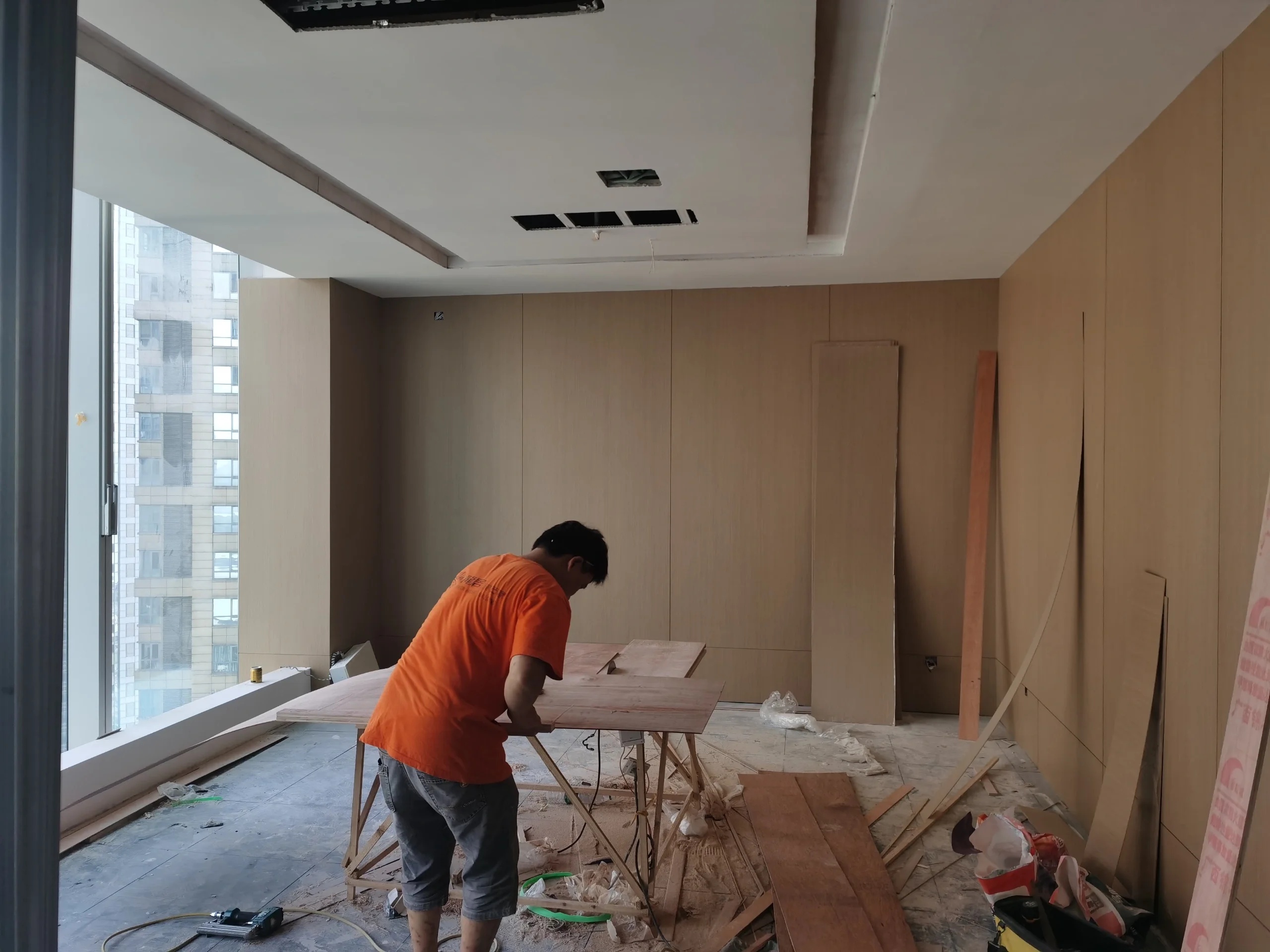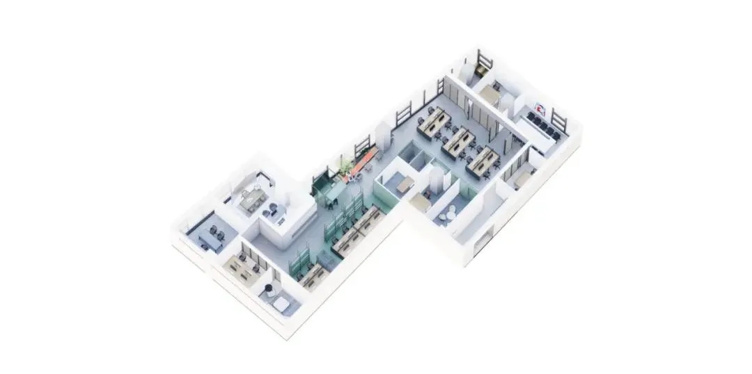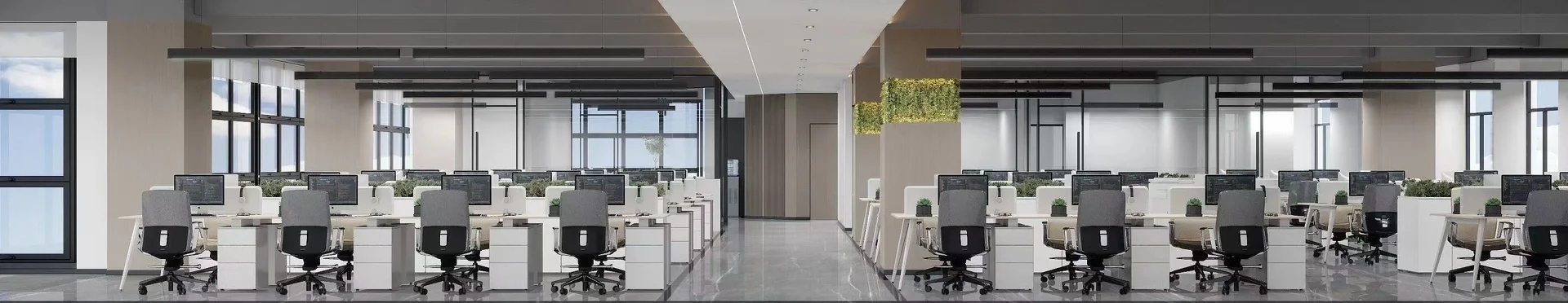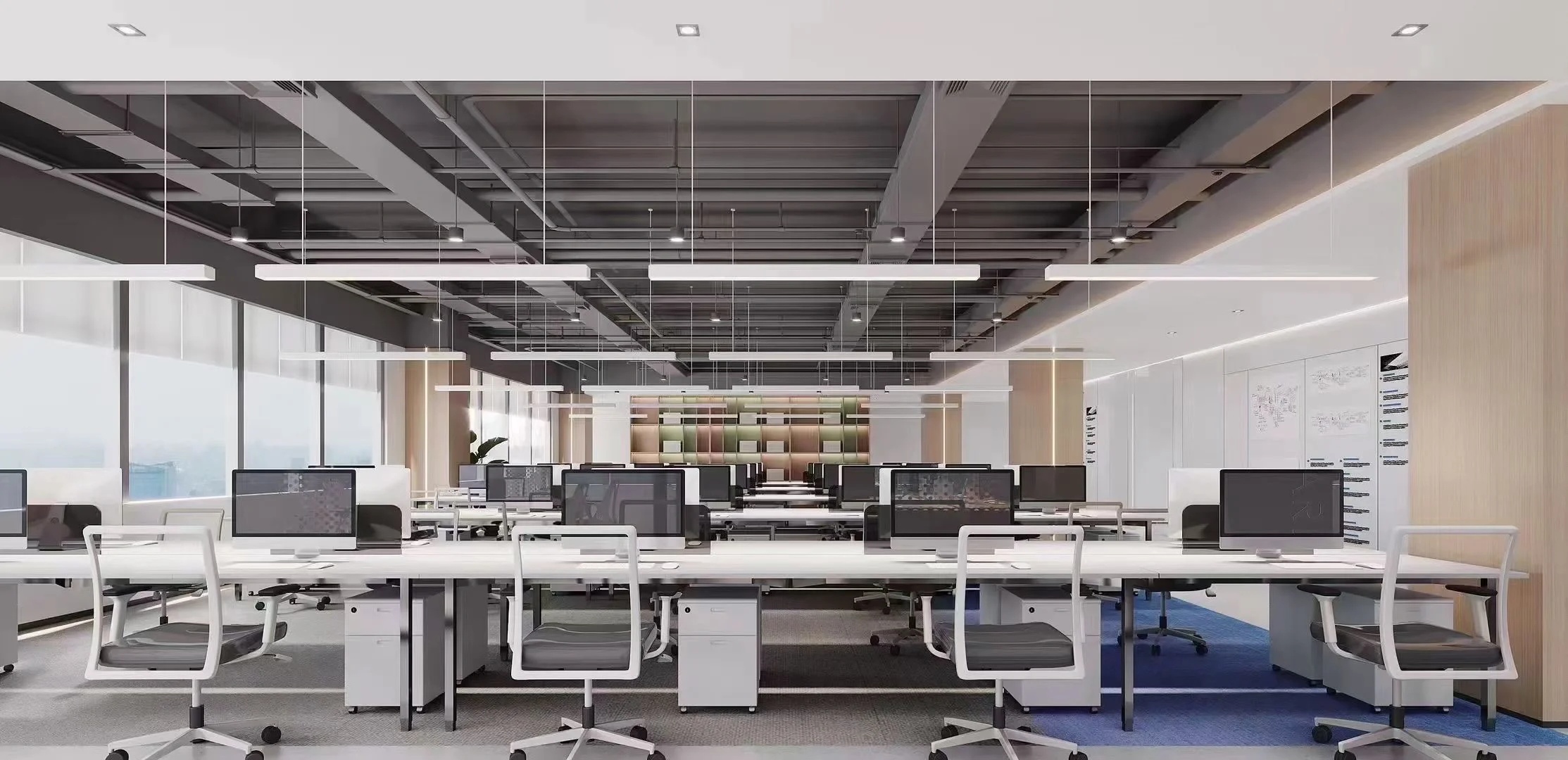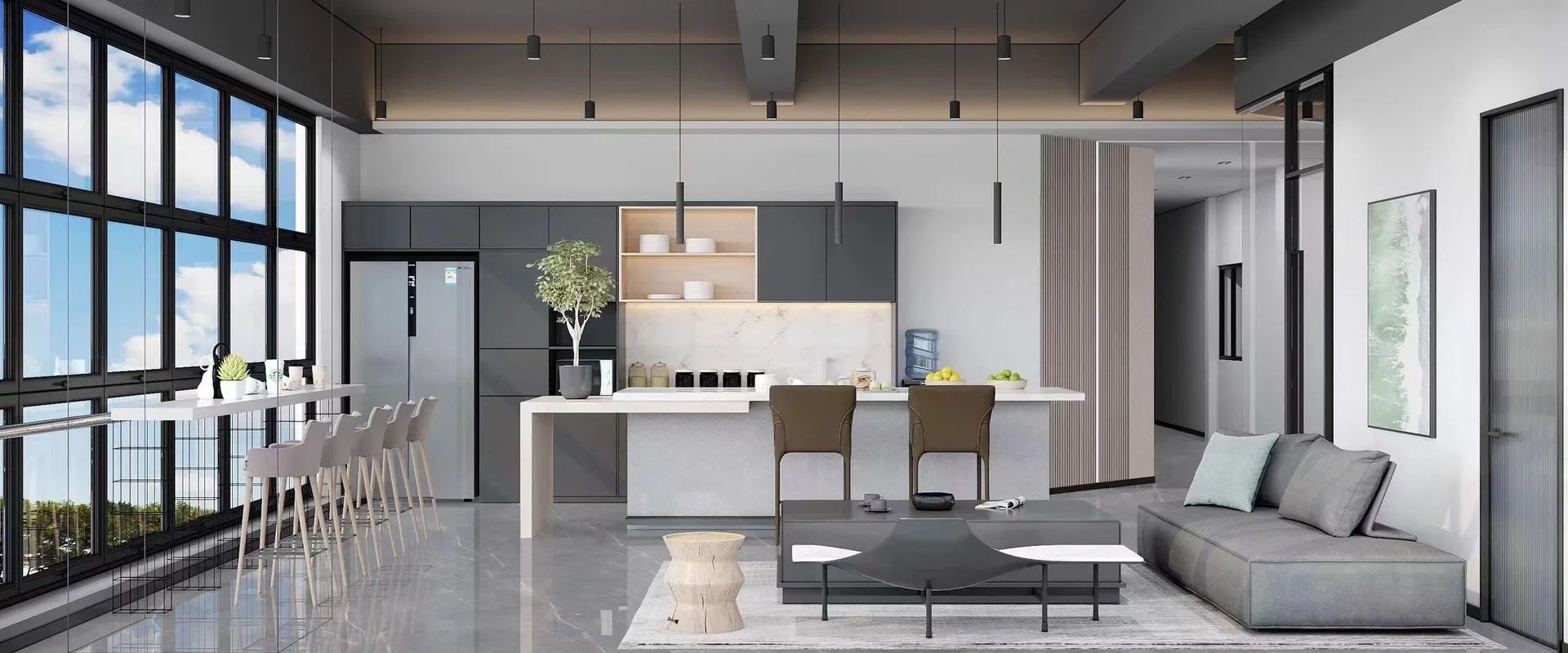 大面积的办公区域难免会显得单调,于是设计在工作桌中增添了一些创意细节。沿长桌两端设置的围挡采用特殊材质,可拆装的靠内饰面为随贴的便签贴纸提供便捷,增强了办公桌的功能性。靠外的面板是磨砂银灰材质,易于清理维护,且迎合办公区的工作场景。空间开放休憩区域置入了街面店铺式的室内装置,再搭配同色系的置物陈列架,使得这抹橄榄绿成为空间中视觉活跃的存在。环境的整体氛围,被一些反秩序性的空间元素增强了其连贯性。