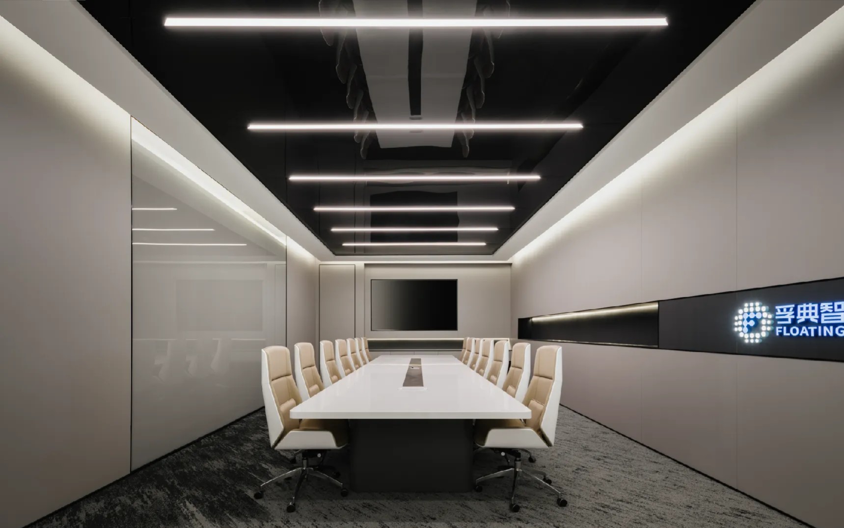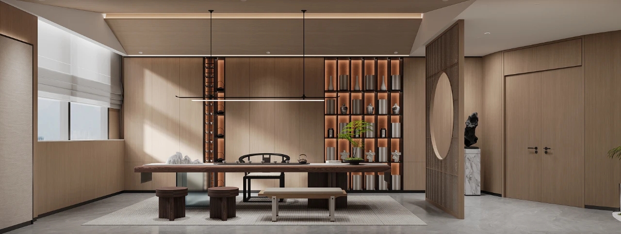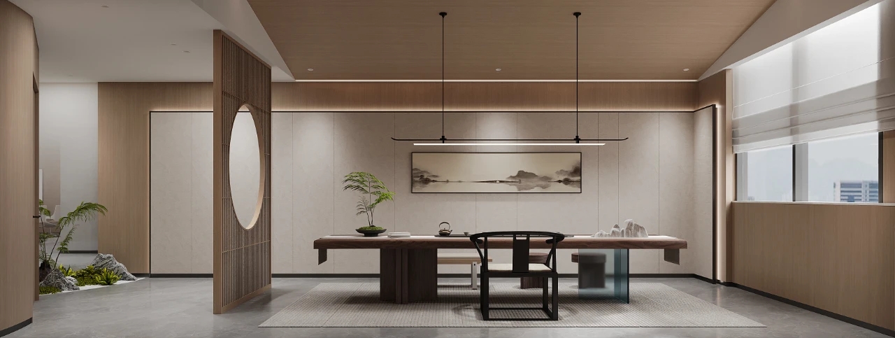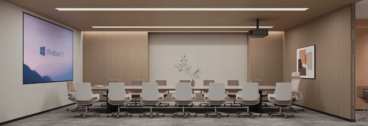 会议室的墙面大面积使用原木色的木饰面作为装饰,灯带的修饰,绿植的陪衬,营造出安闲,轻柔独具匠心的氛围感。
