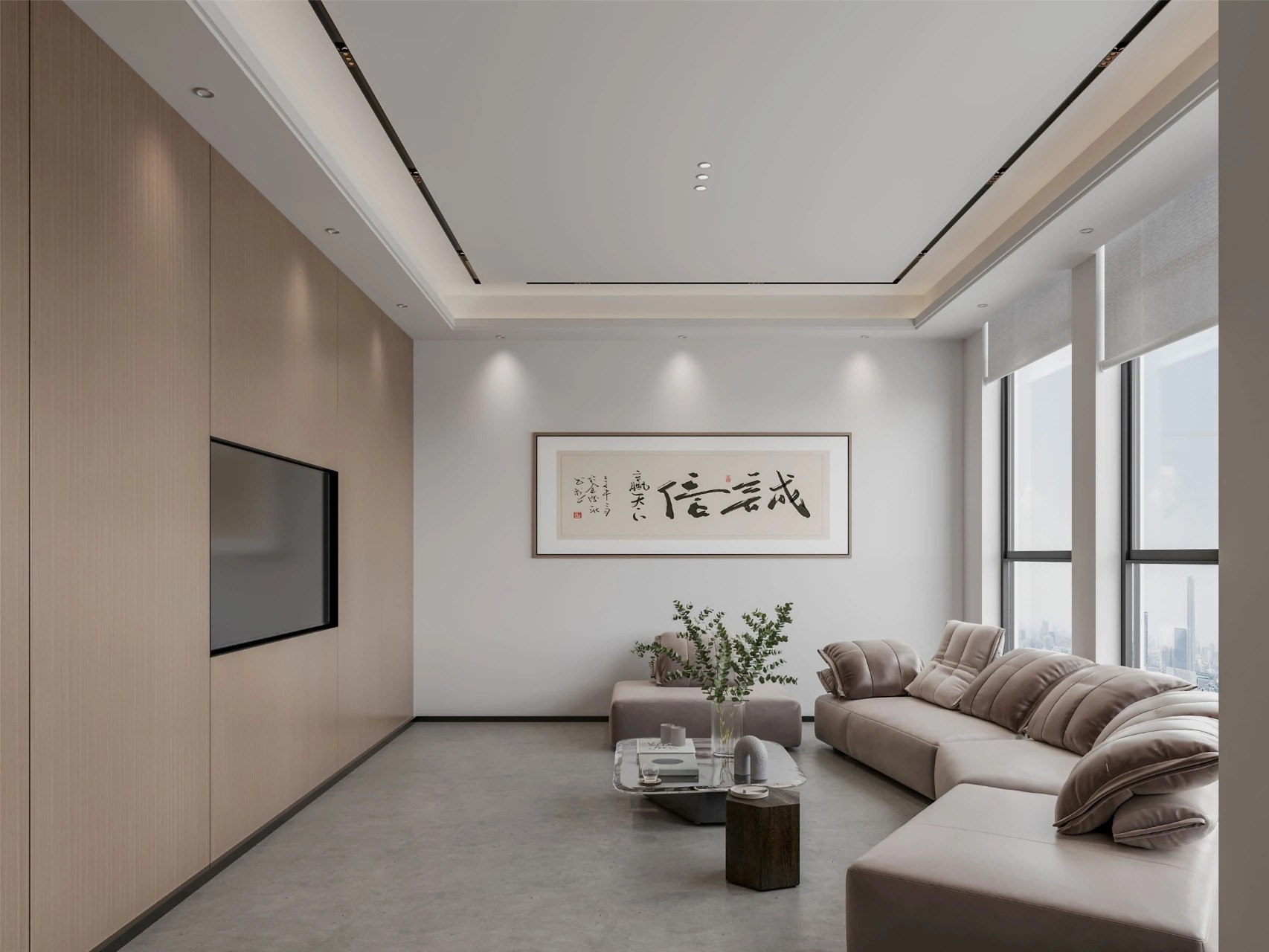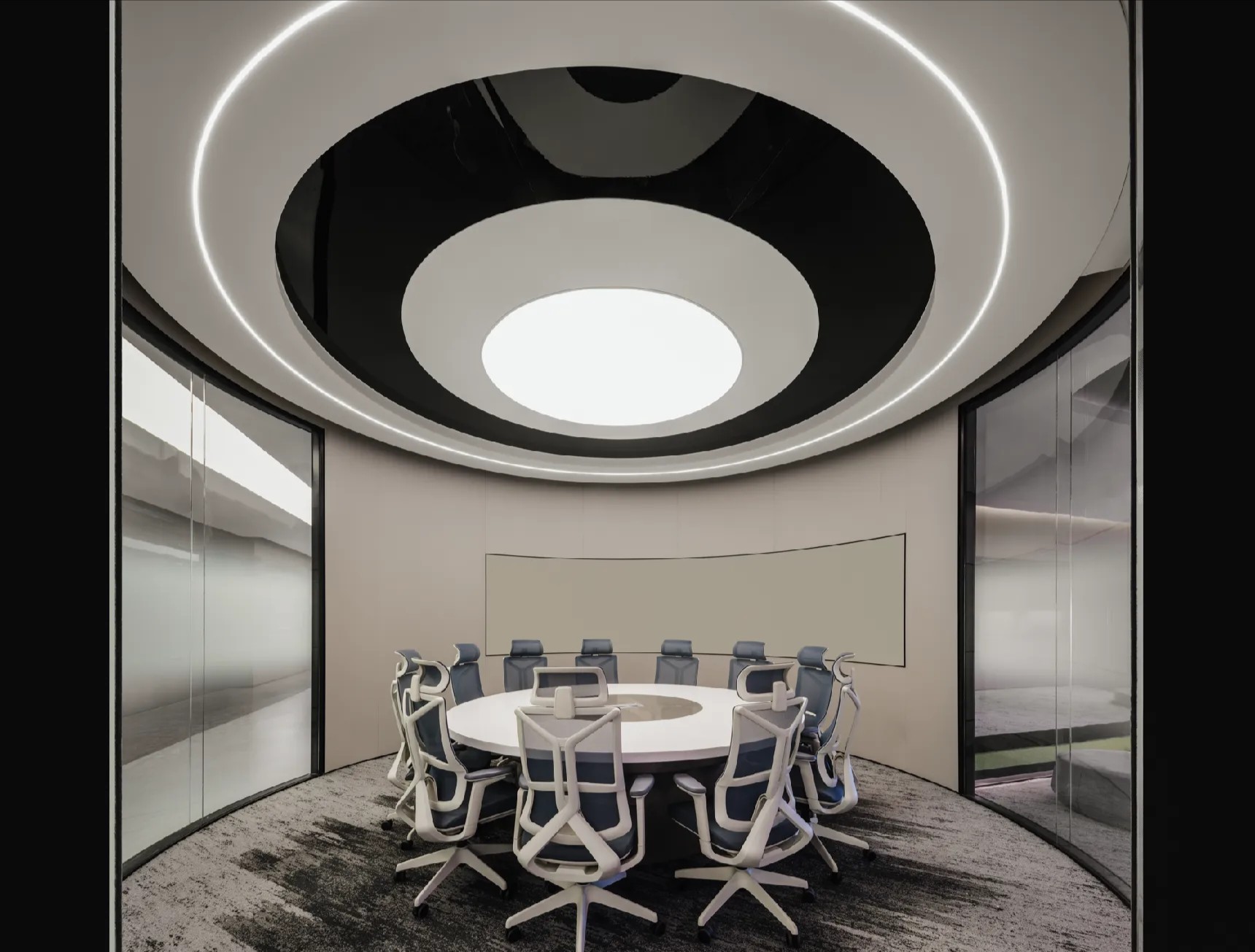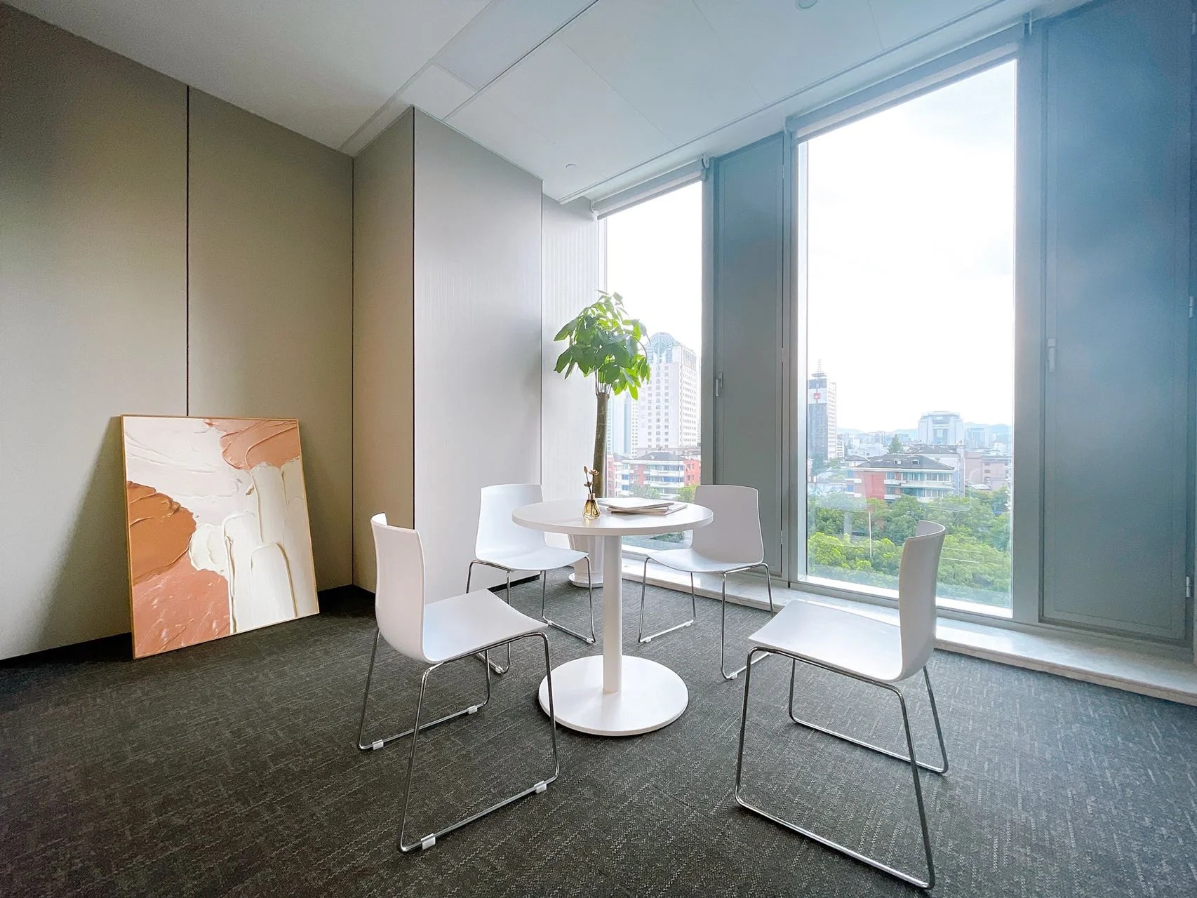 会议室的墙面大面积使用原木色的木饰面作为装饰,灯带的修饰,绿植的陪衬,营造出安闲,轻柔独具匠心的氛围感。