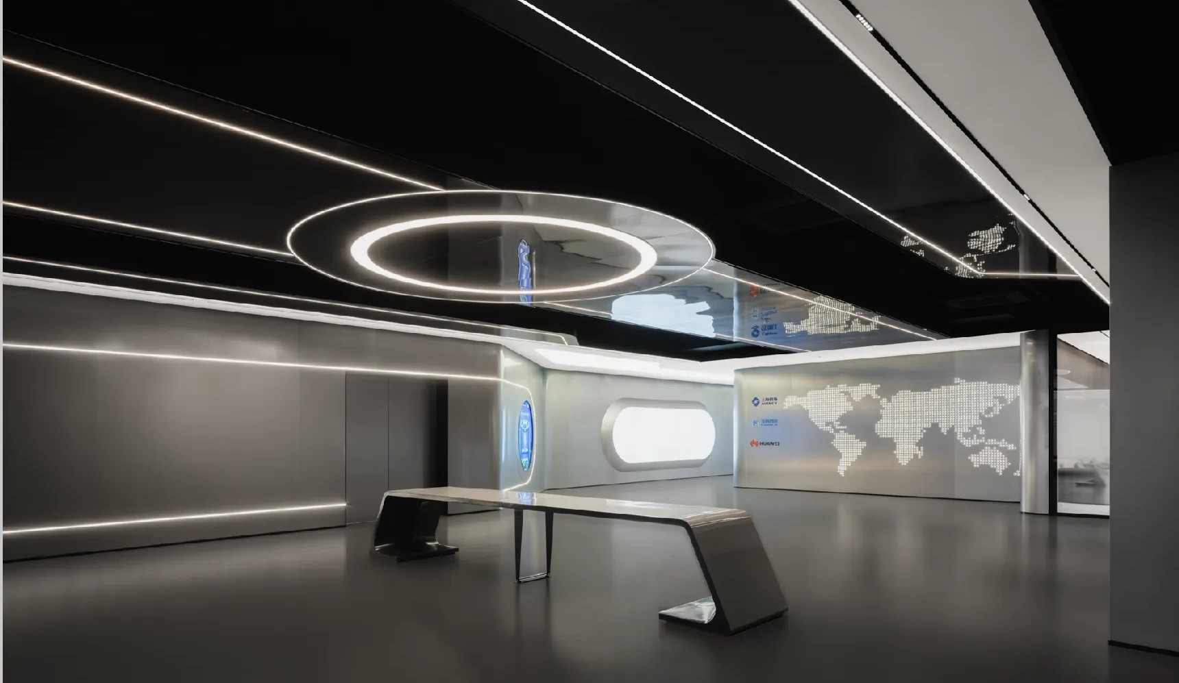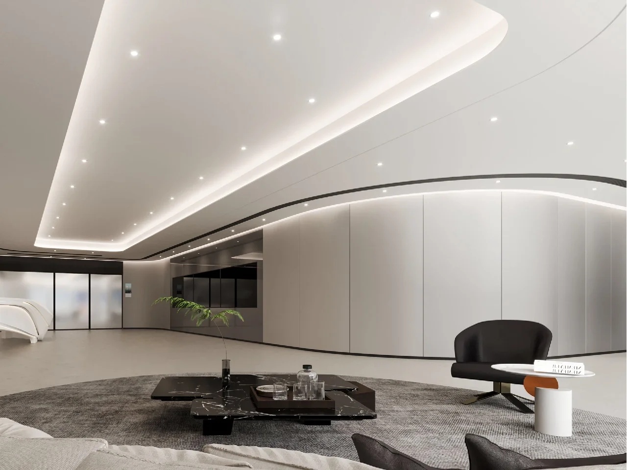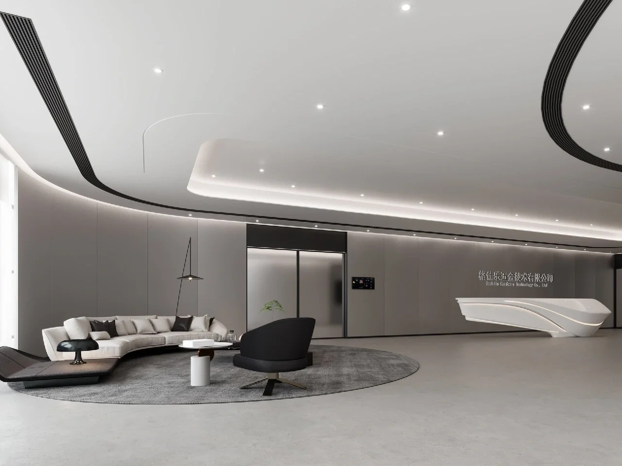 前台,以异形人造石为背景,大面积的留白直抒胸臆。点、线、面的光影组合,营造出极富纹理感和层次感的灯光氛围,与简约的形式质感相辅相成,墙面采用大量的弧形,有序,流动,使得有限的空间产生无限的视觉感受,延绵不绝。等待区用弧形半开放式的空间设计,增加了空间的趣味性。