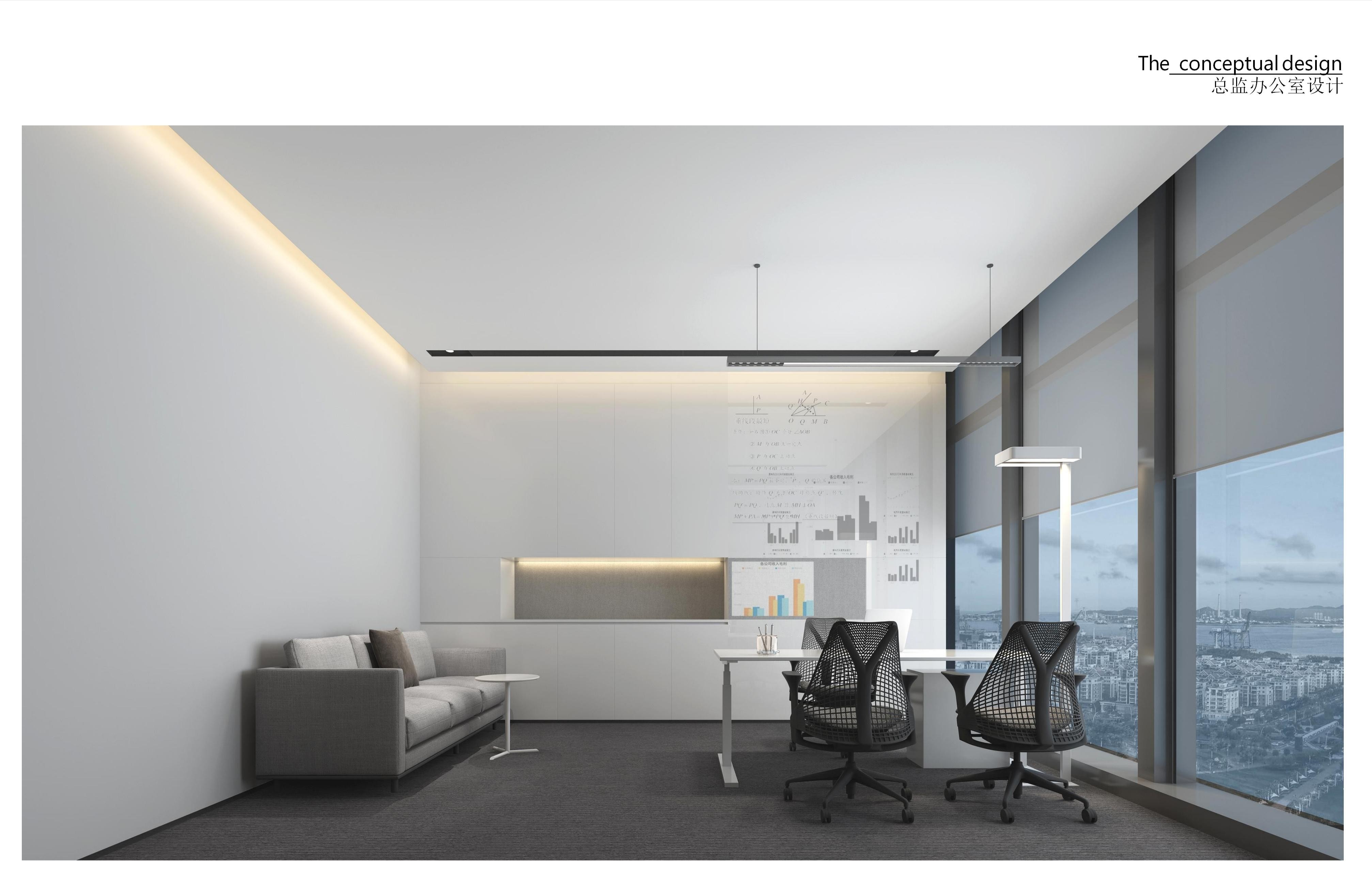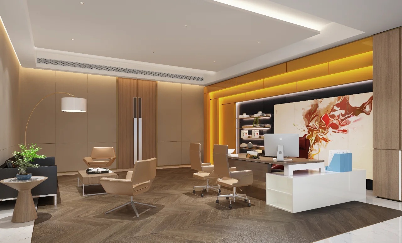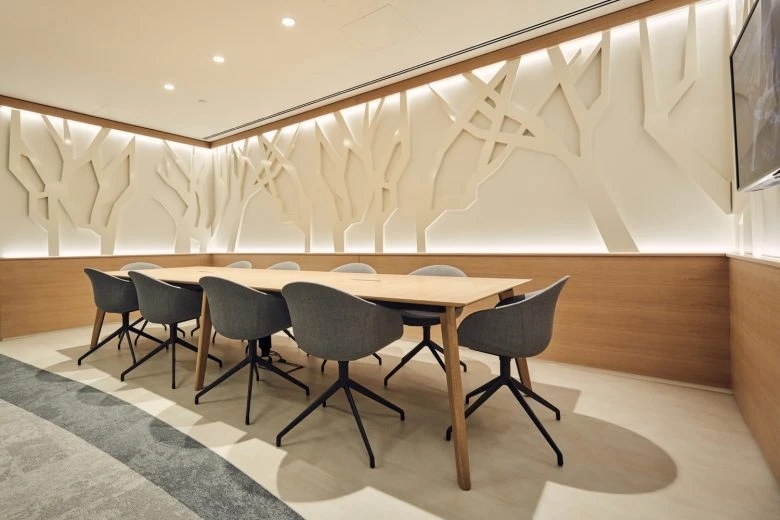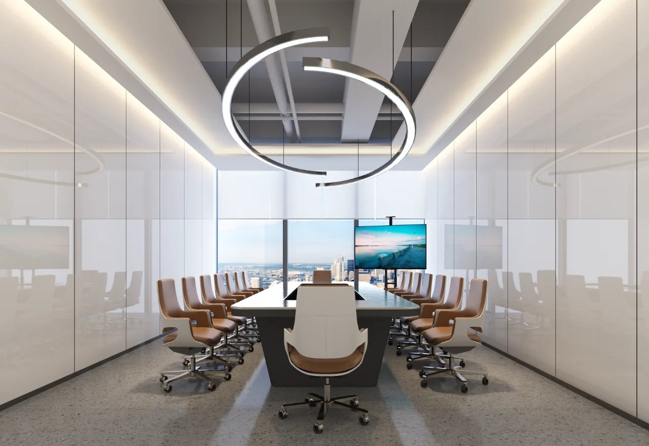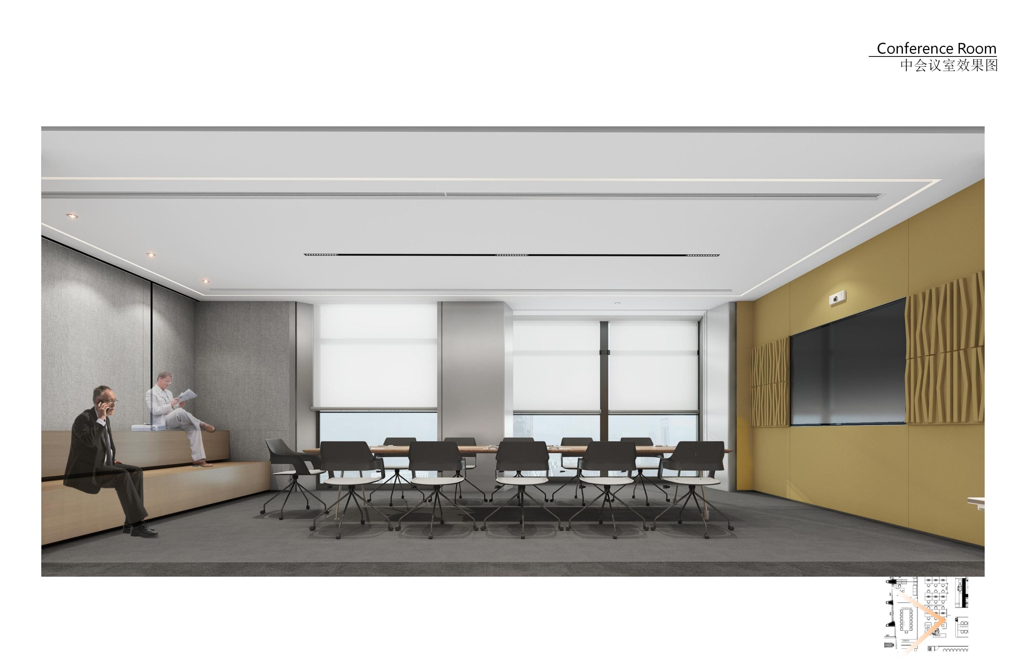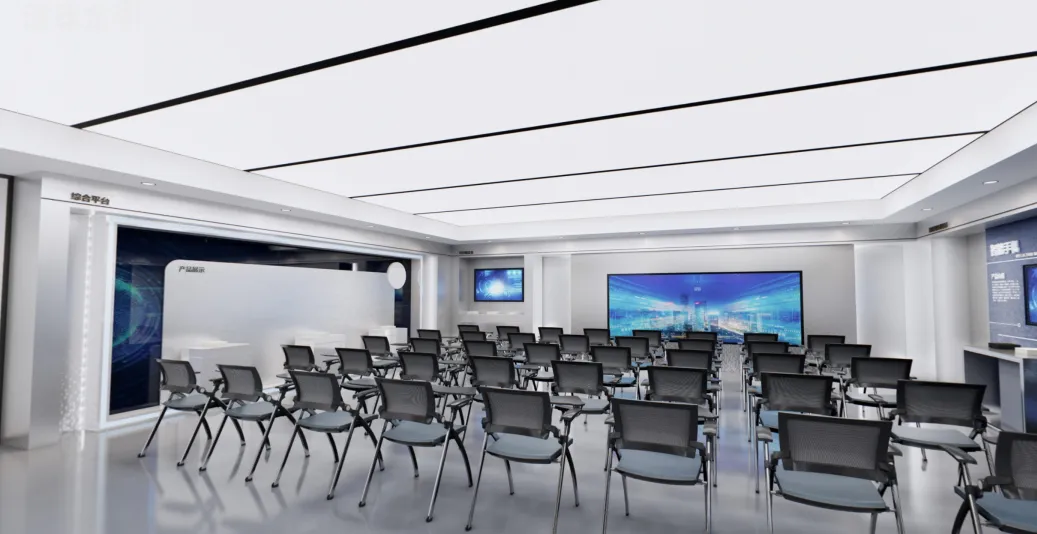 发布会厅兼大型会议厅实现了空间元素在视觉上的和谐统一,天花板保持干净裸露,以创造高度和空间灵活性,保证视野的宽阔,模糊并延伸空间的界限。顶部的线条节奏则呈现出沉稳严谨的理性场景。