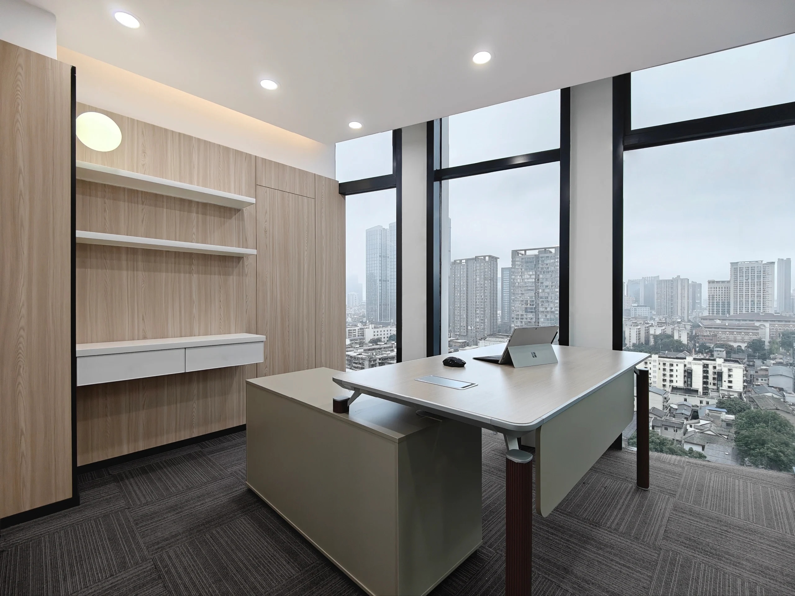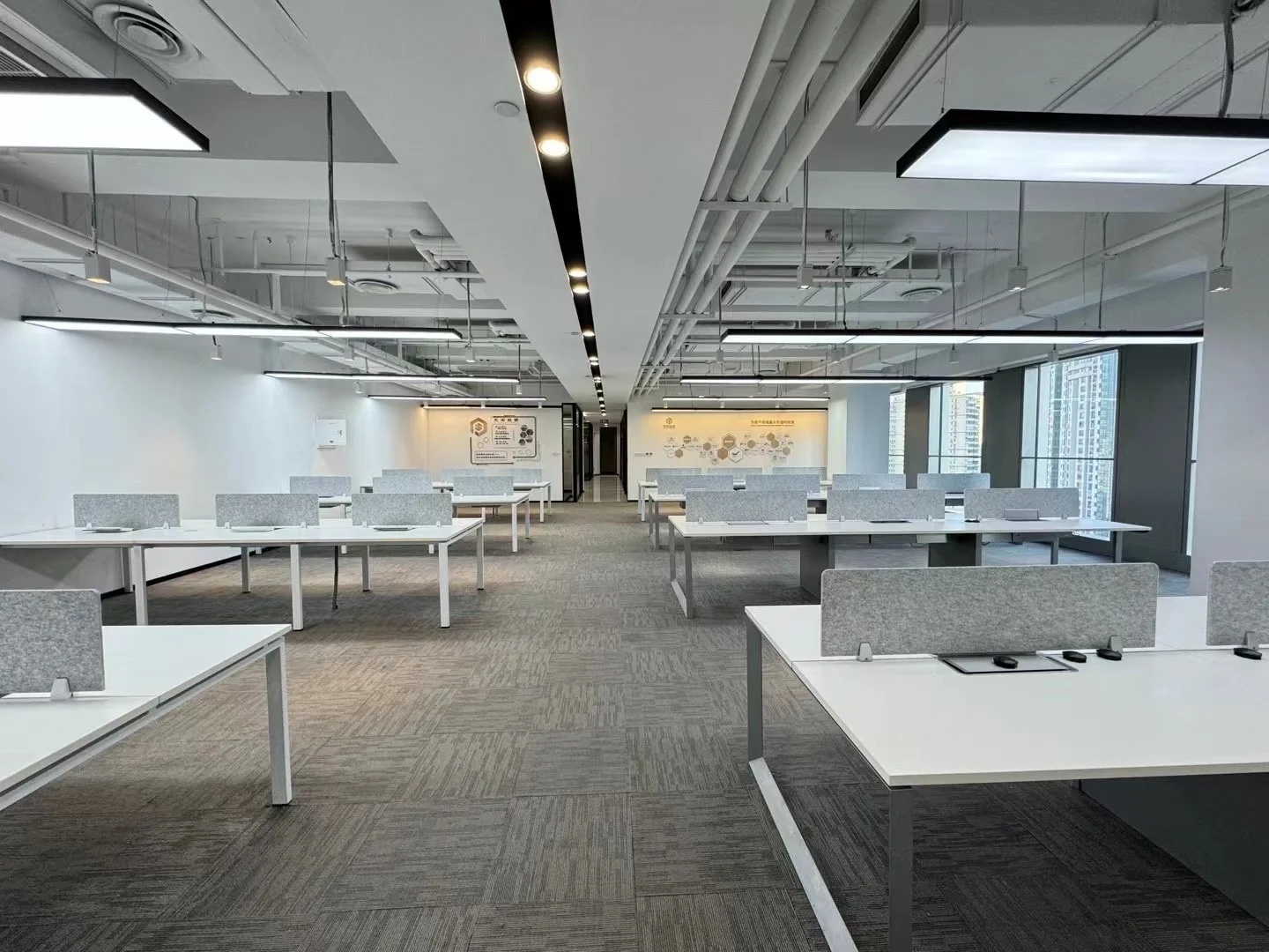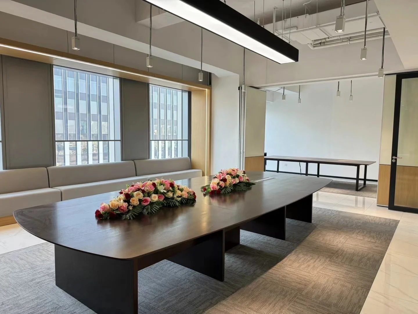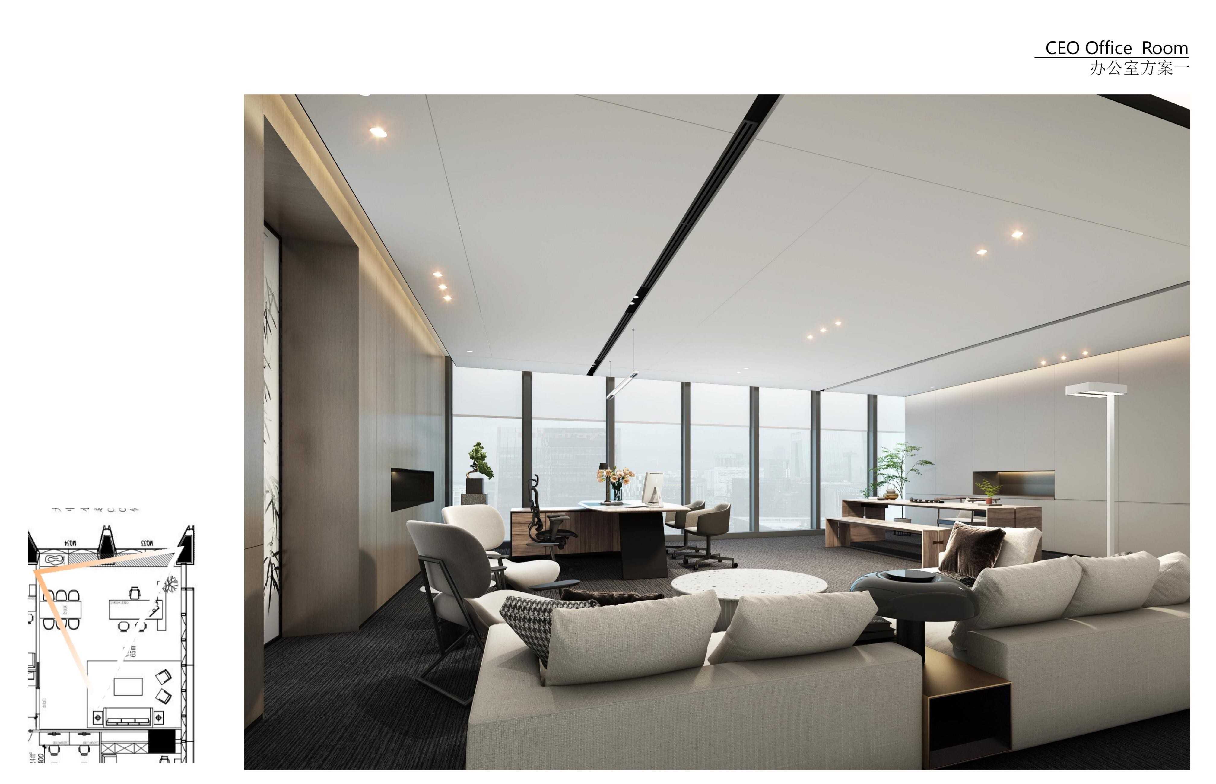 发布会厅兼大型会议厅实现了空间元素在视觉上的和谐统一,天花板保持干净裸露,以创造高度和空间灵活性,保证视野的宽阔,模糊并延伸空间的界限。顶部的线条节奏则呈现出沉稳严谨的理性场景。