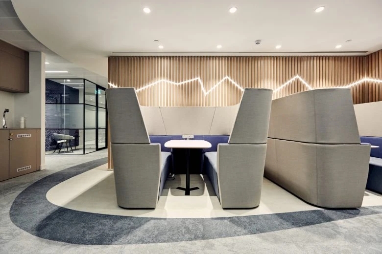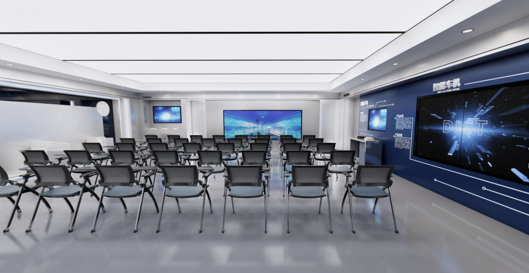 蓝色作为协会logo主题色,贯穿辐射整个空间,明亮的蓝色瞬间让空间活跃起来,突出重点,使蓝色部分成为空间视觉焦点,带给来访者科技化、未来感、力量感的鲜明印记。